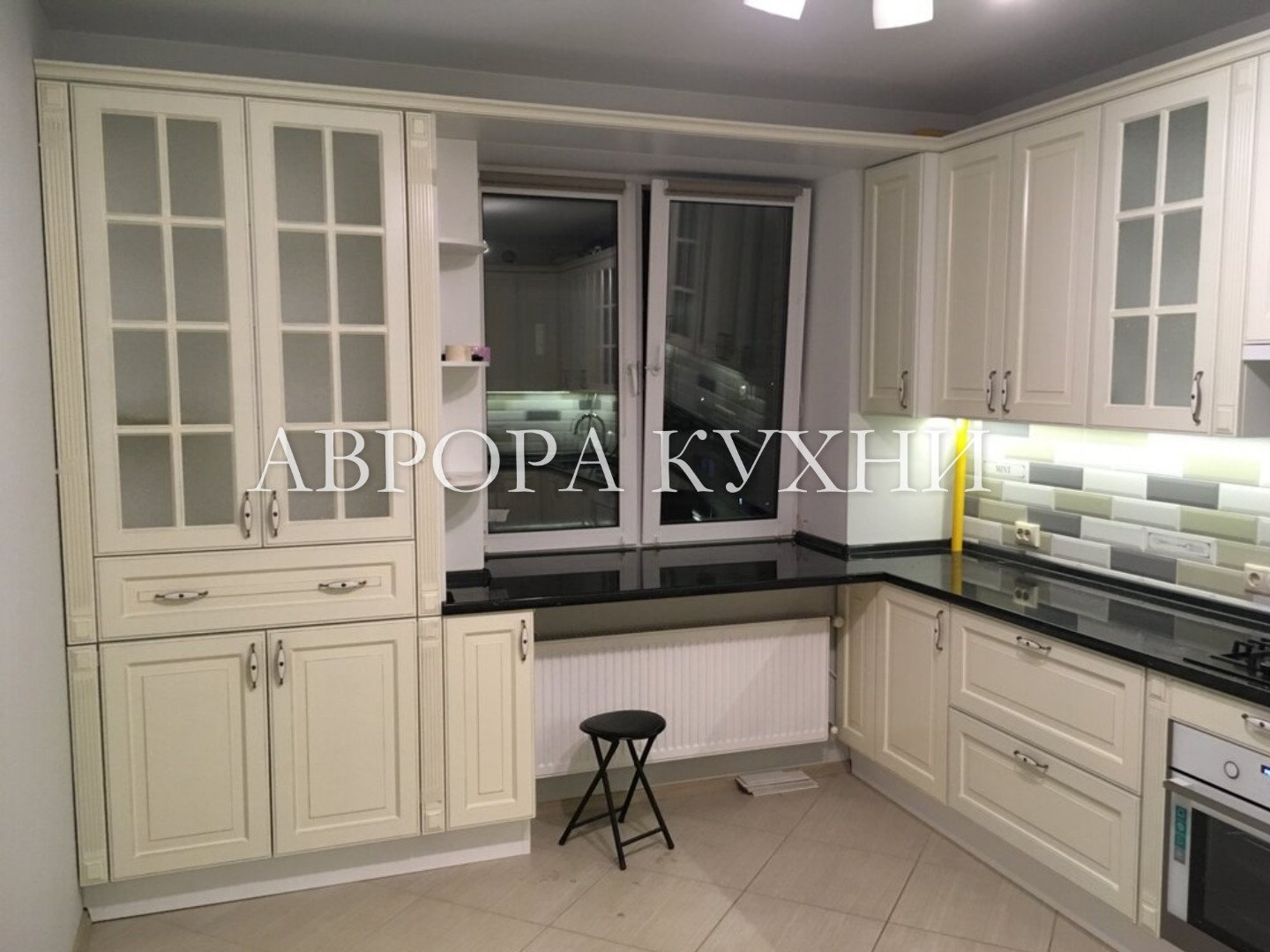 Угловая кухня с высокими шкафами