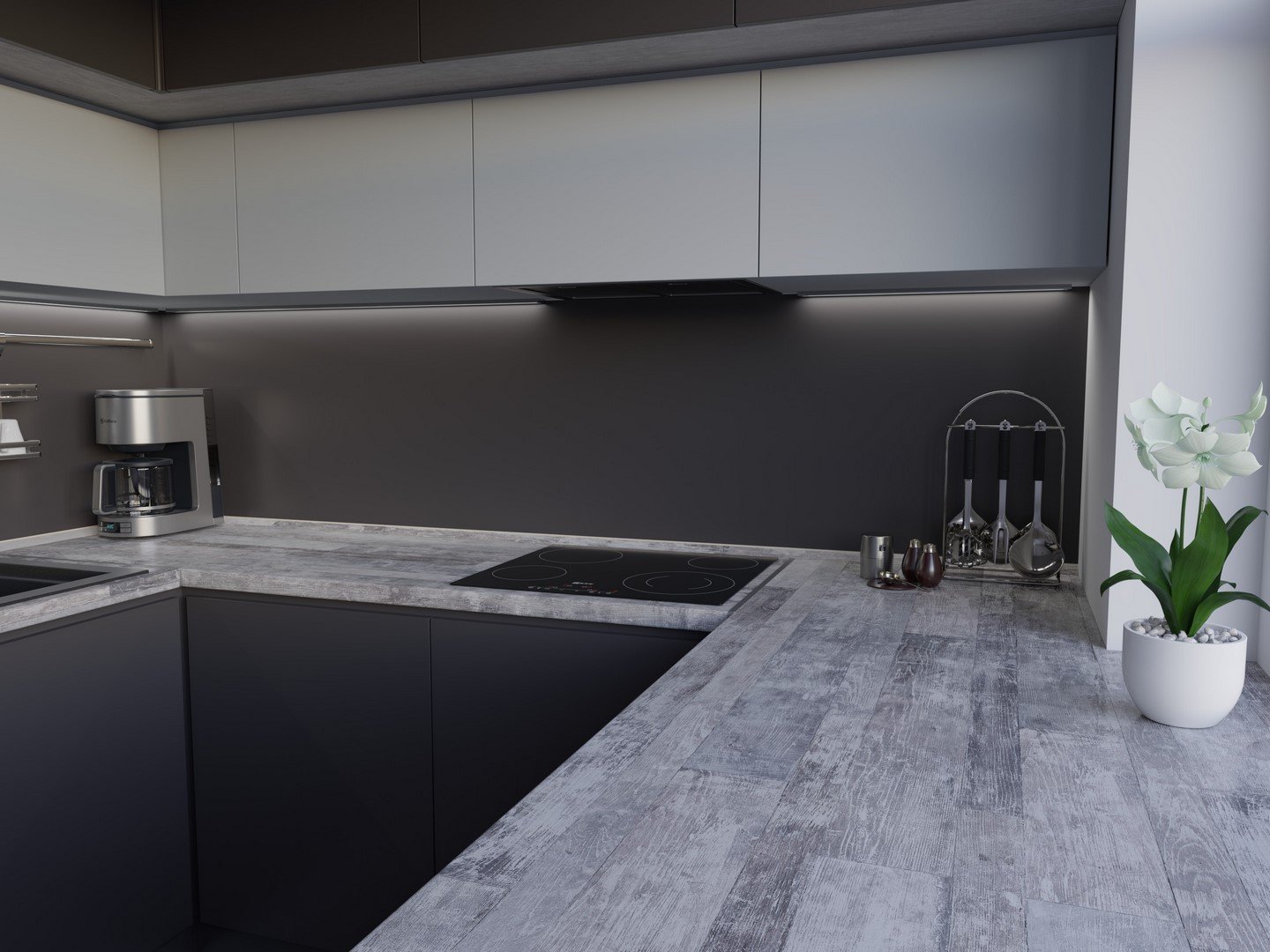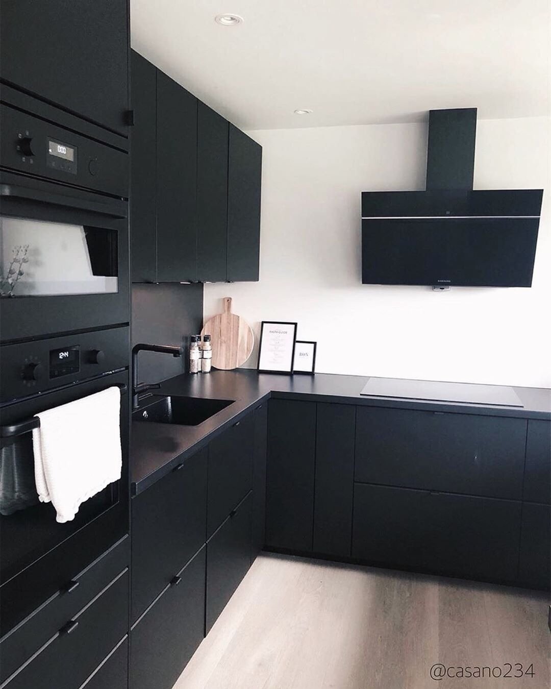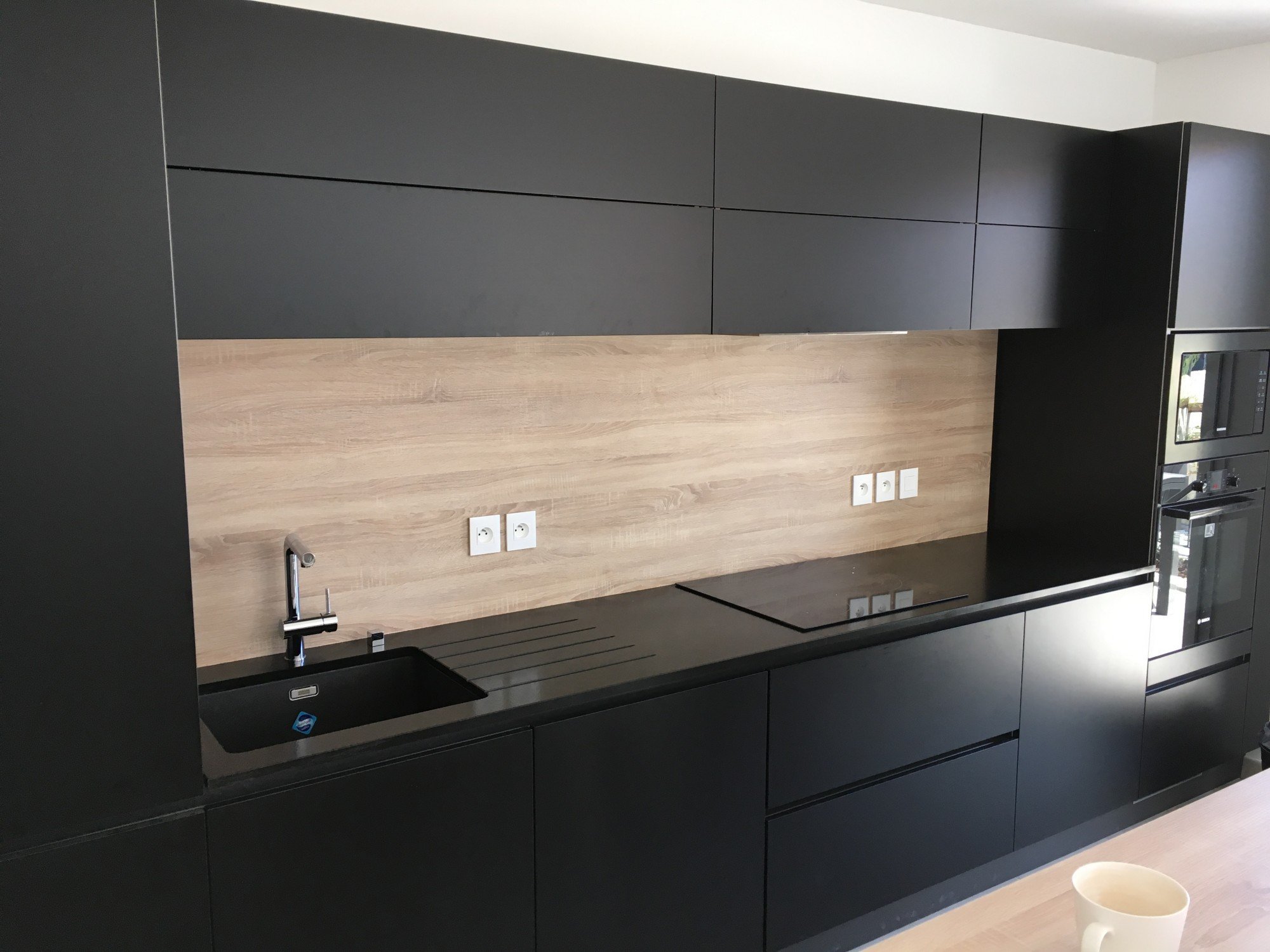 Кухня с черным фартуком и столешницей и дерево