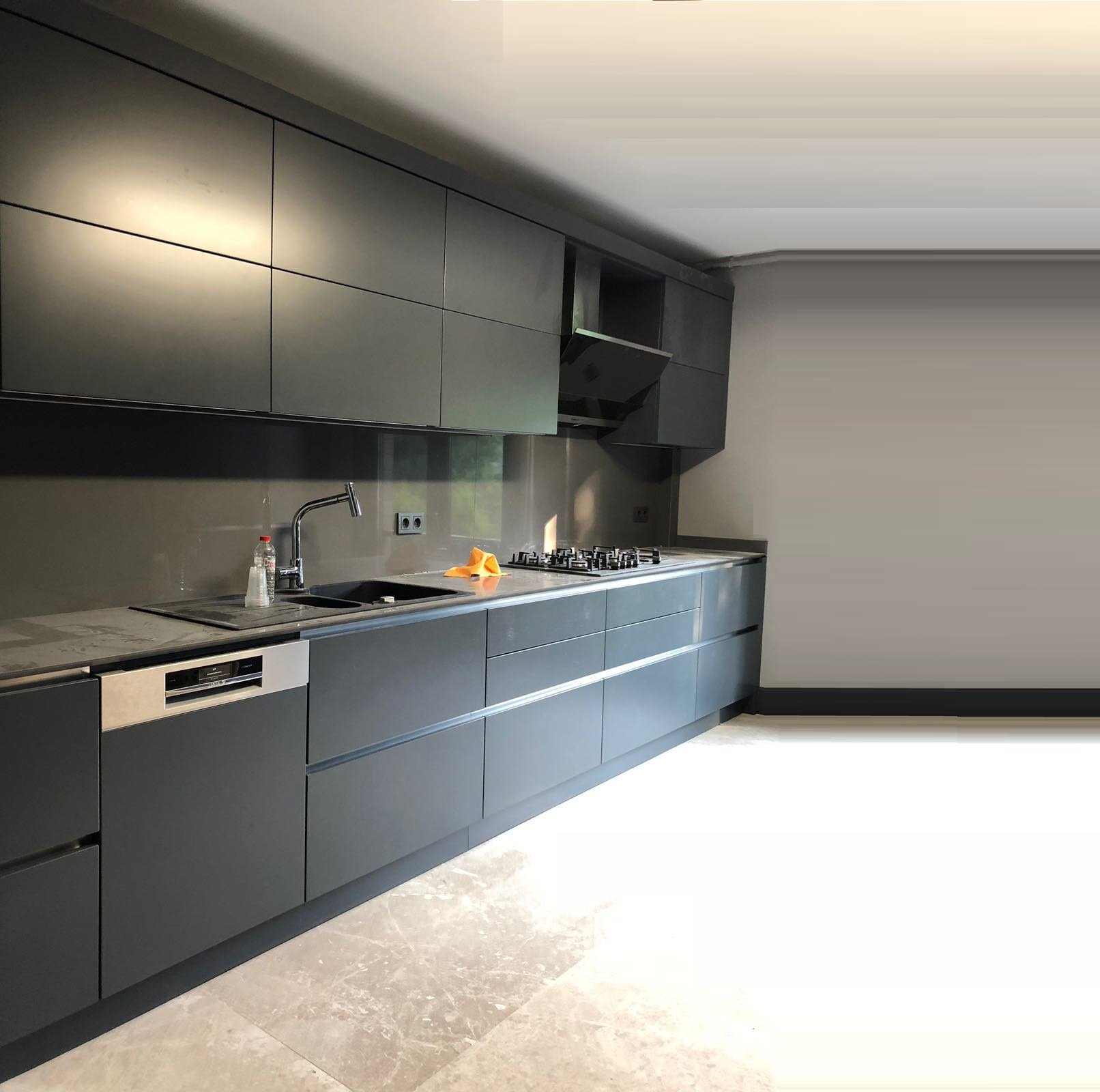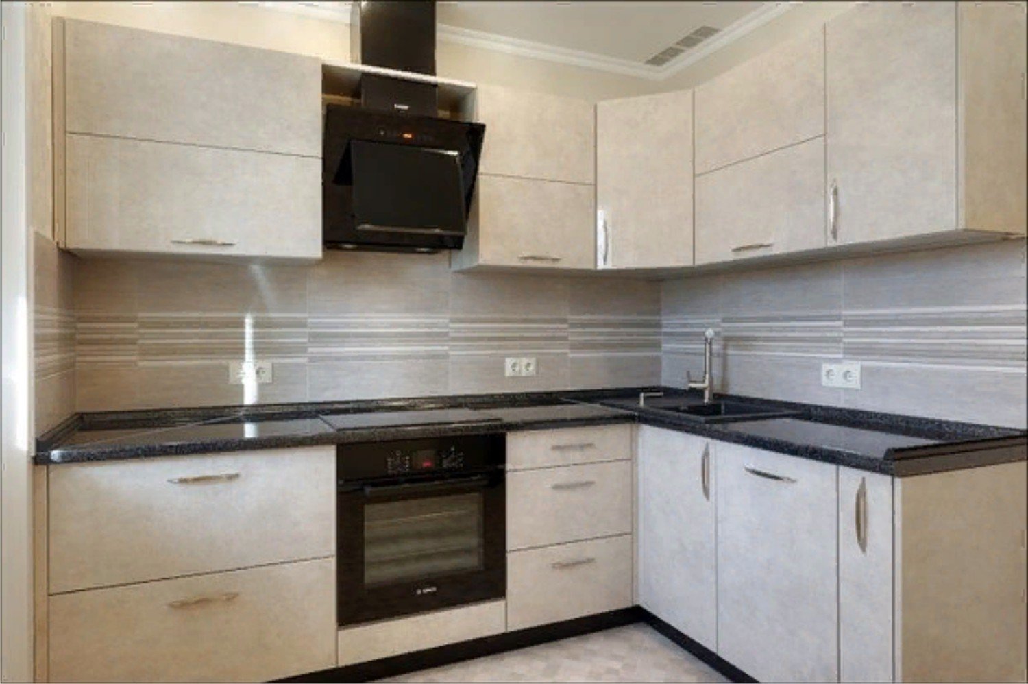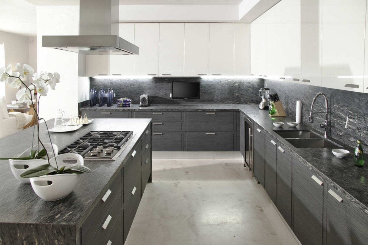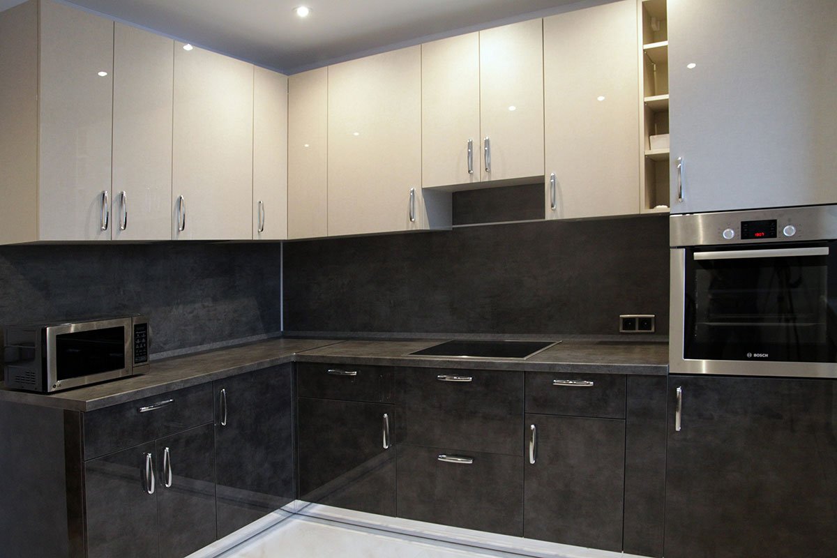Серая кухня с черной столешницей