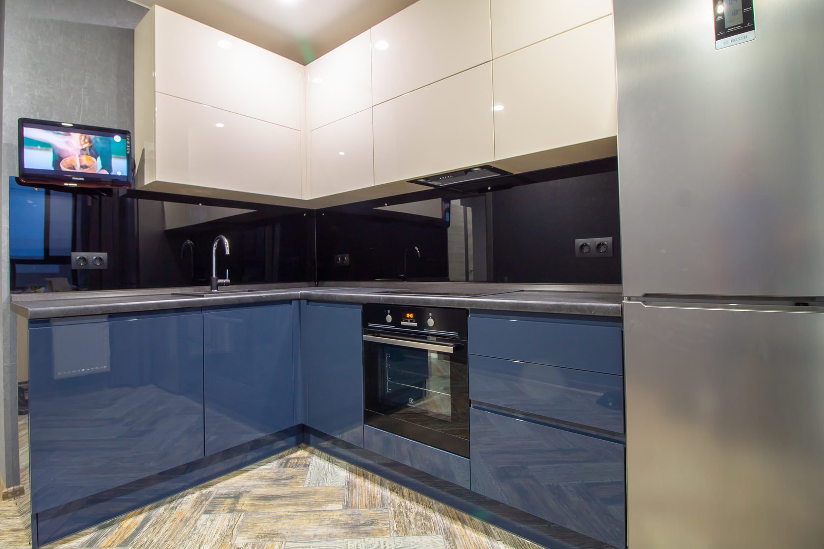 Синяя кухня с черной столешницей