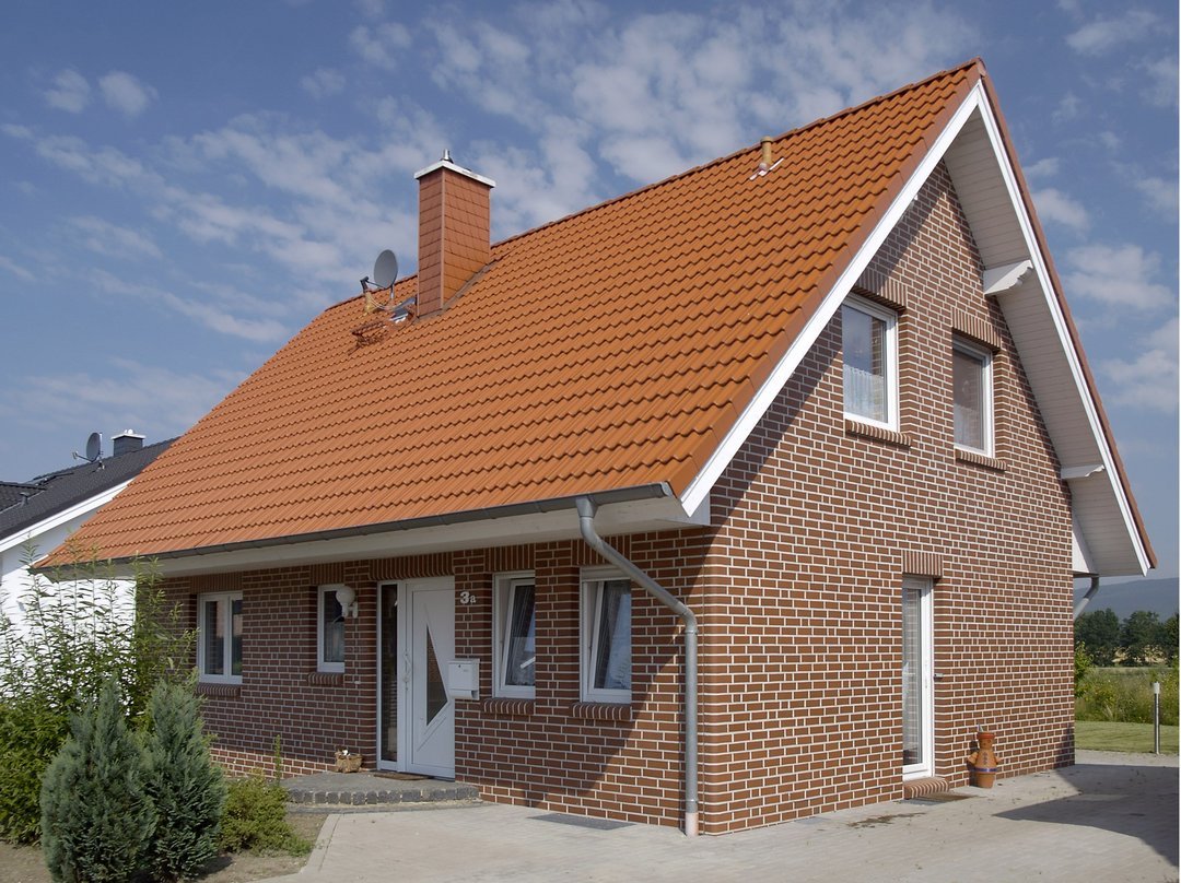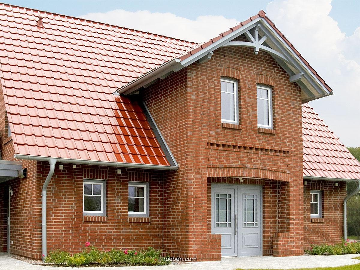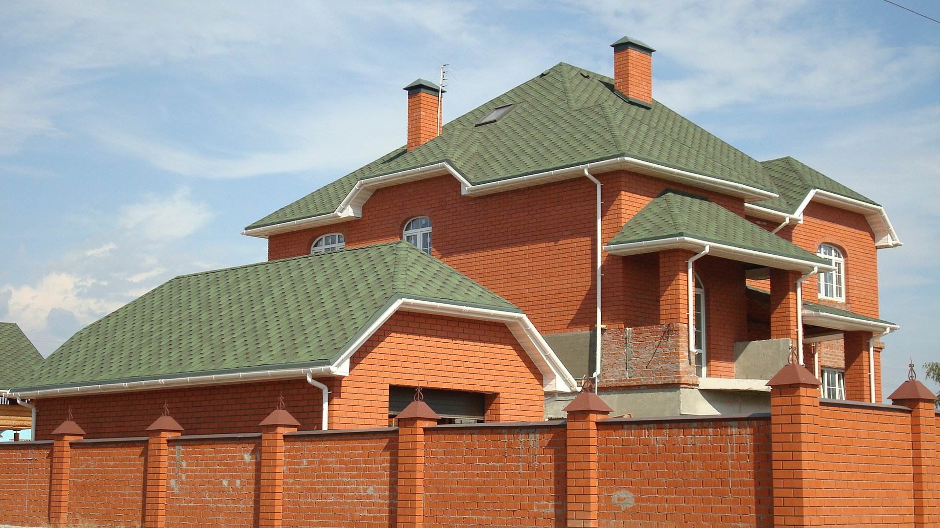 Красный кирпичный дом с зеленой крышей