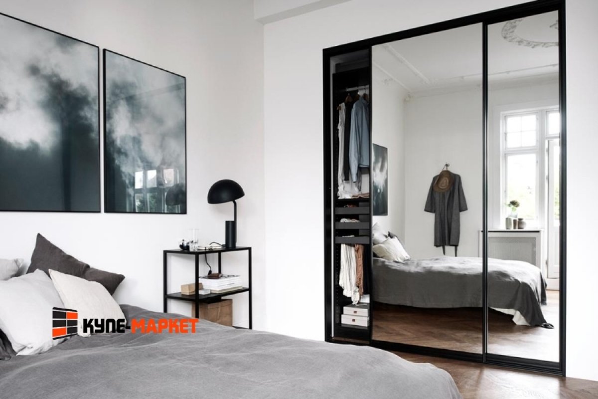 Зеркальный шкаф купе с черным профилем