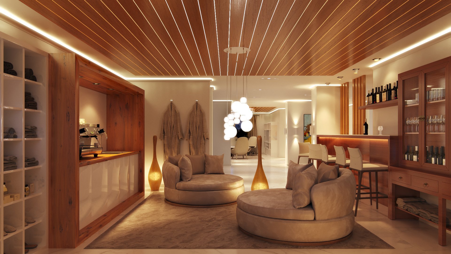 Деревянный реечный потолок с подсветкой