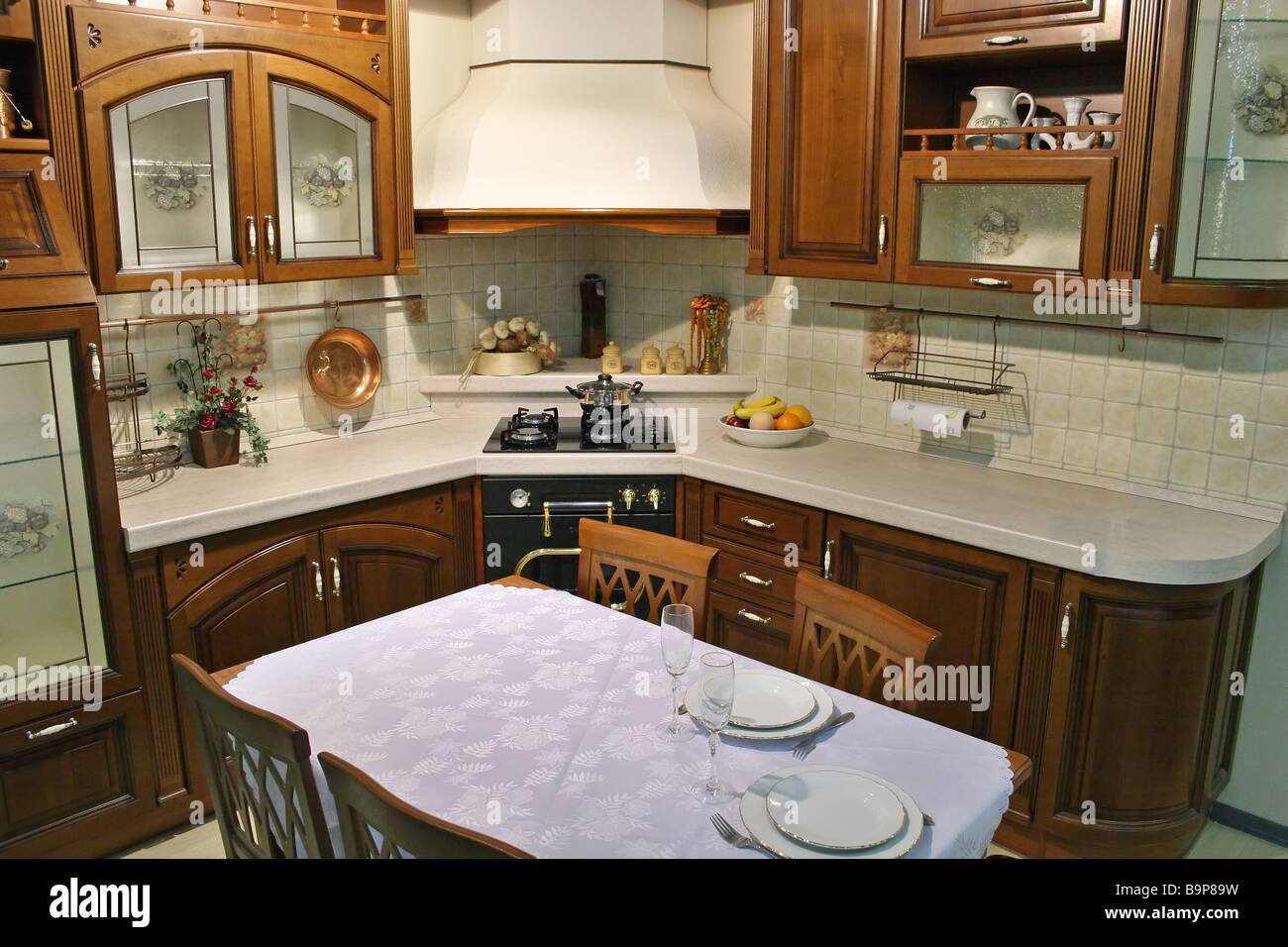 Кухня с угловой плитой и вытяжкой