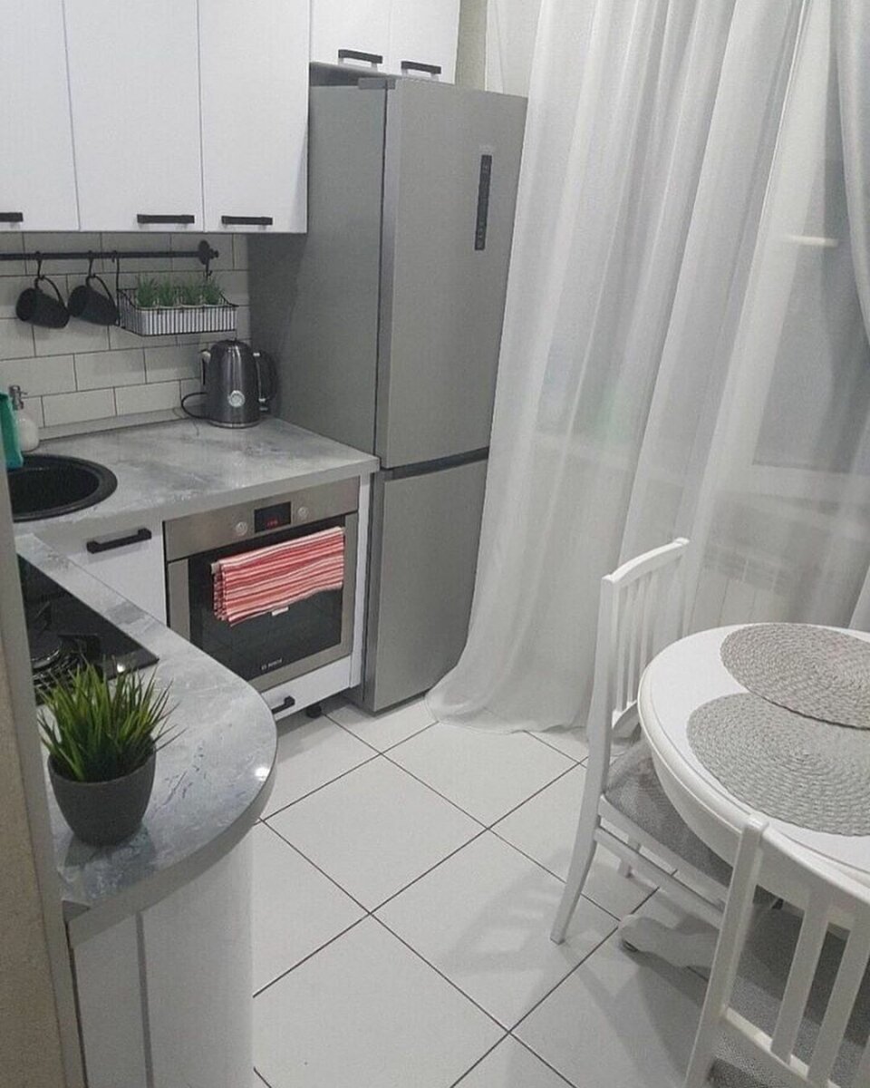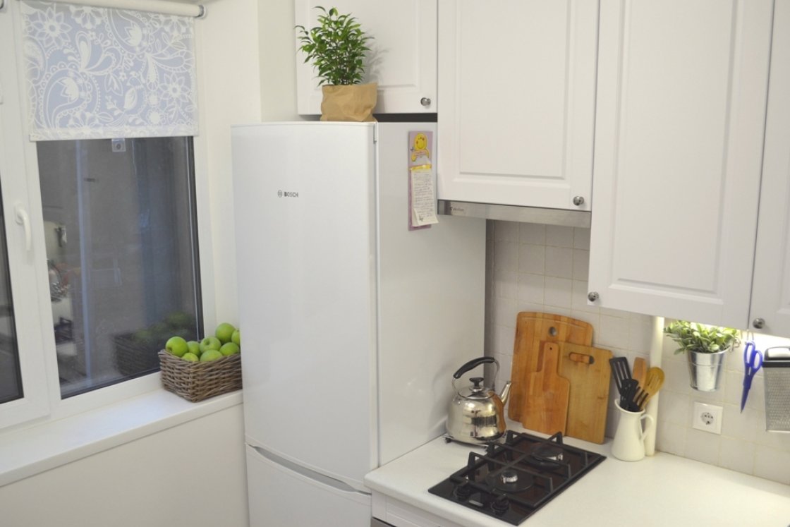 Холодильник у окна в маленькой кухне в 5кв