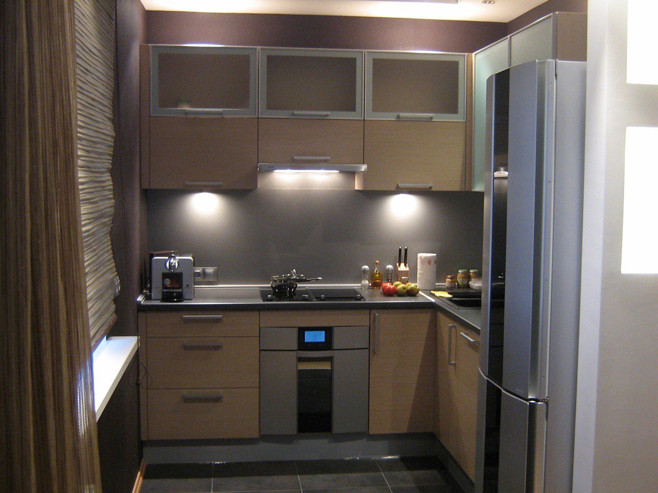Маленькая угловая кухня с холодильником