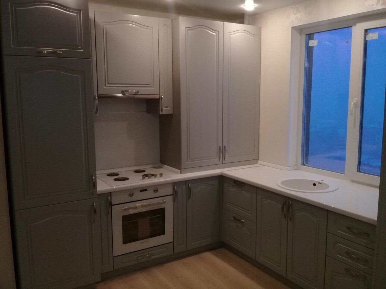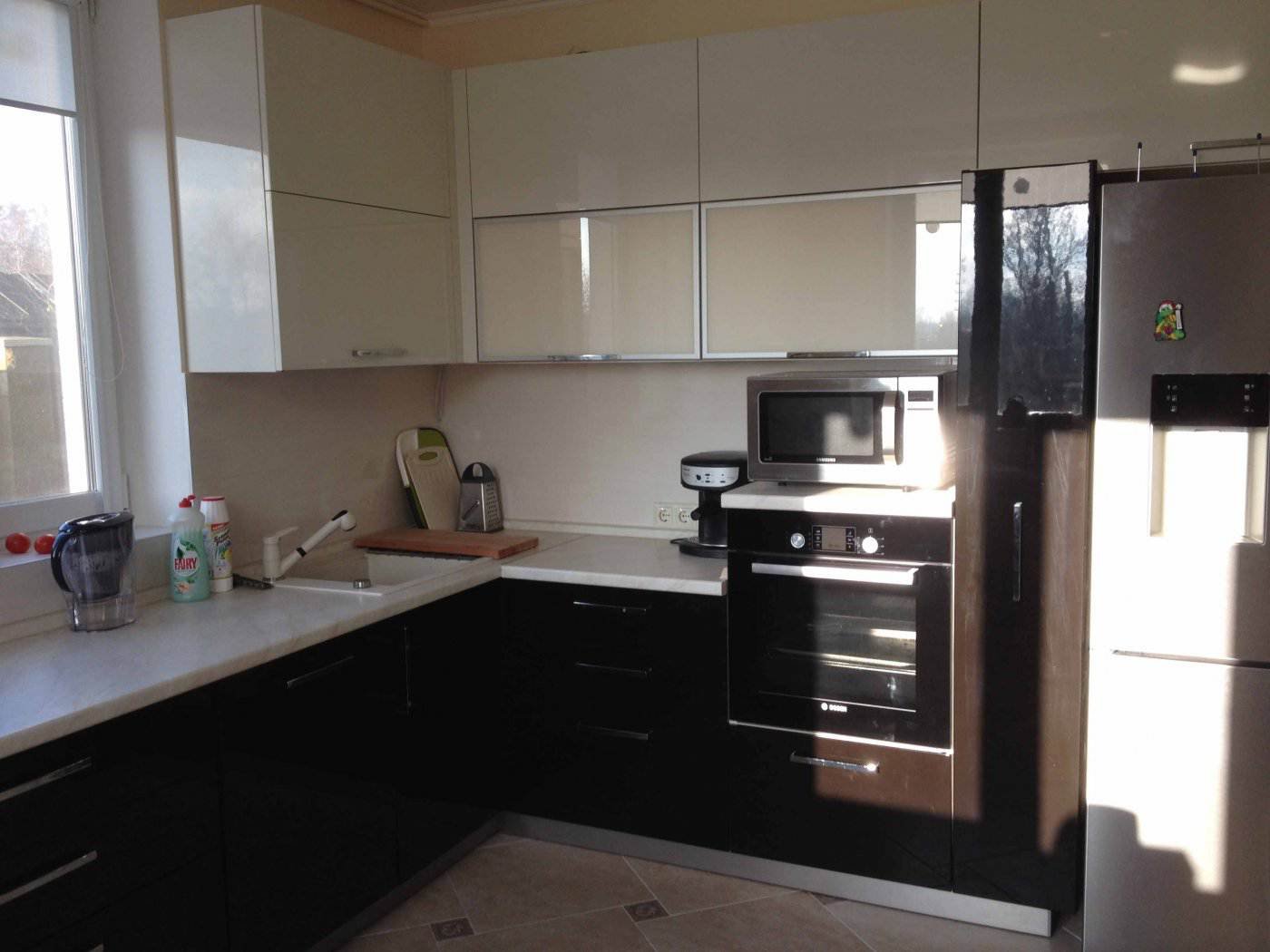 Кухня угловая с пеналом и мойкой у окна