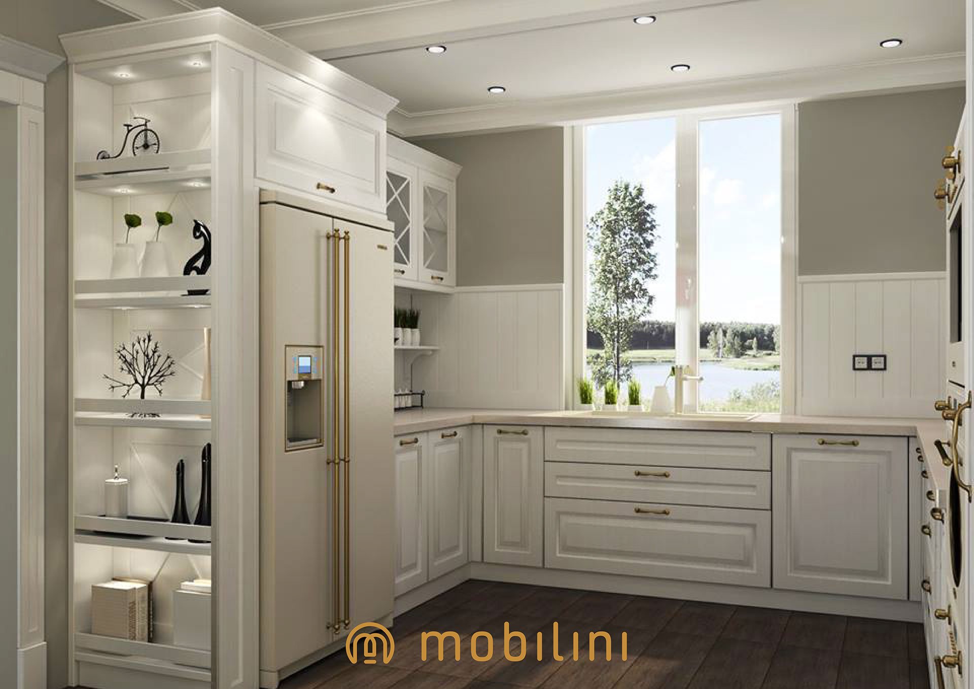 Угловая кухня с холодильником у окна