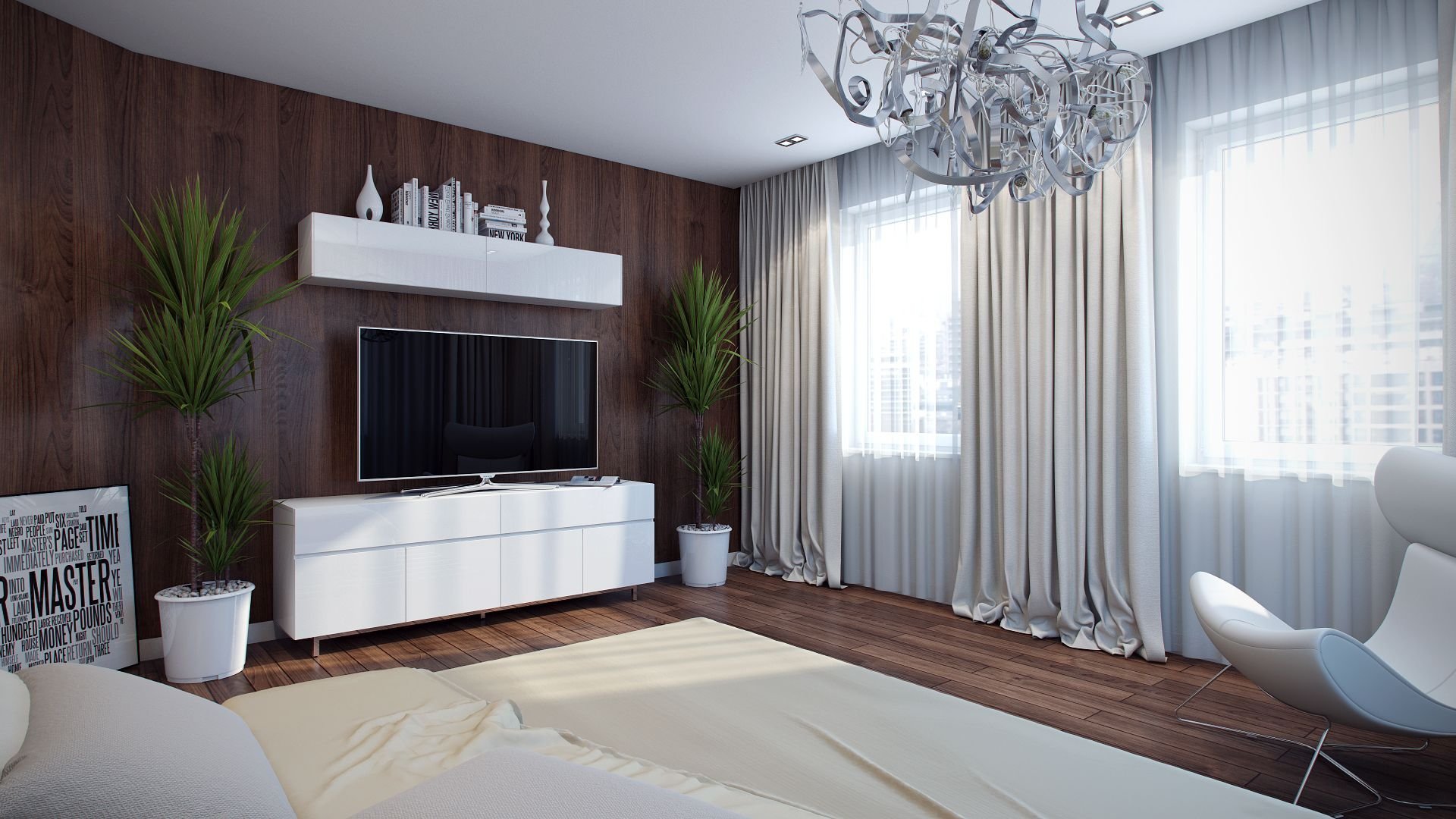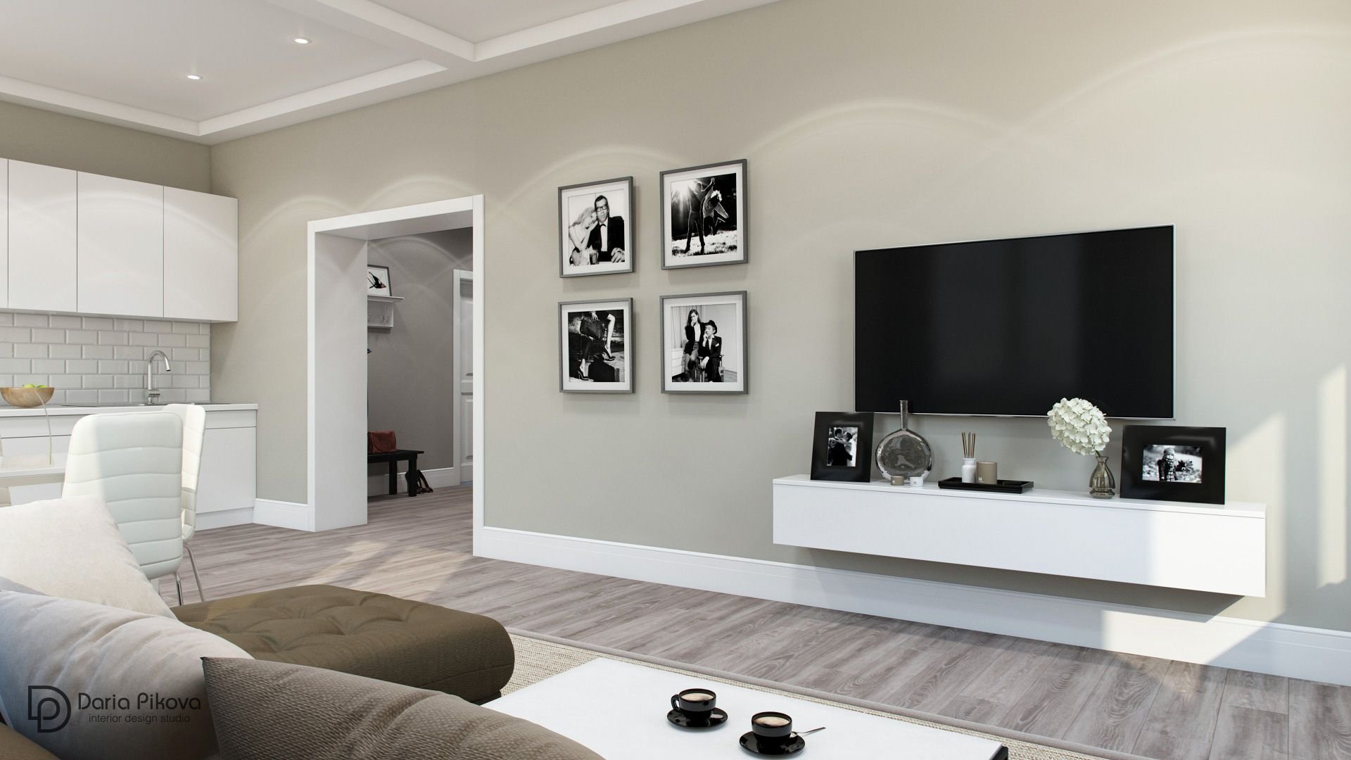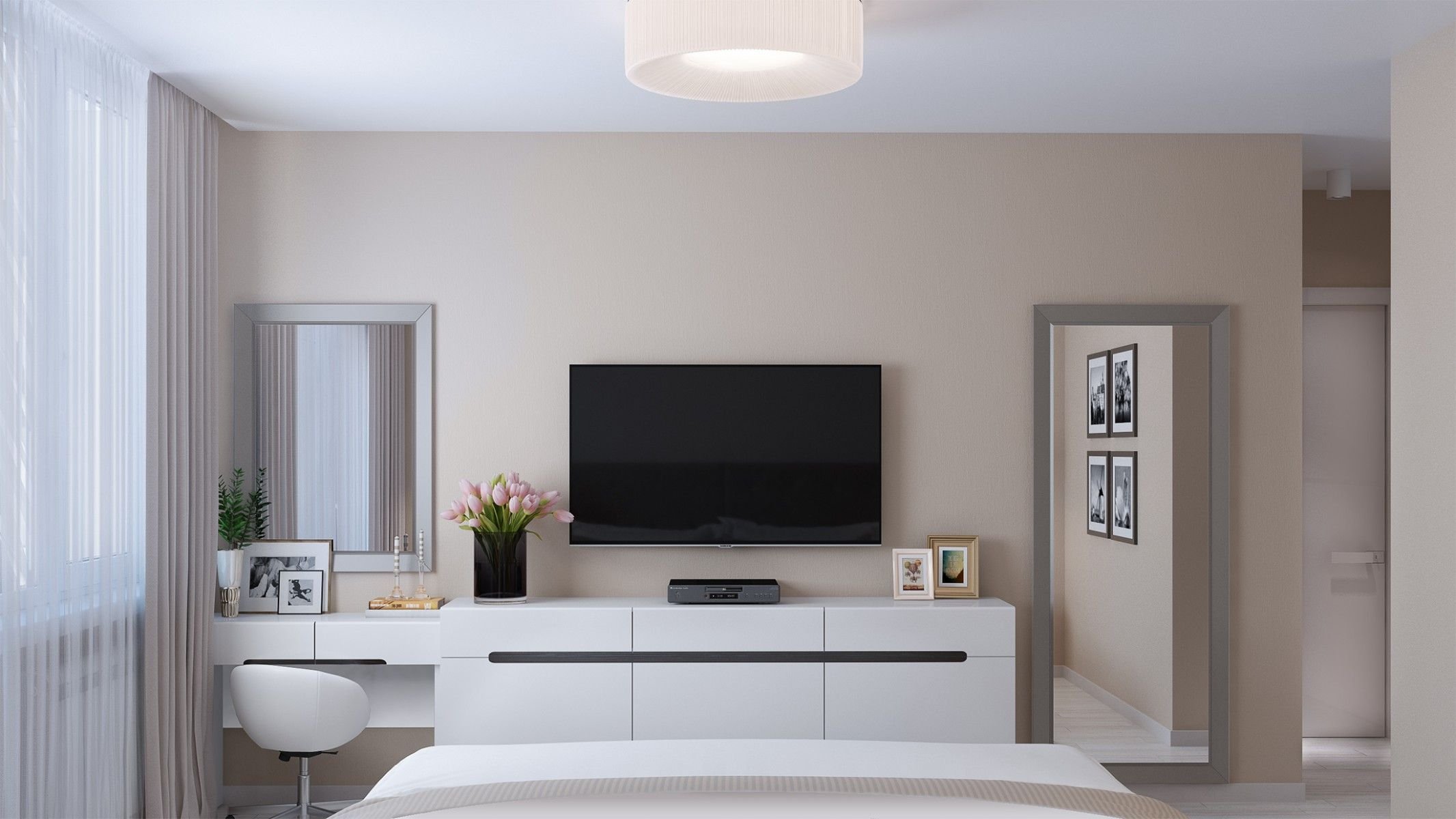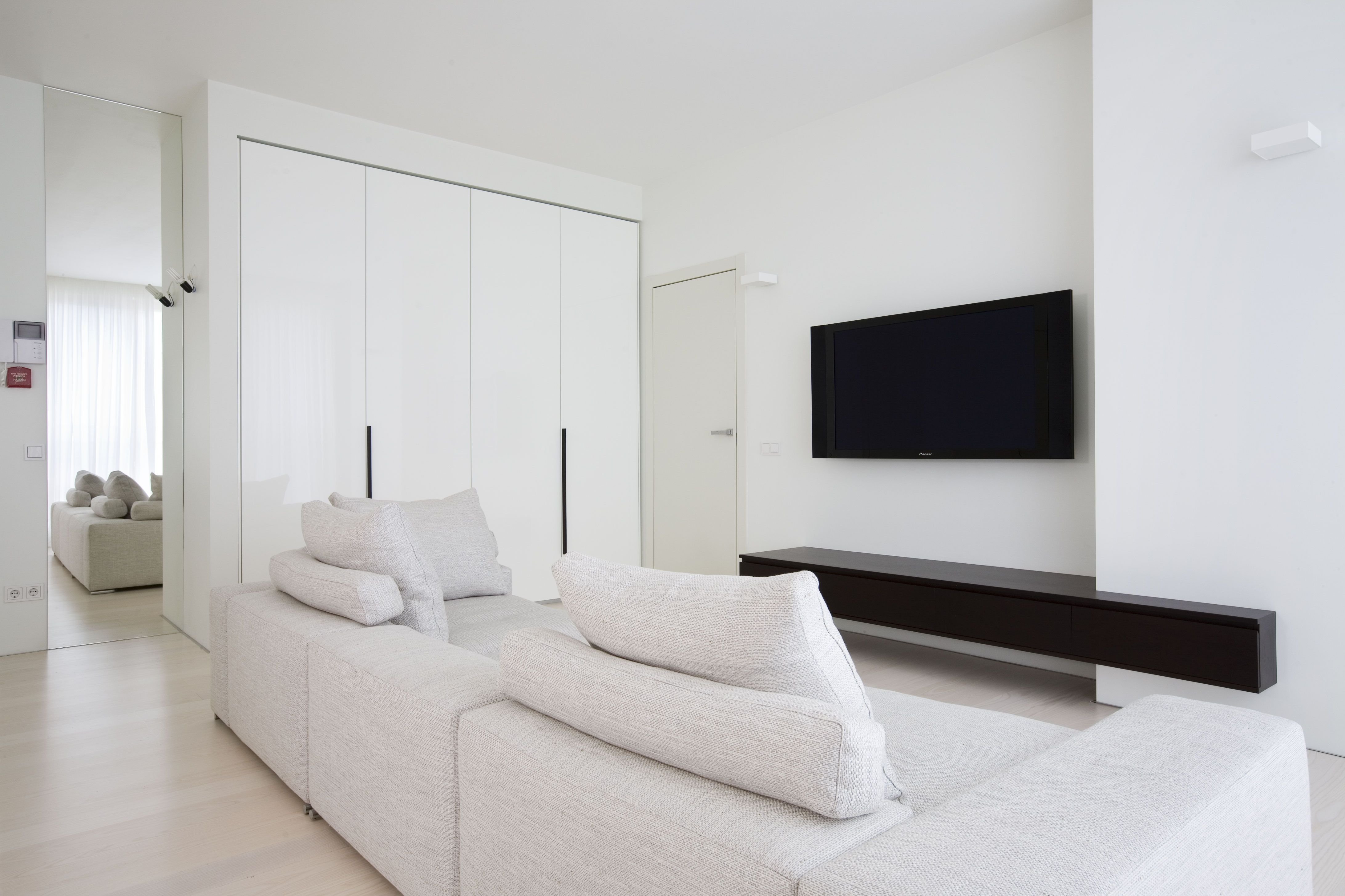 Телевизор на стене с белой тумбой в гостиной