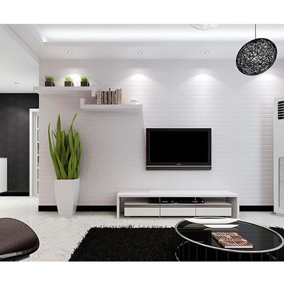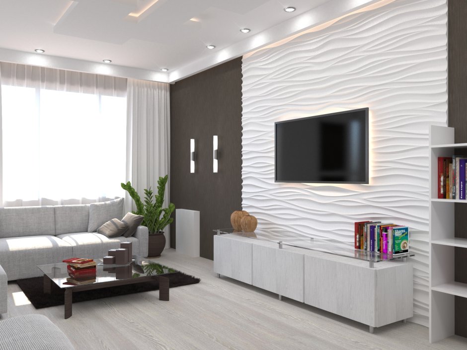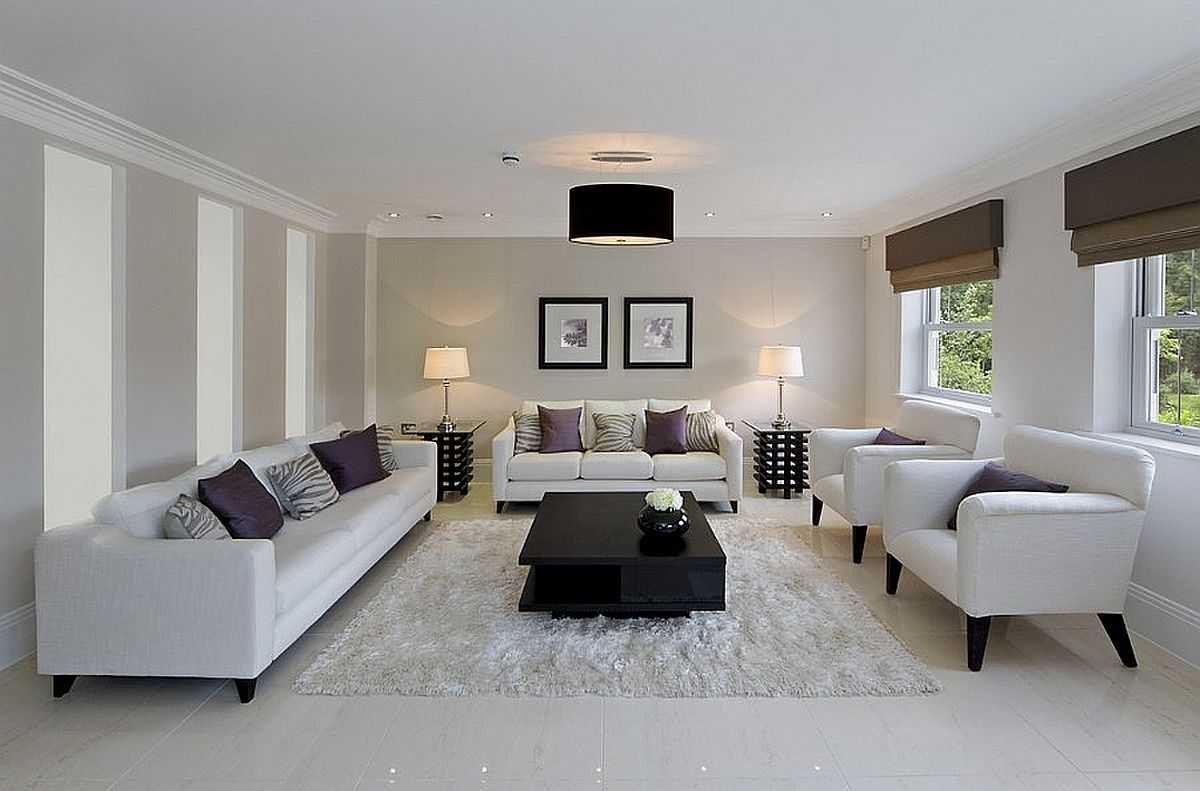 Интерьер гостинной с белыми обоями