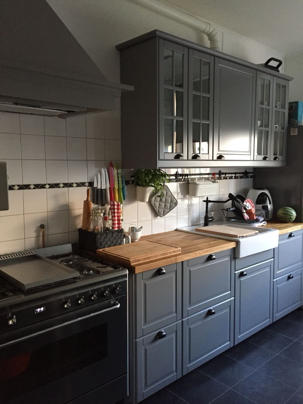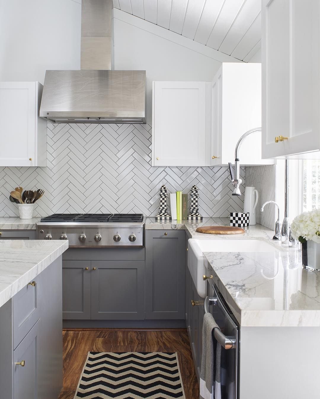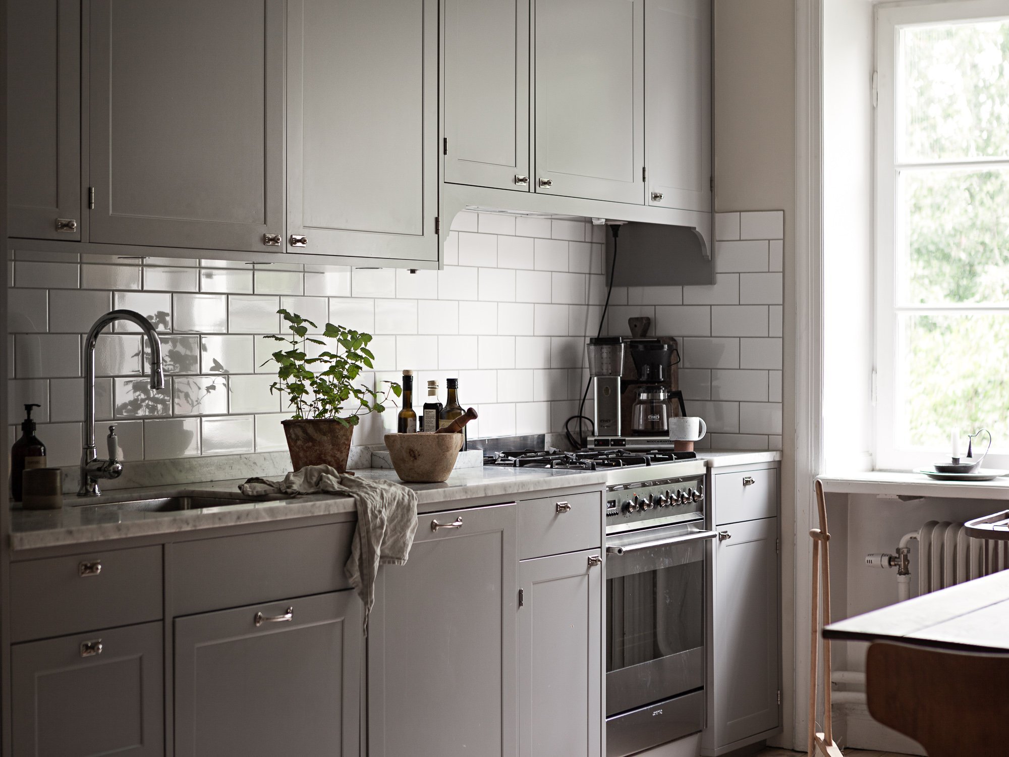 Серая кухня с белой плиткой