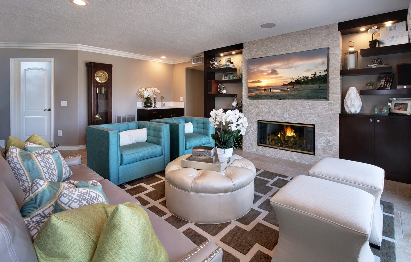 Гостиная с камином и столом