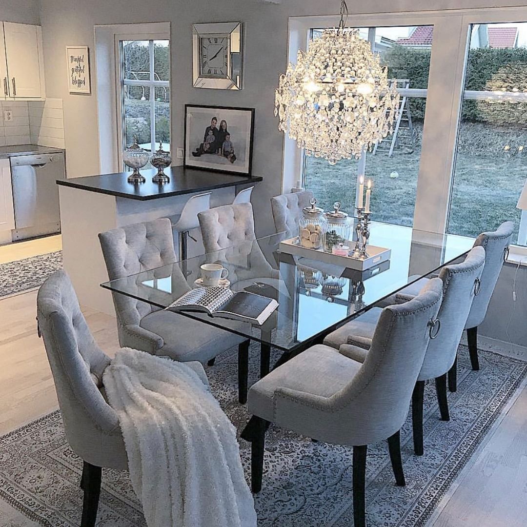 Стеклянный обеденный стол в интерьере