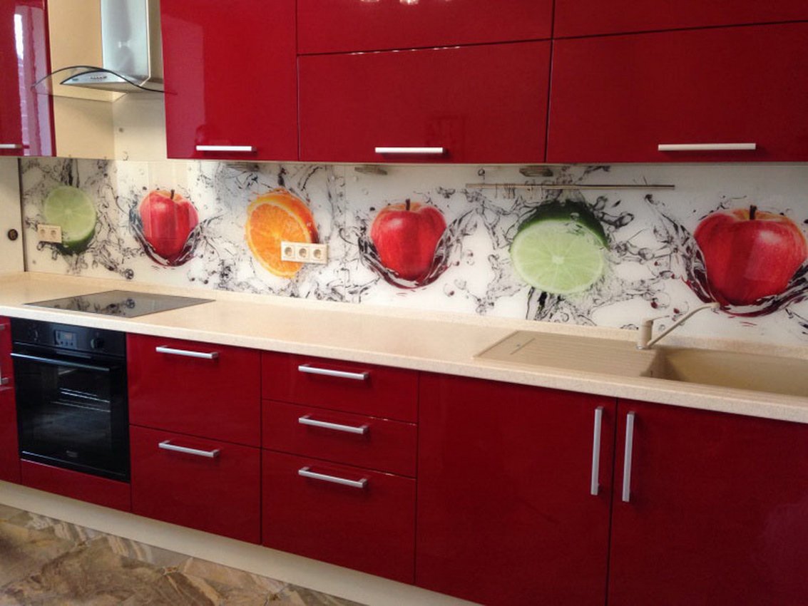 Стеклянный фартук на красной кухне