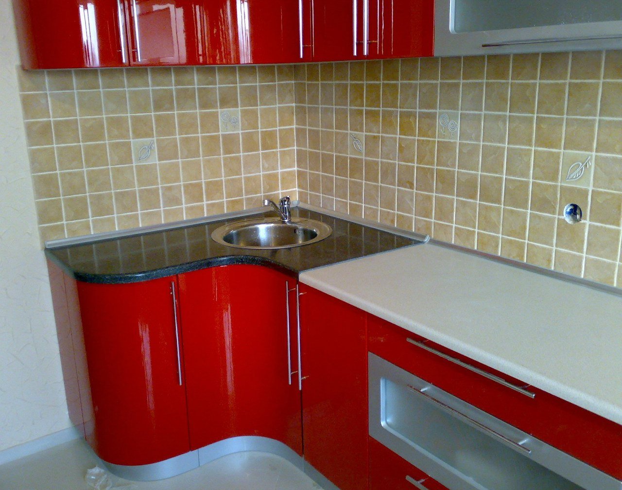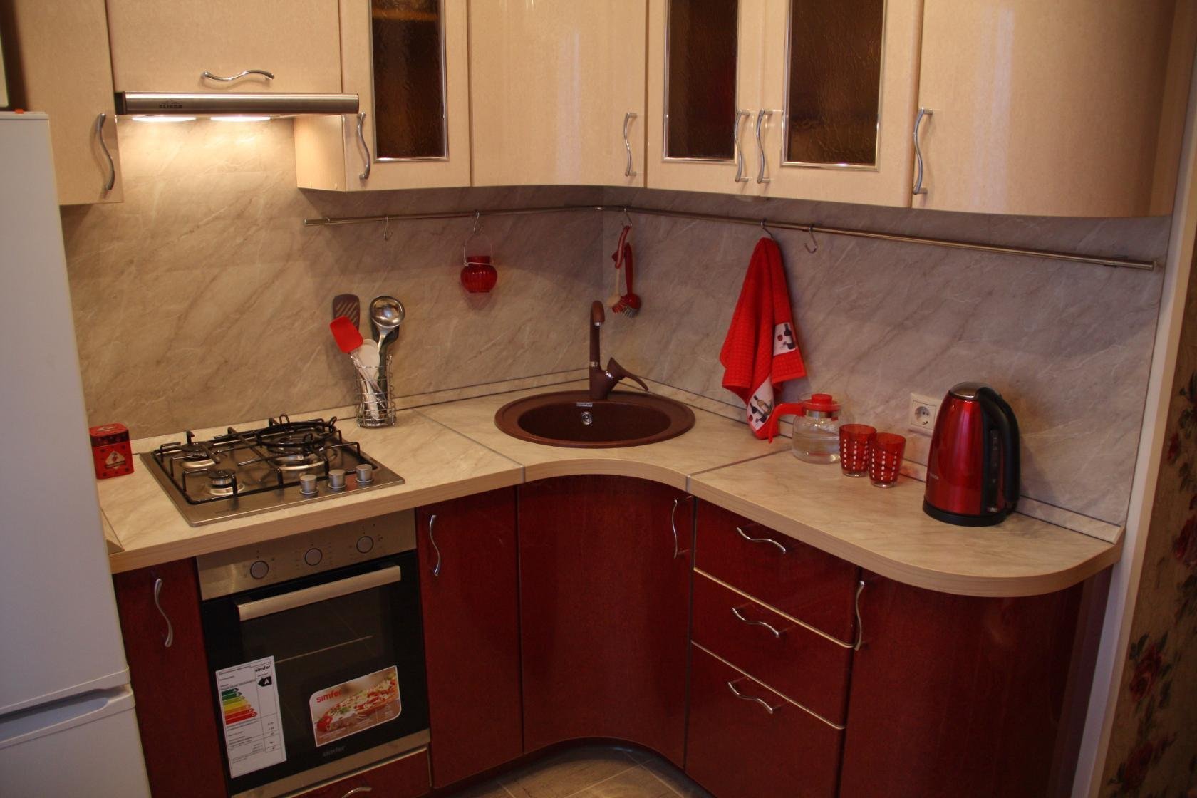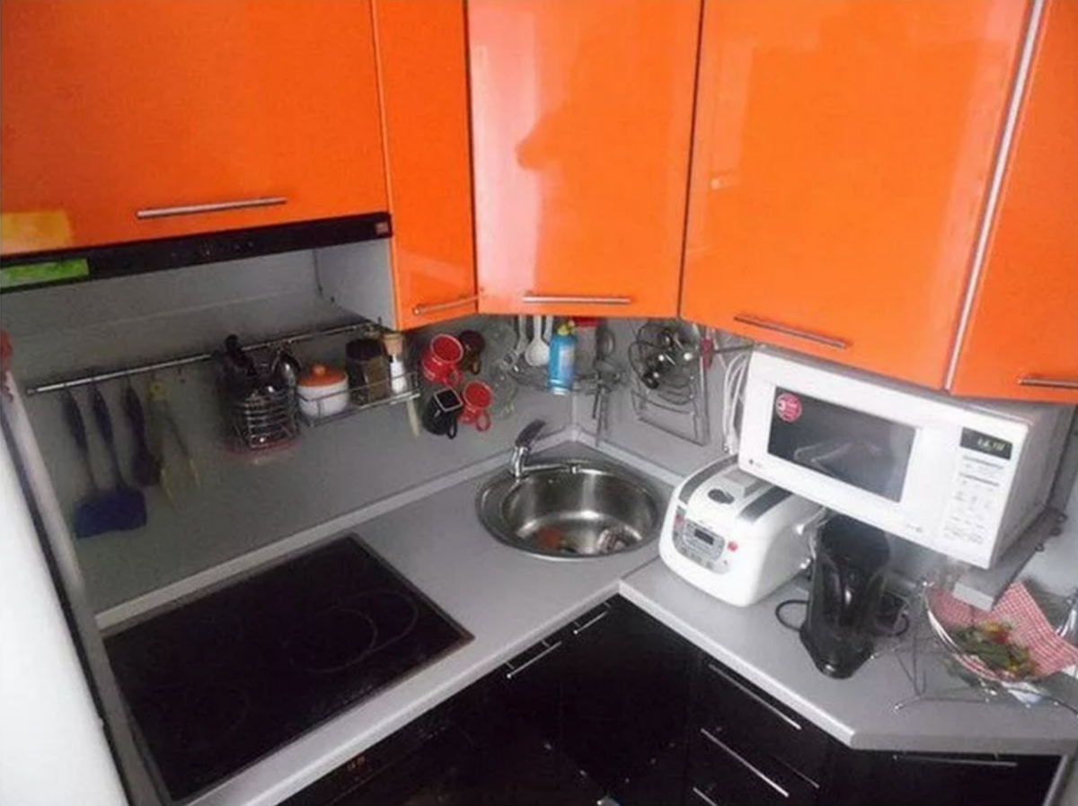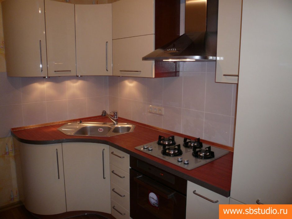 Угловая кухня с мойкой в углу для маленькой кухни