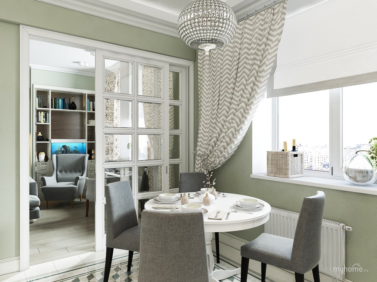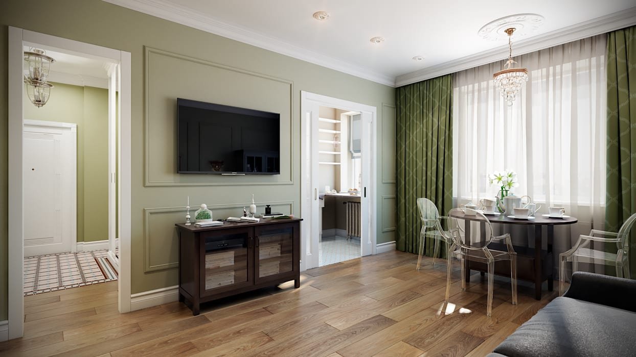 Гостиная в современном классическом стиле в оливковых тонах