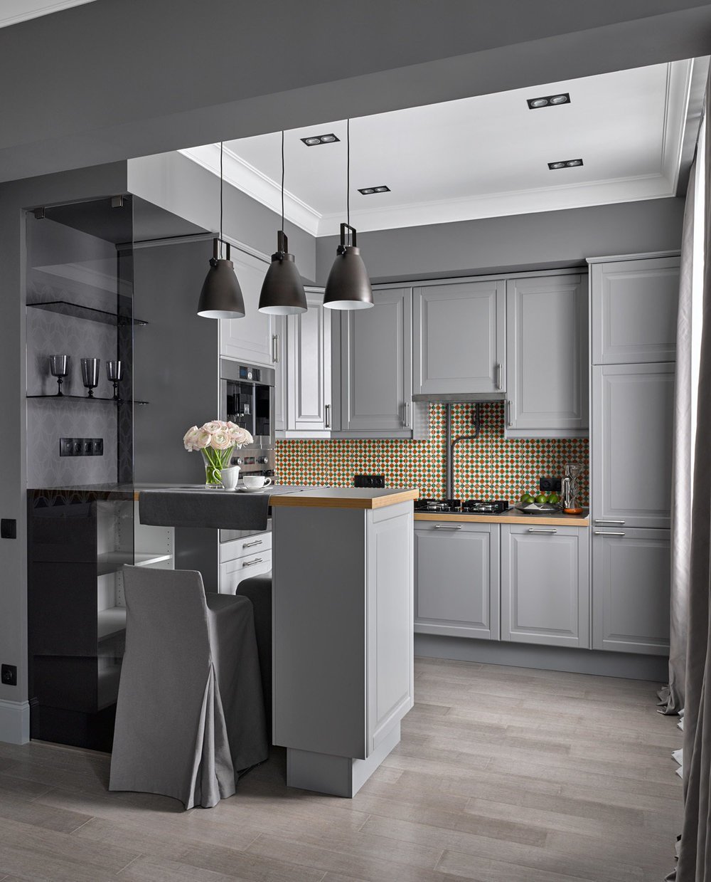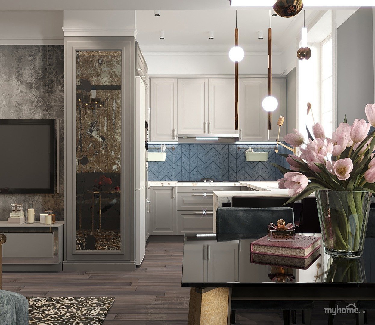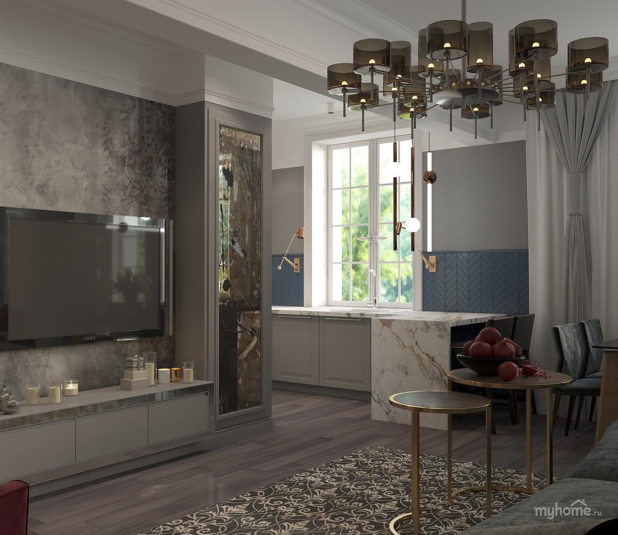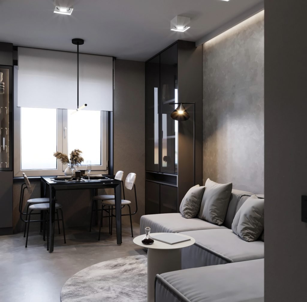 Кухня гостиная с серой кухней