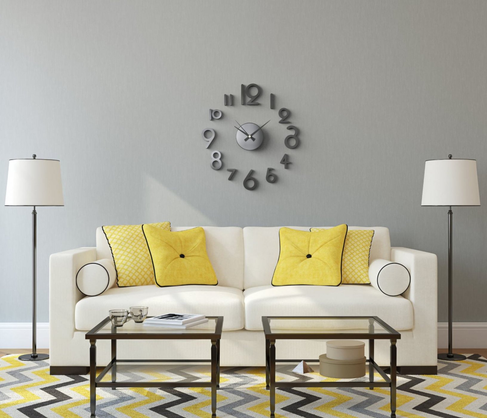 Серый диван с желтыми подушками