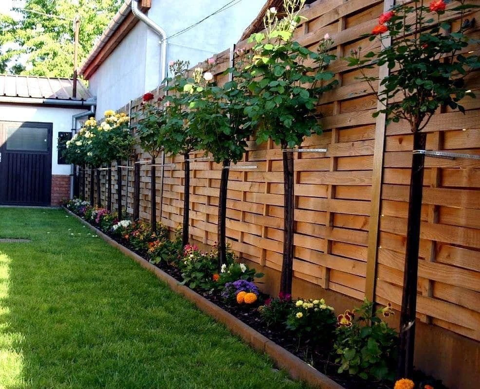 Узкая клумба вдоль забора