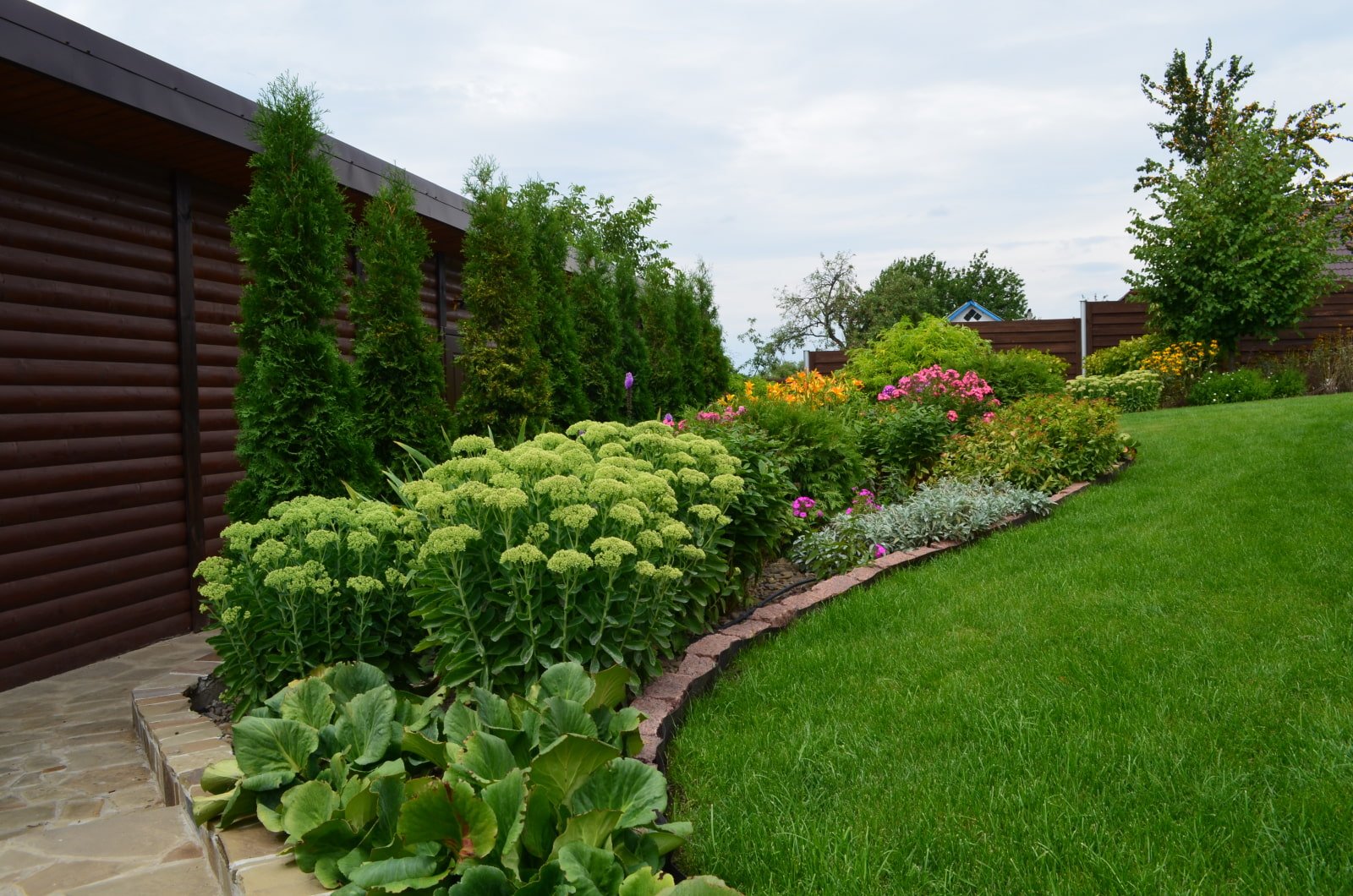 Клумбы вдоль забора на даче