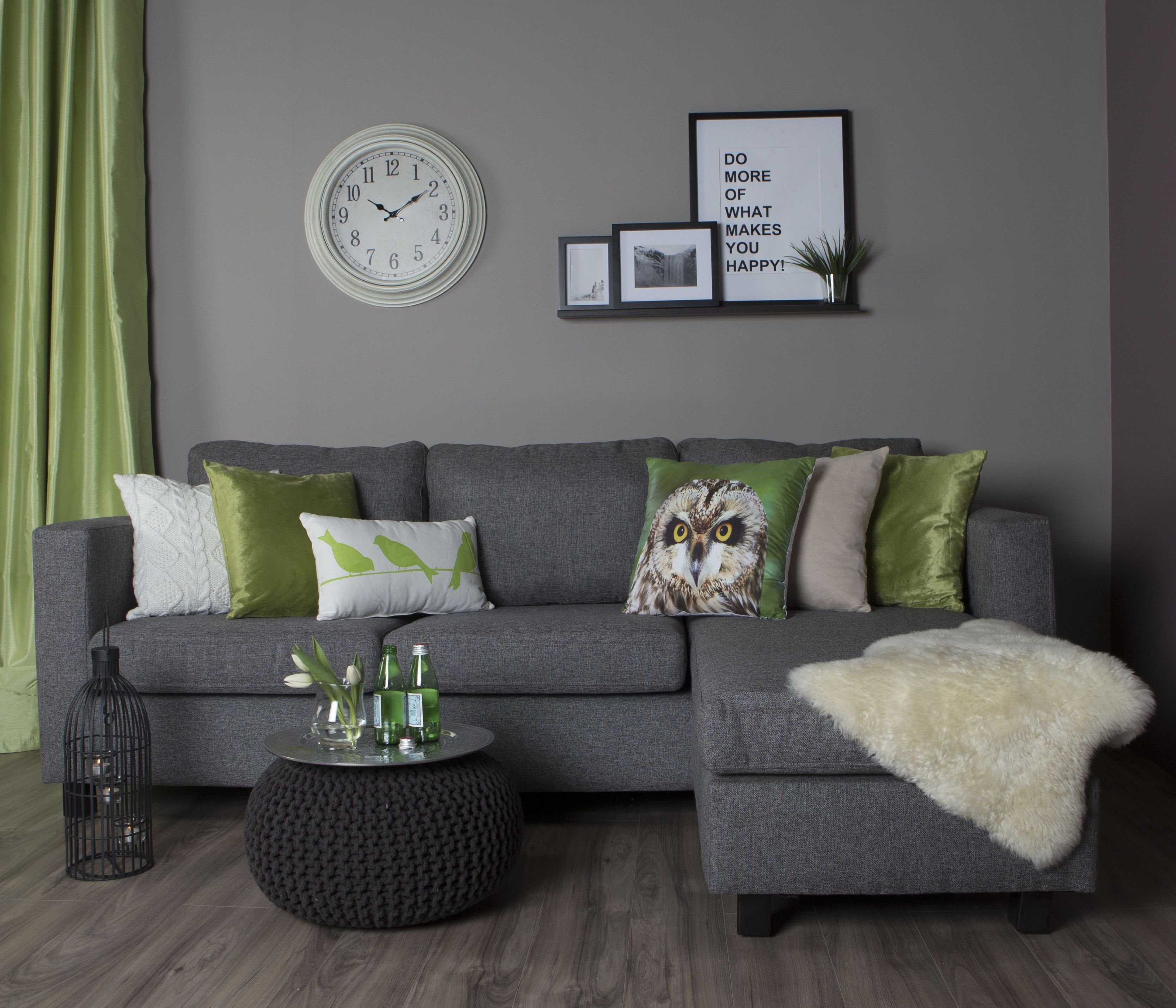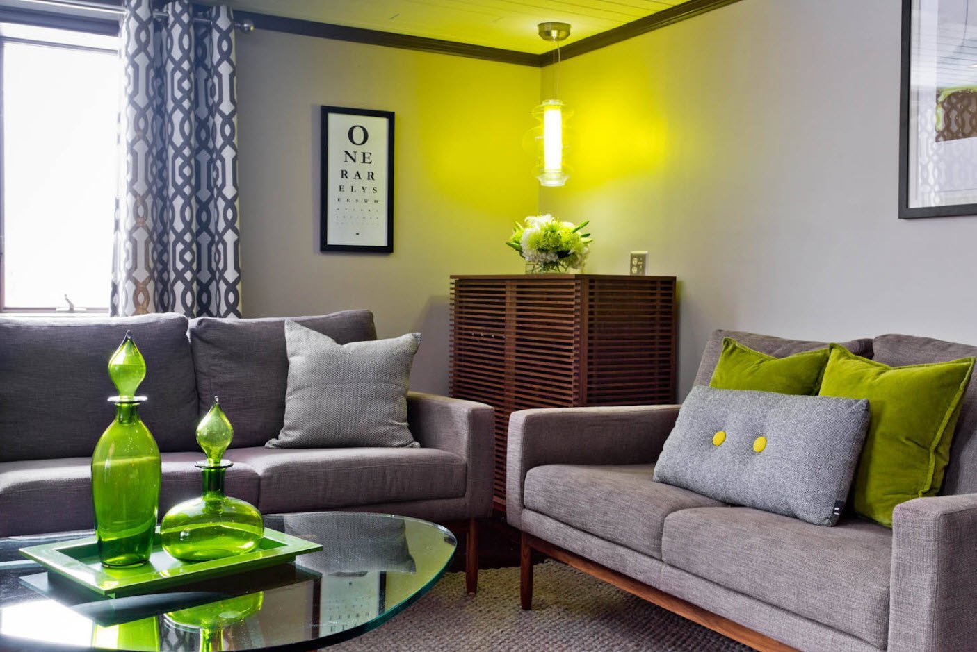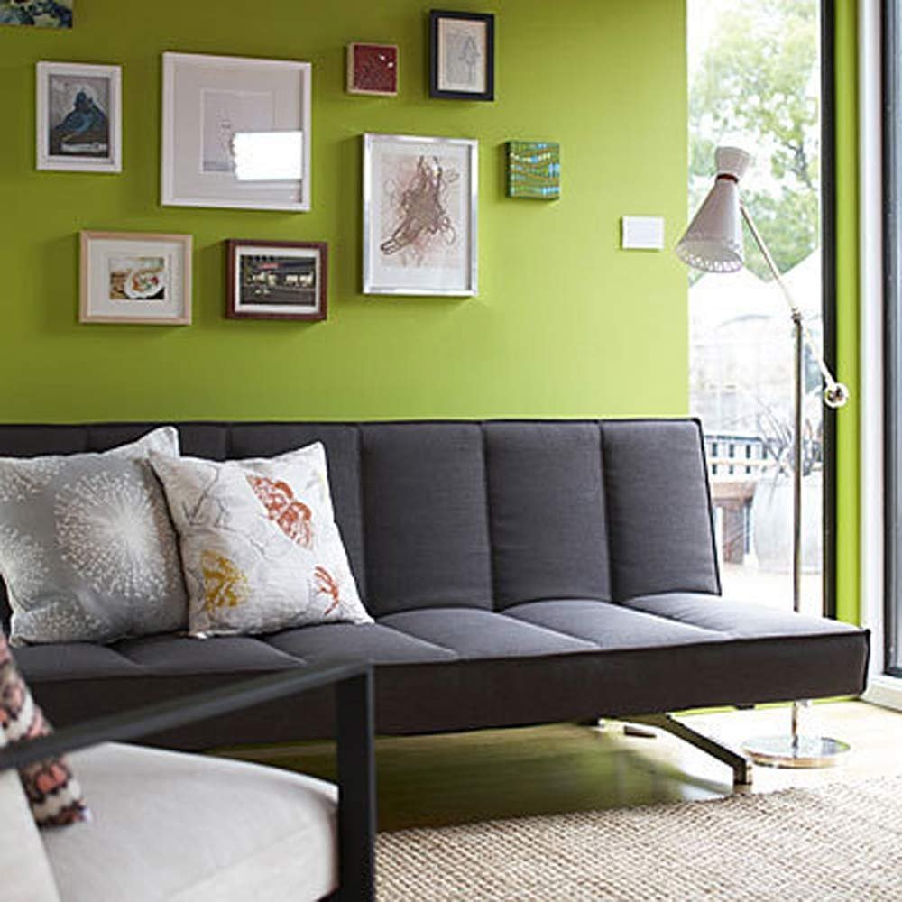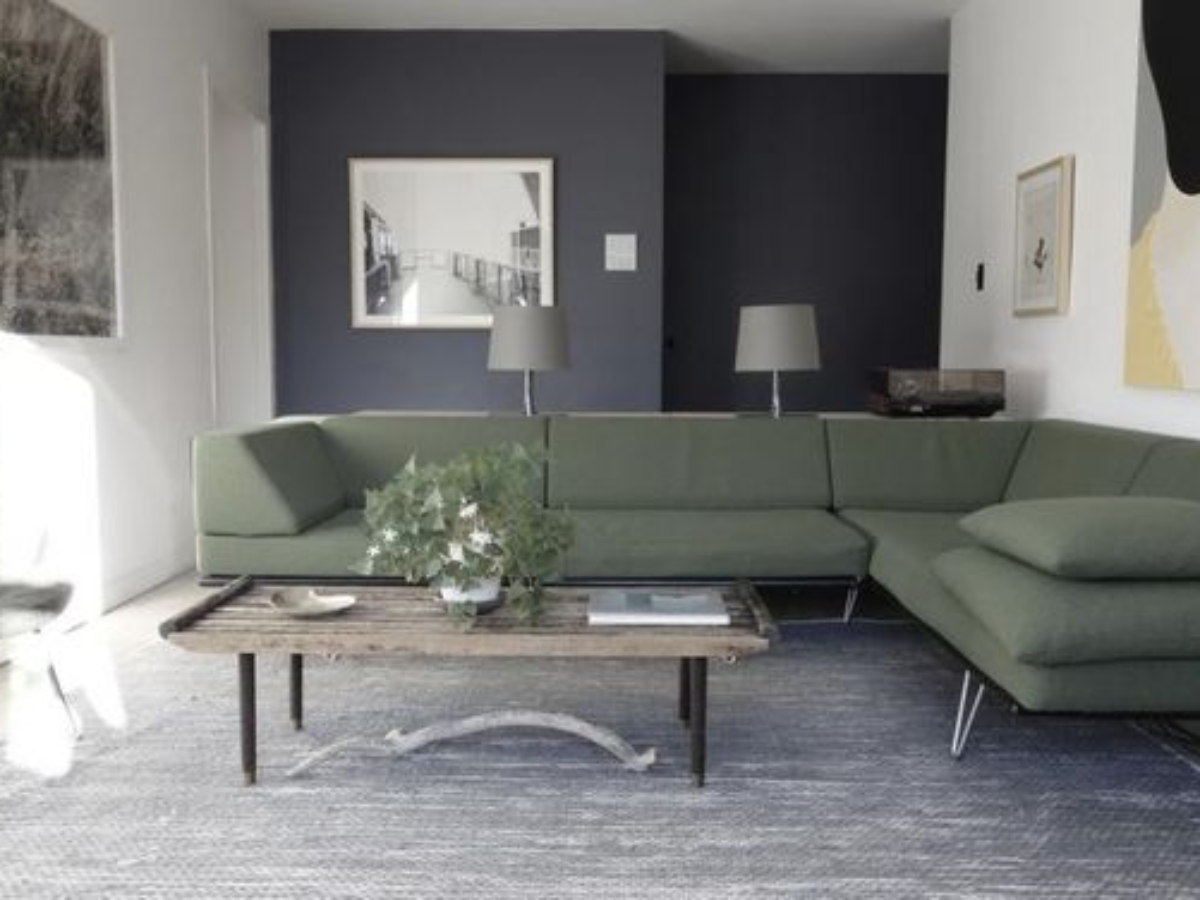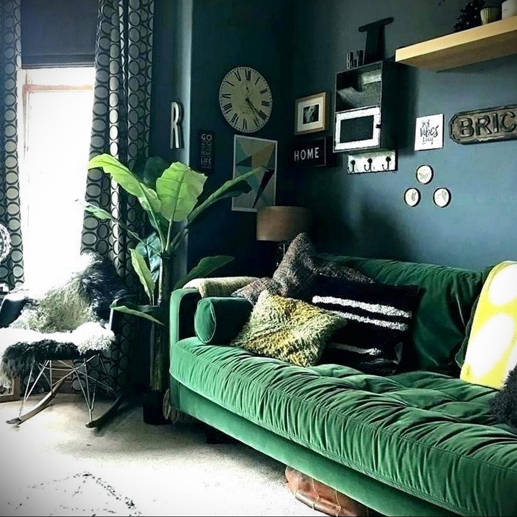 Серые стены зеленый диван
