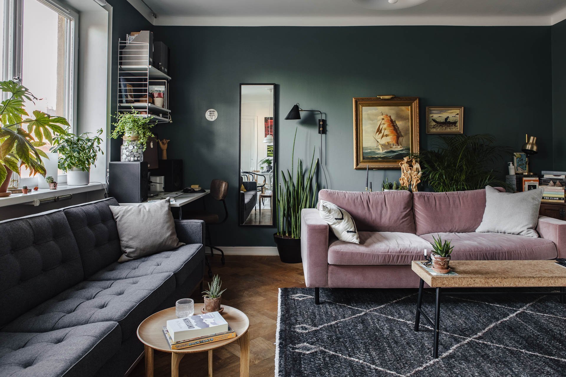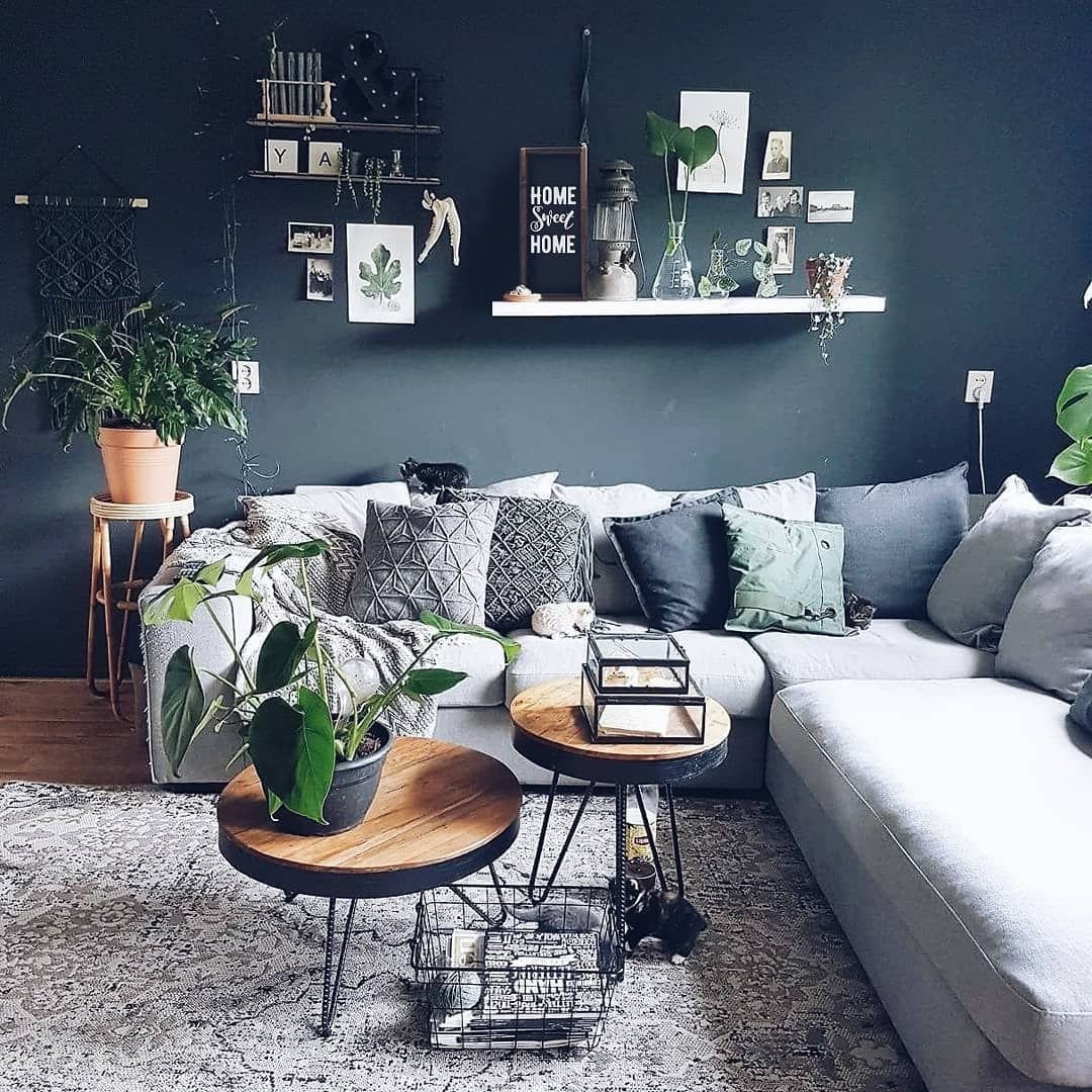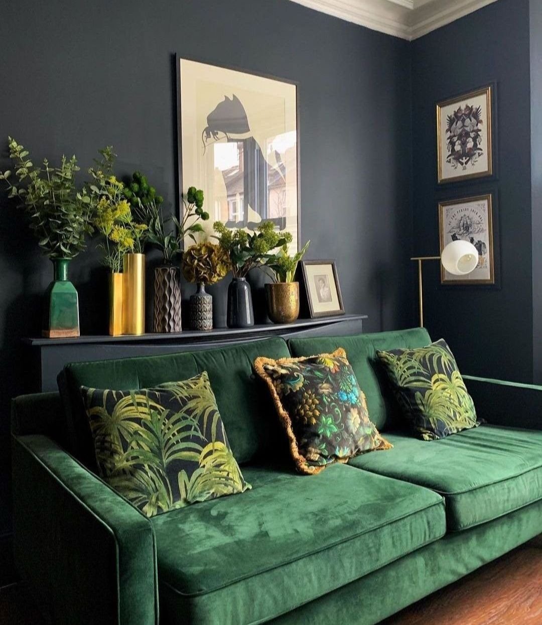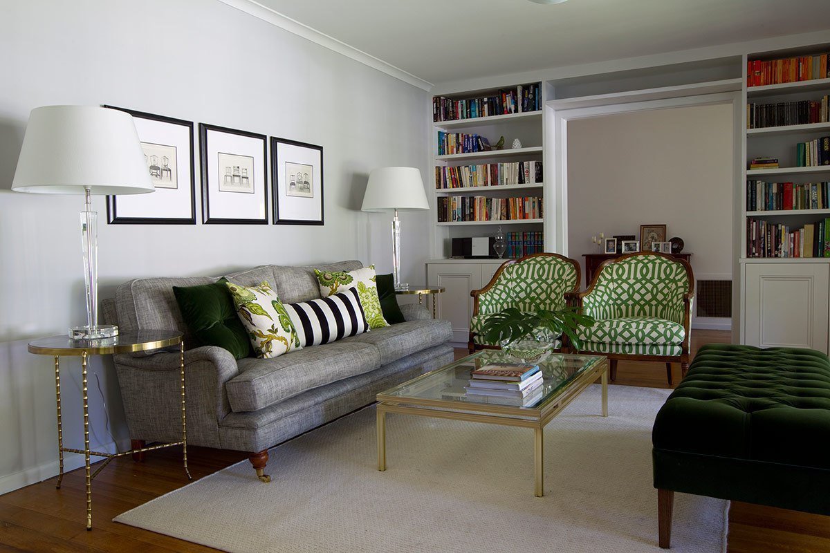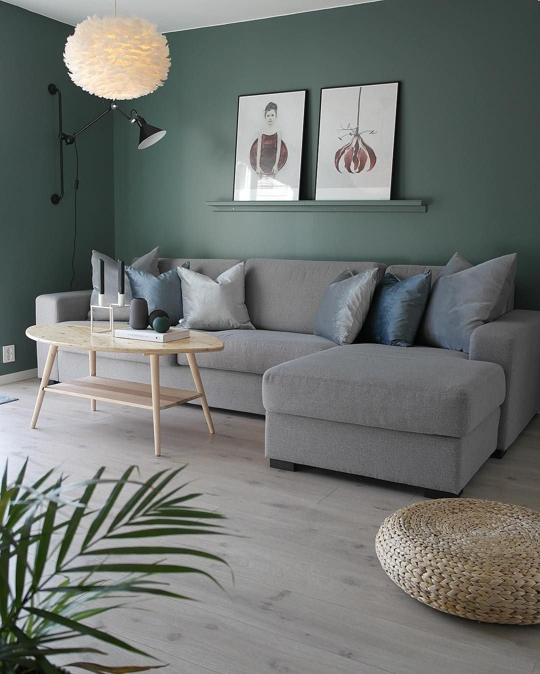 Серые стены и изумрудный диван