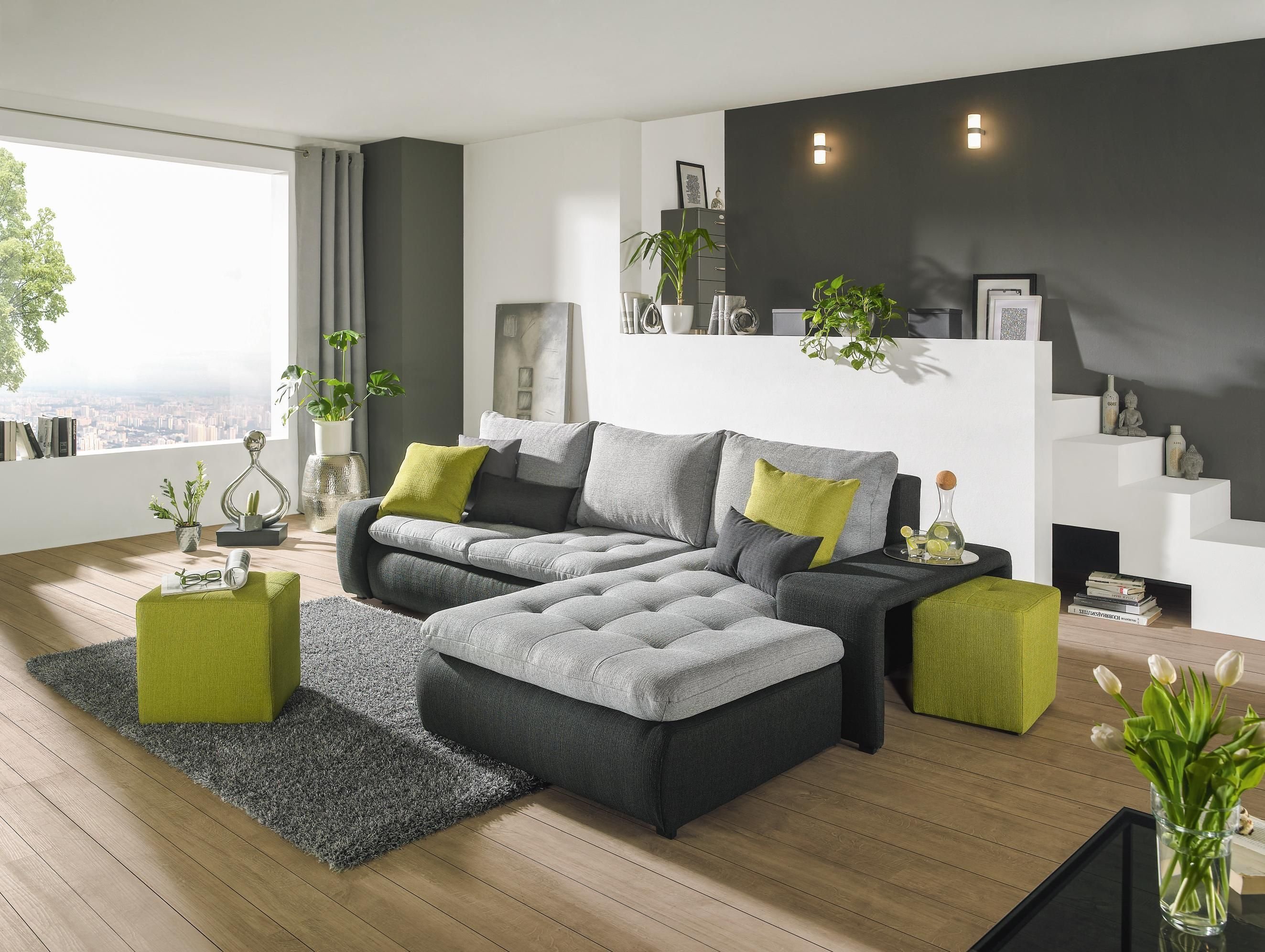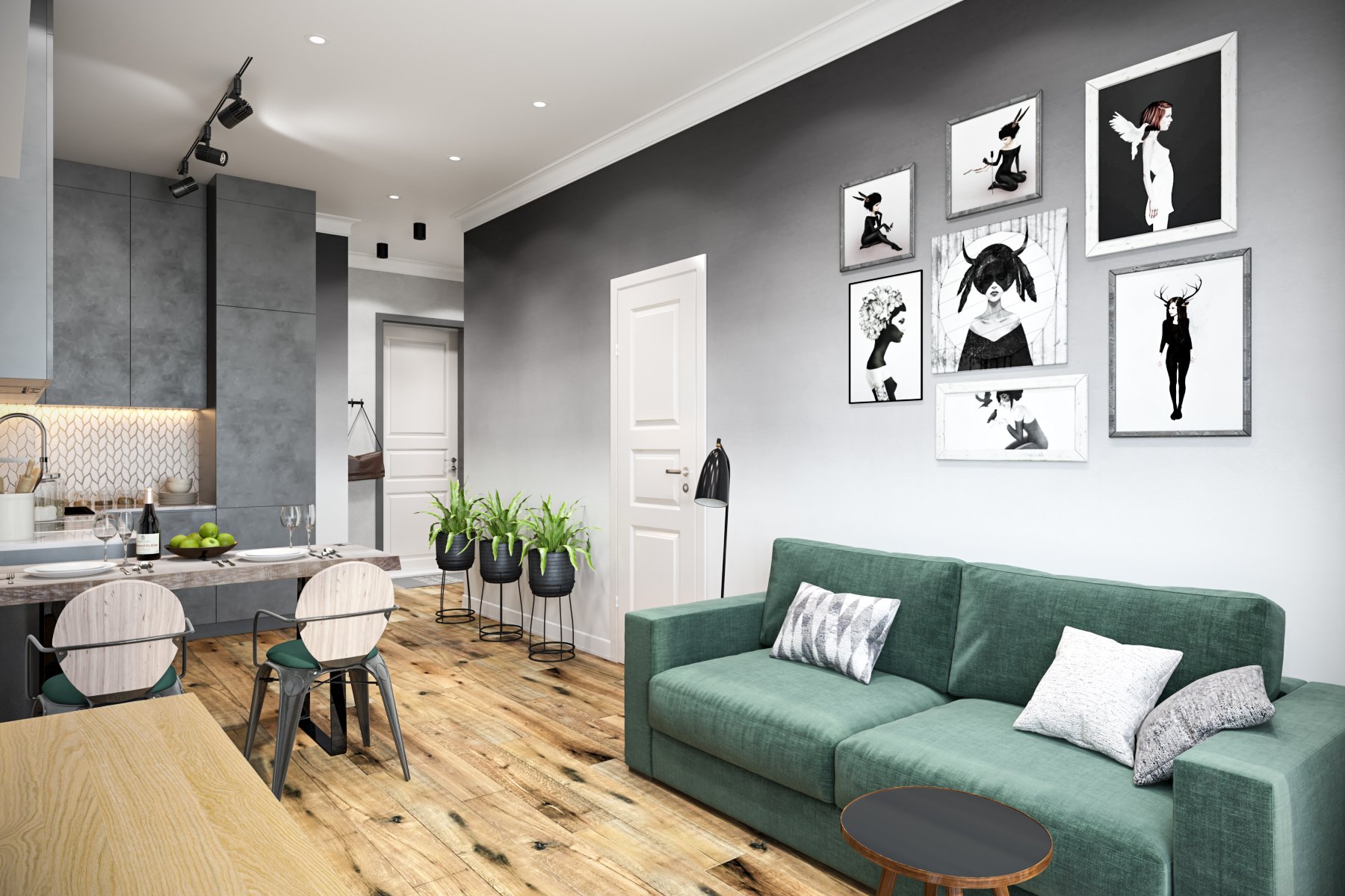 Серый интерьер с зелеными акцентами