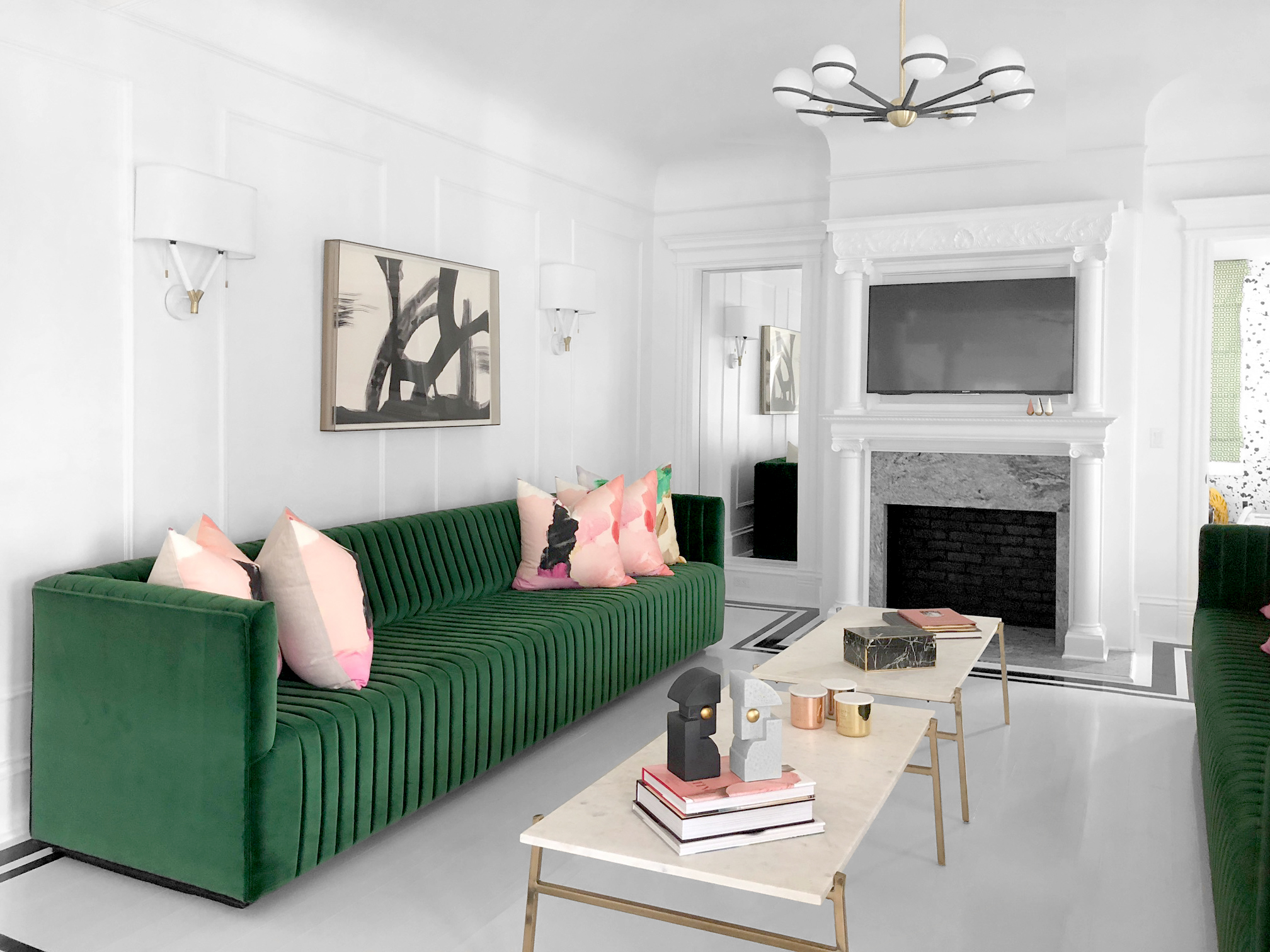 Гостиная с зеленым диваном