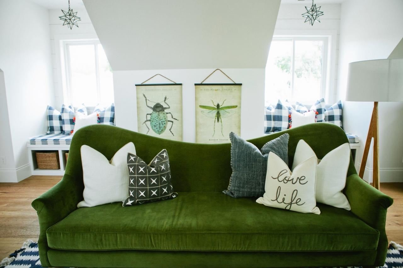 Зеленый диван с подушками