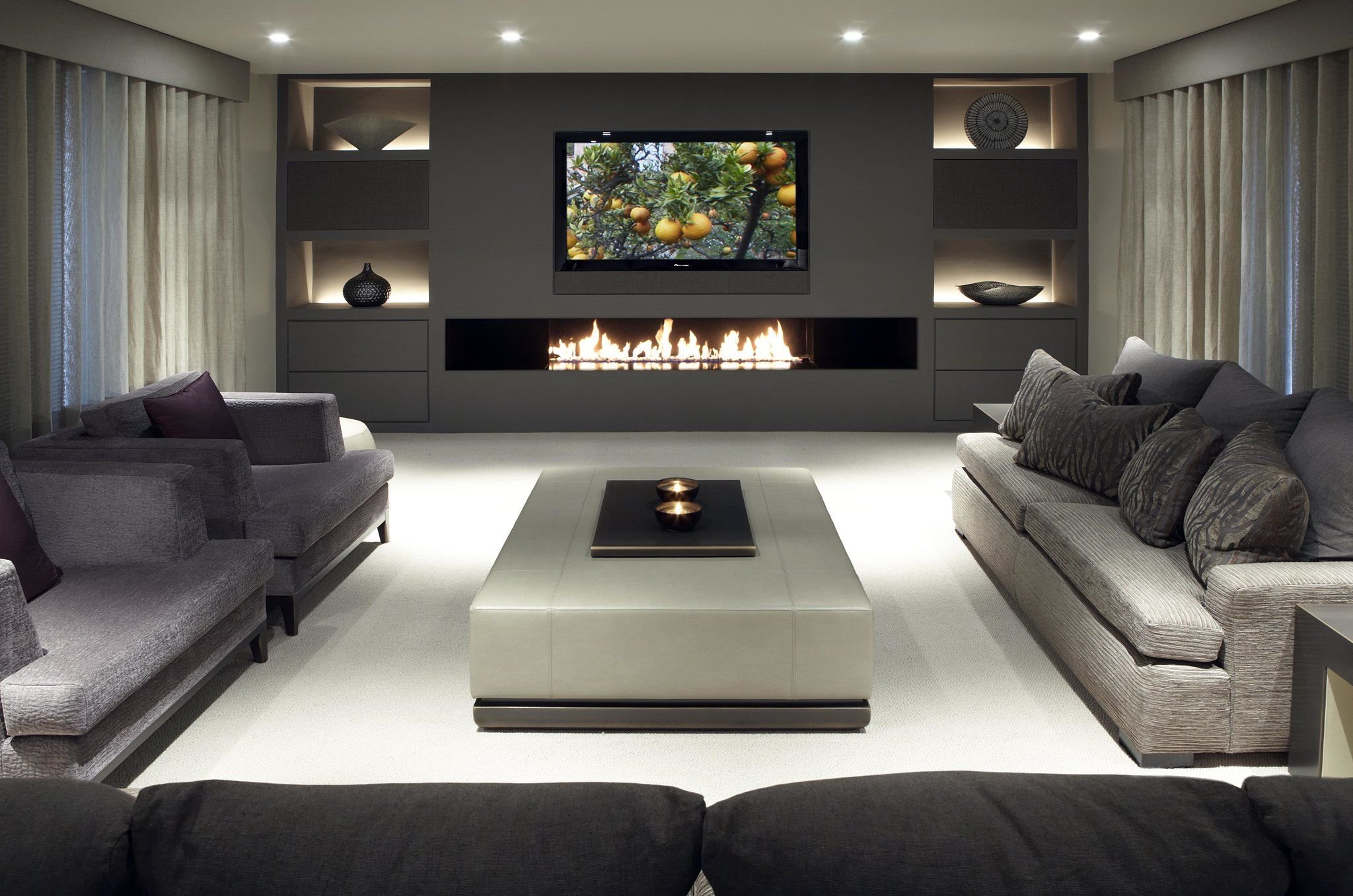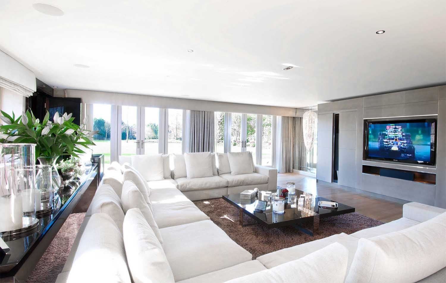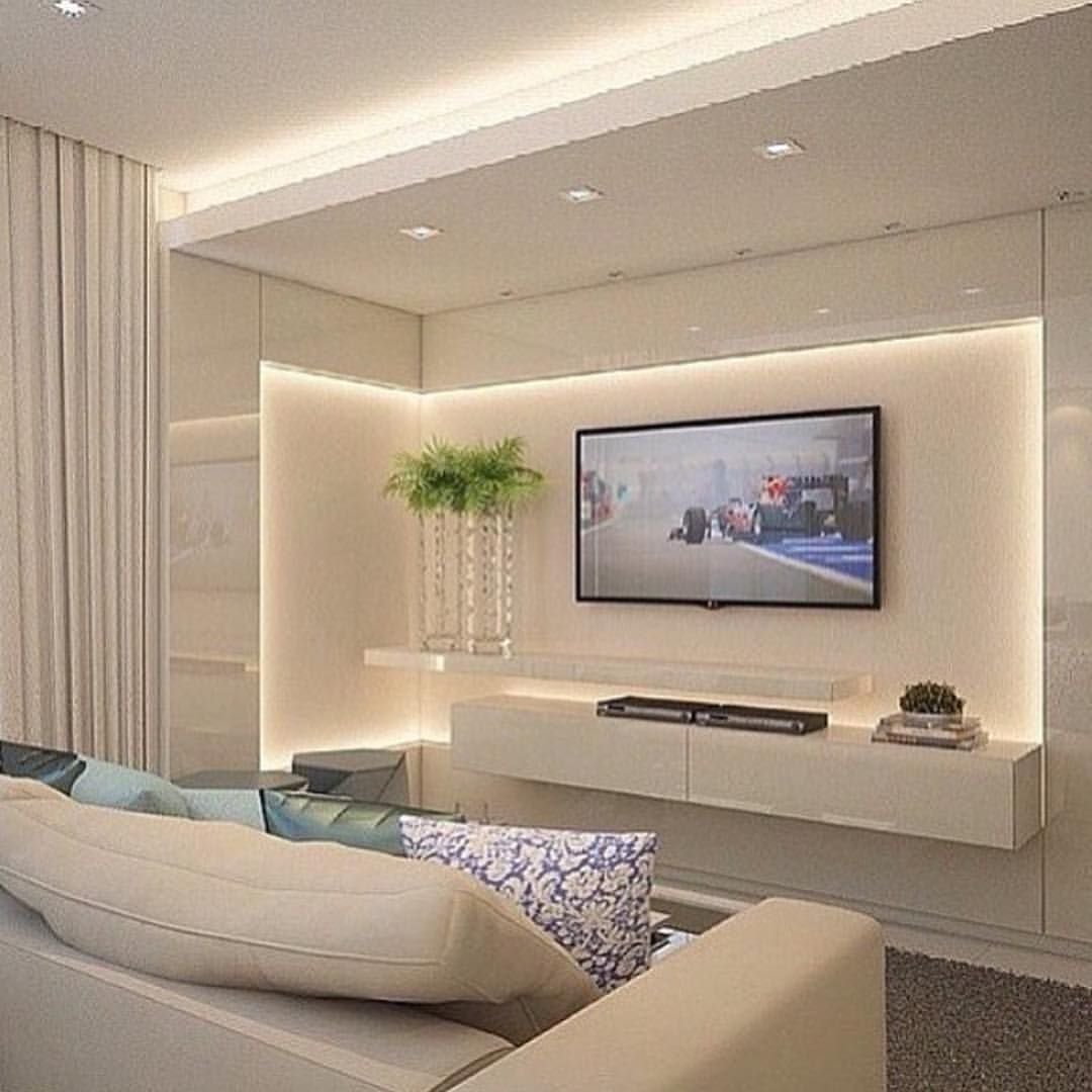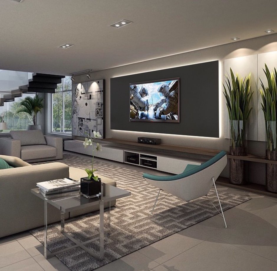 Современный интерьер гостиной с большим телевизорам