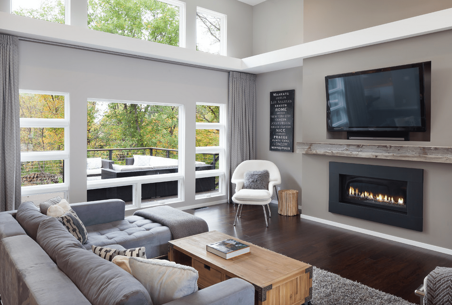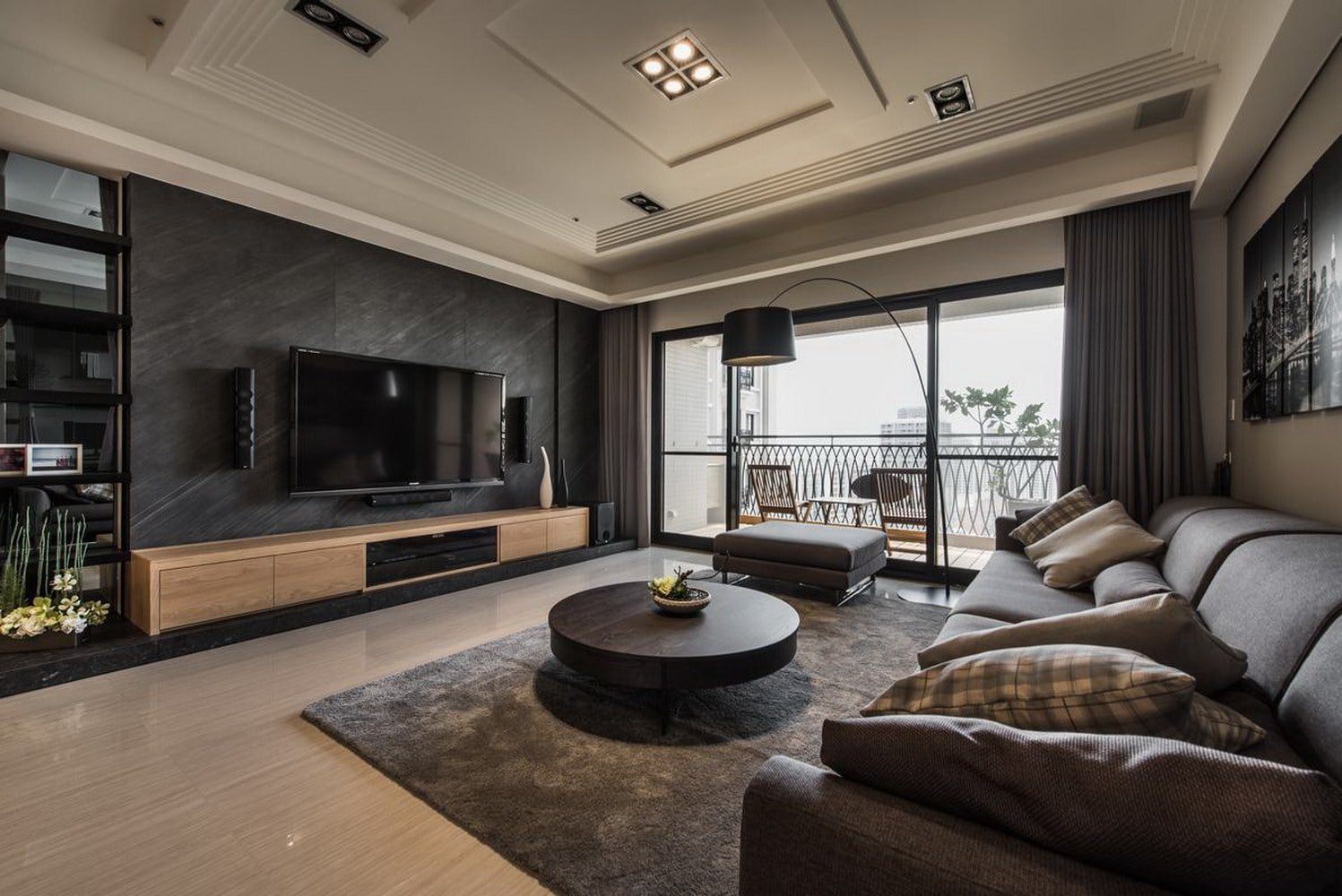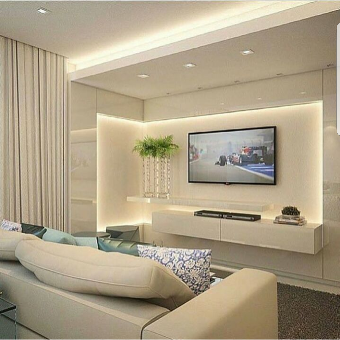 Современный интерьер гостиной с большим телевизорам