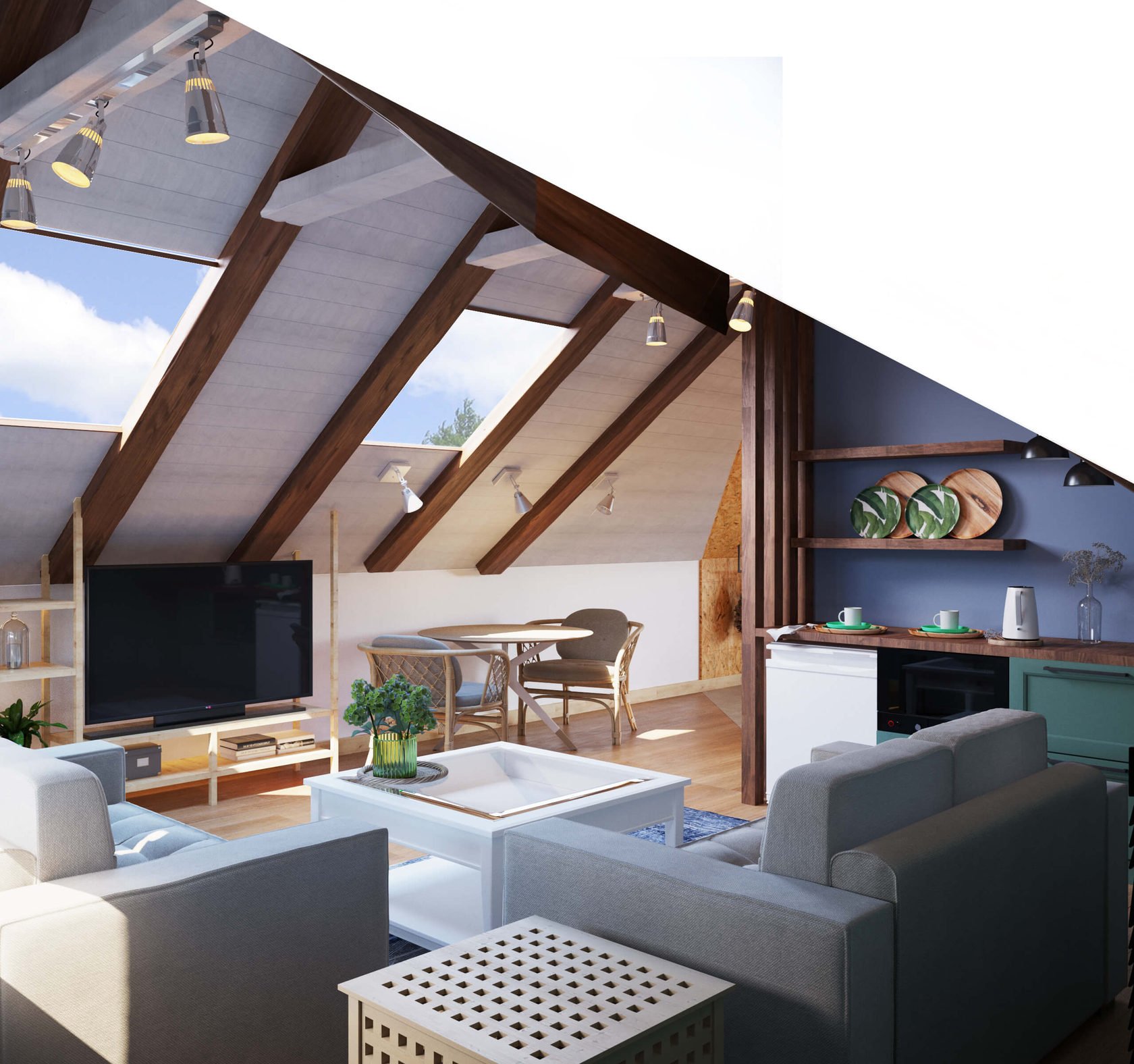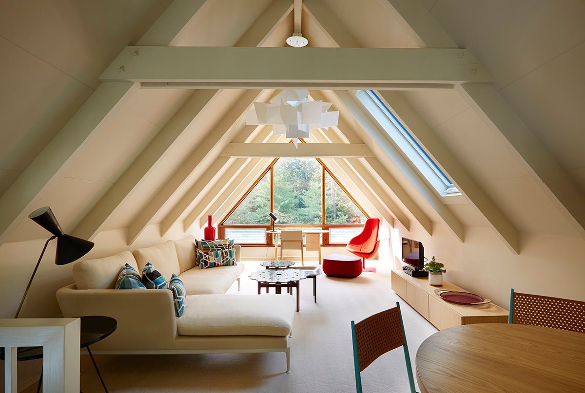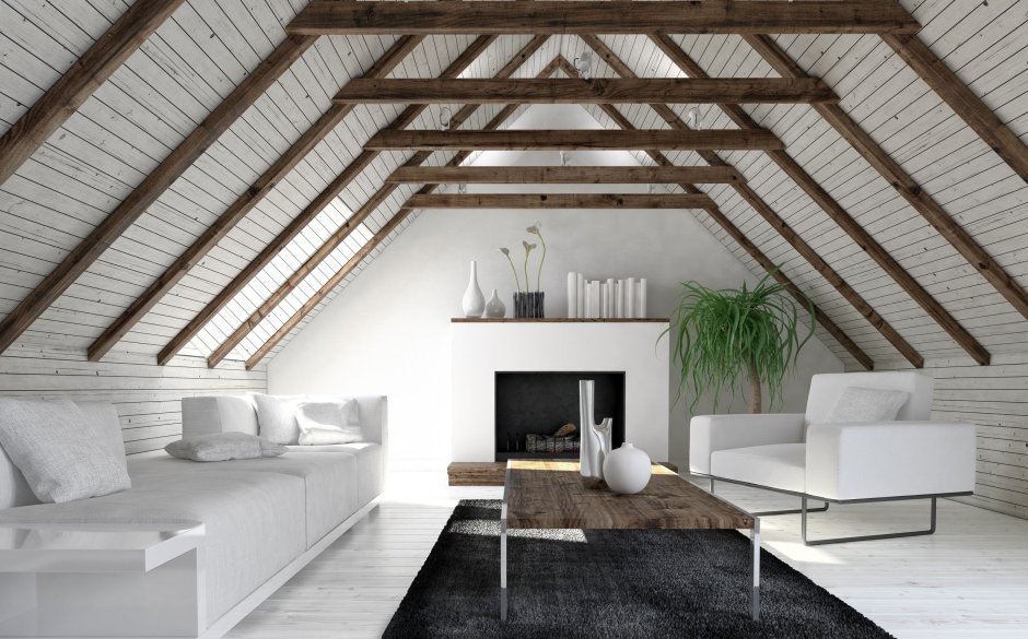 Интерьер мансарды под двускатной крышей