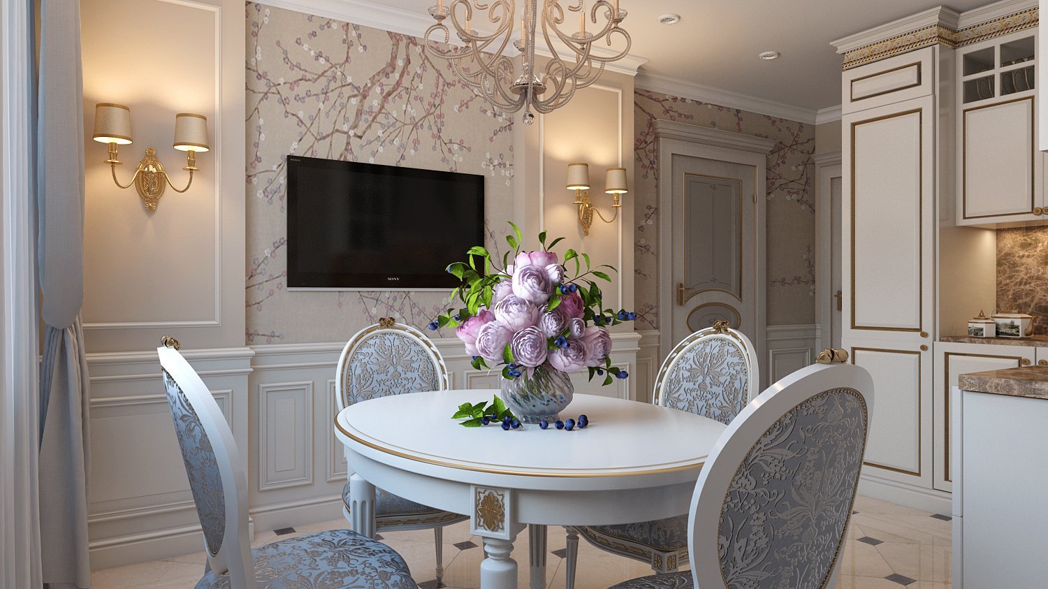Обои в интерьере классической кухни