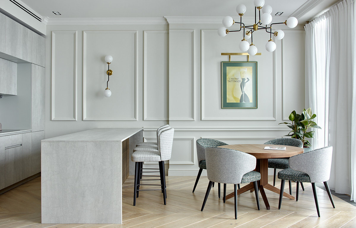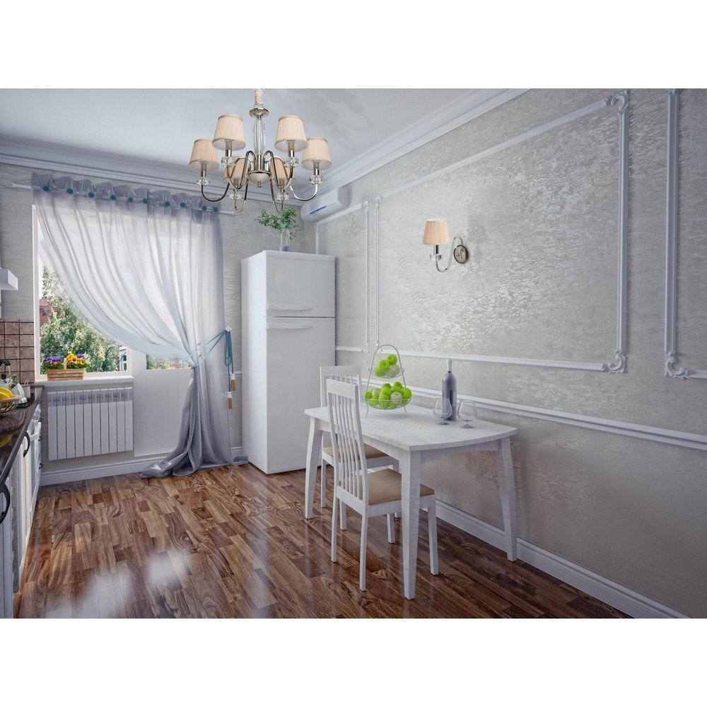 Молдинги в интерьере кухни у стола