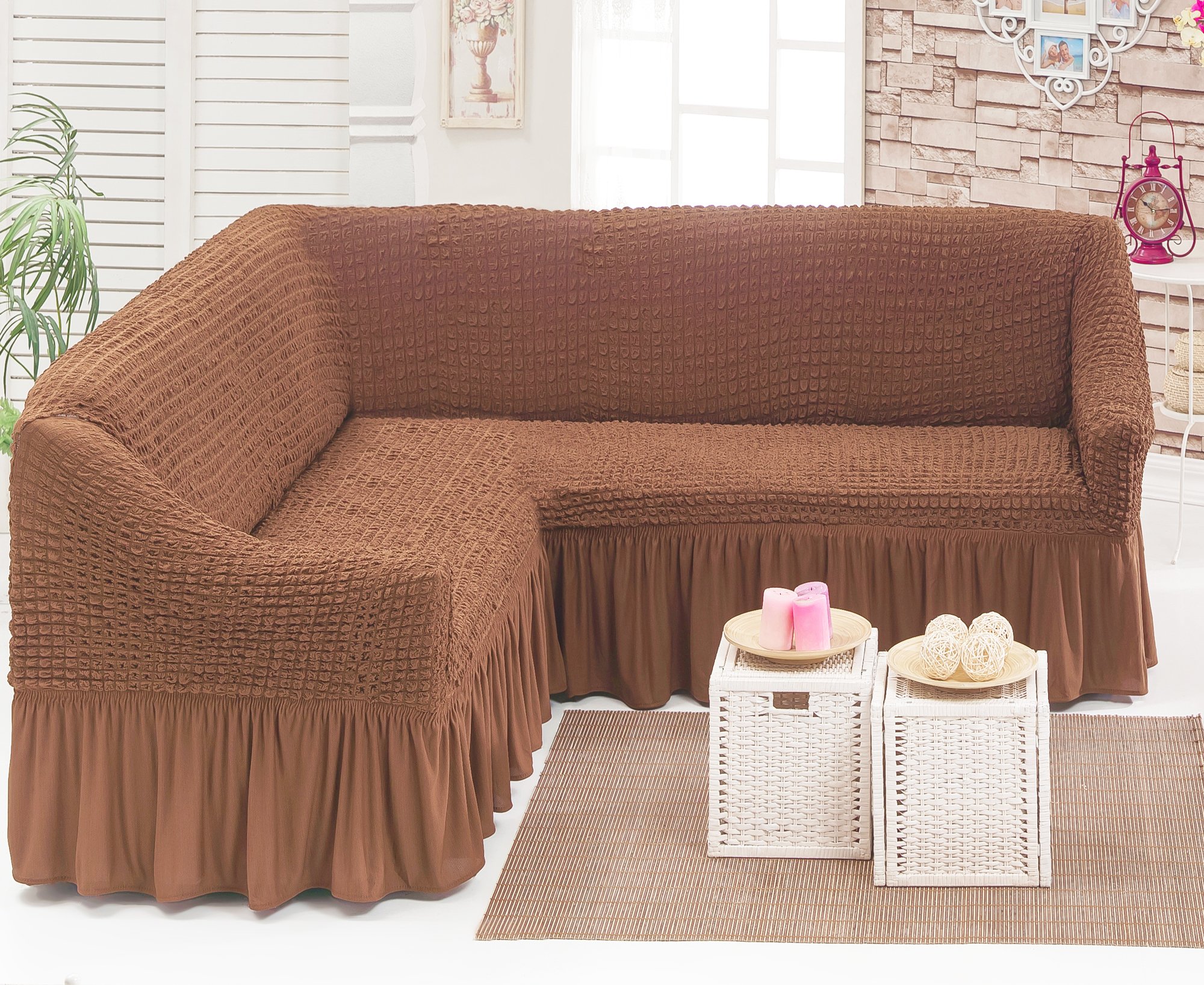 Чехол на угловой диван с юбкой, цвет капучино (жатка)