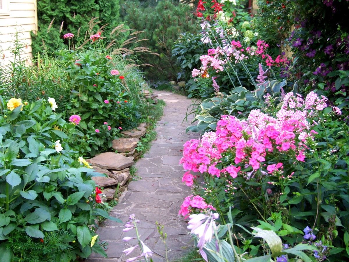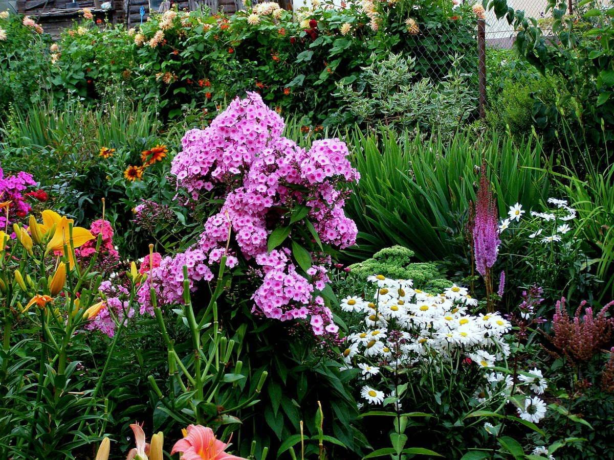 Клумба с флоксами, пионом и хостой