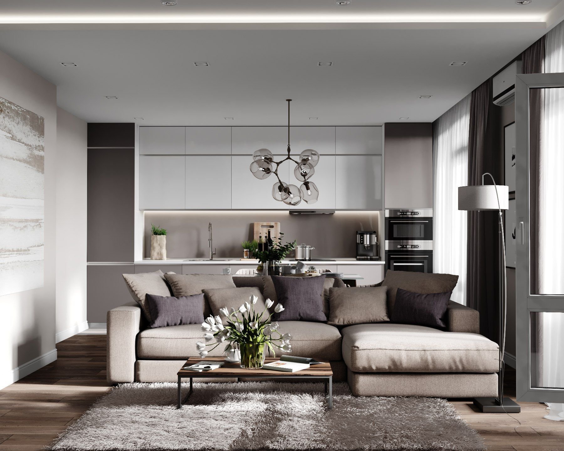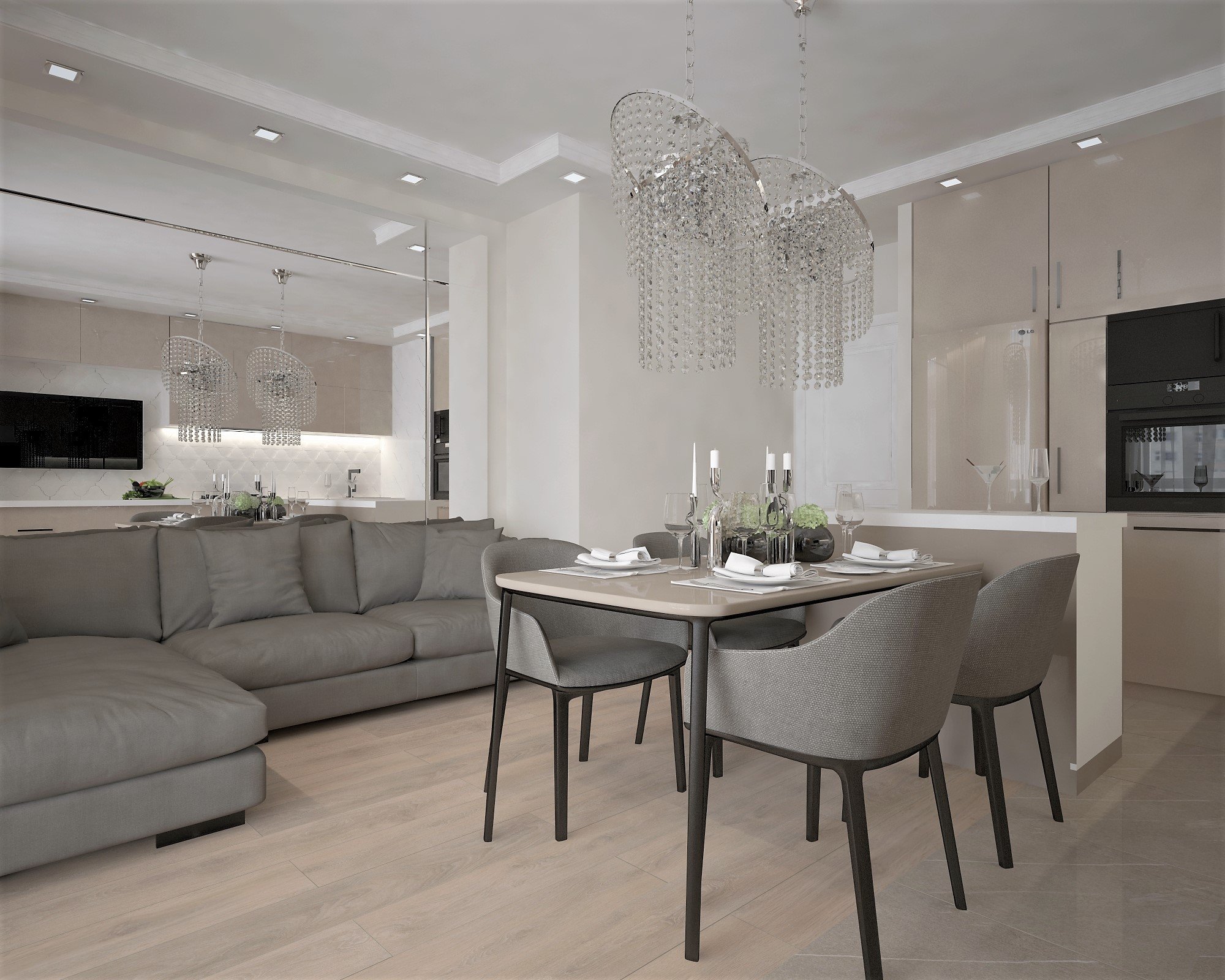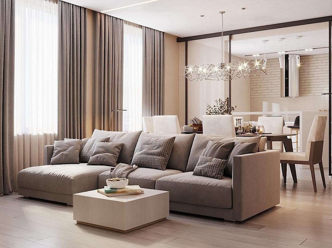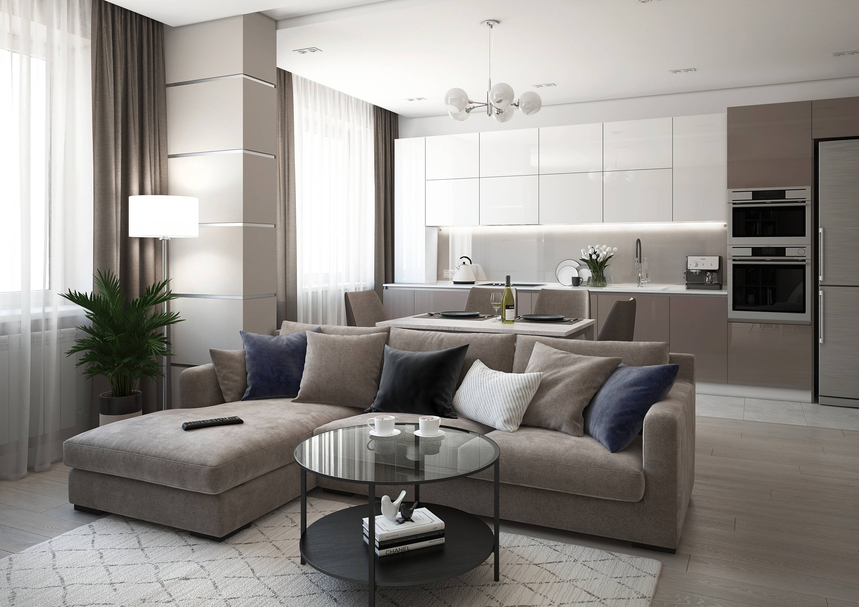 Кухня-гостиная в серо-бежевых тонах