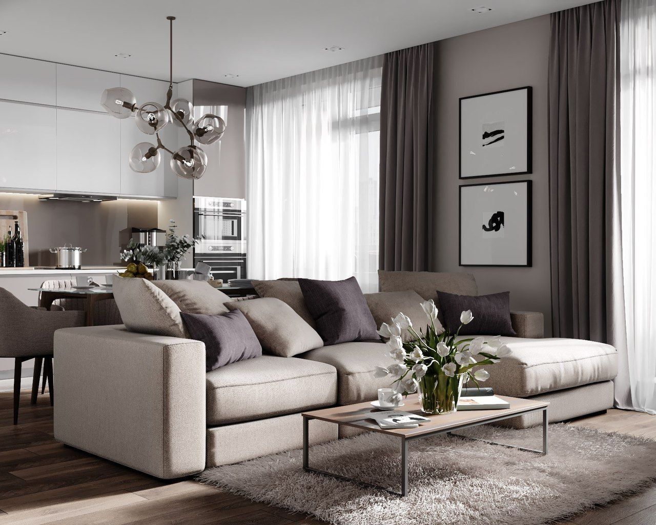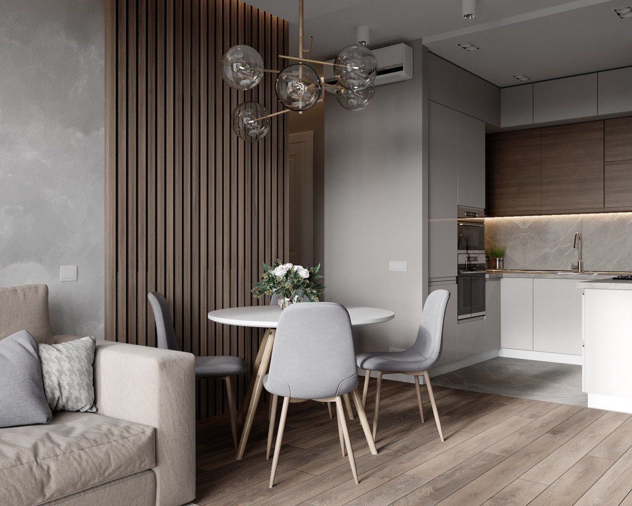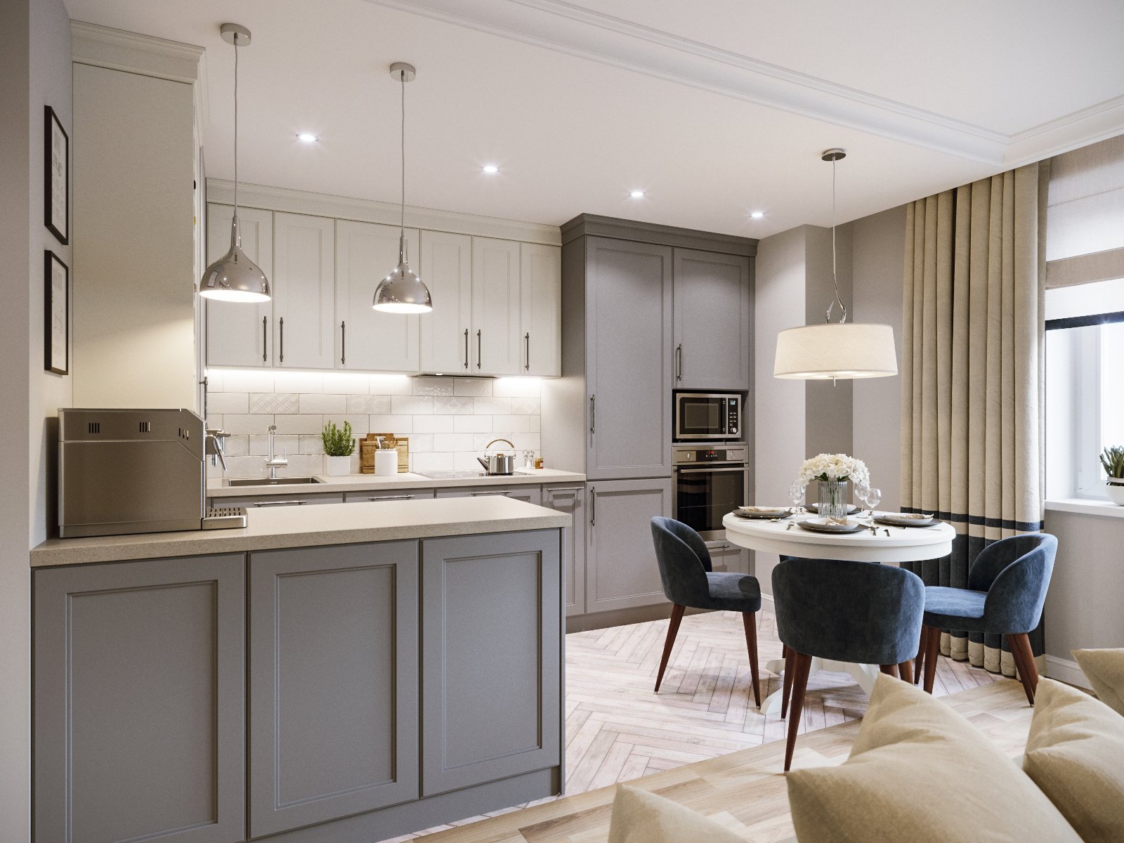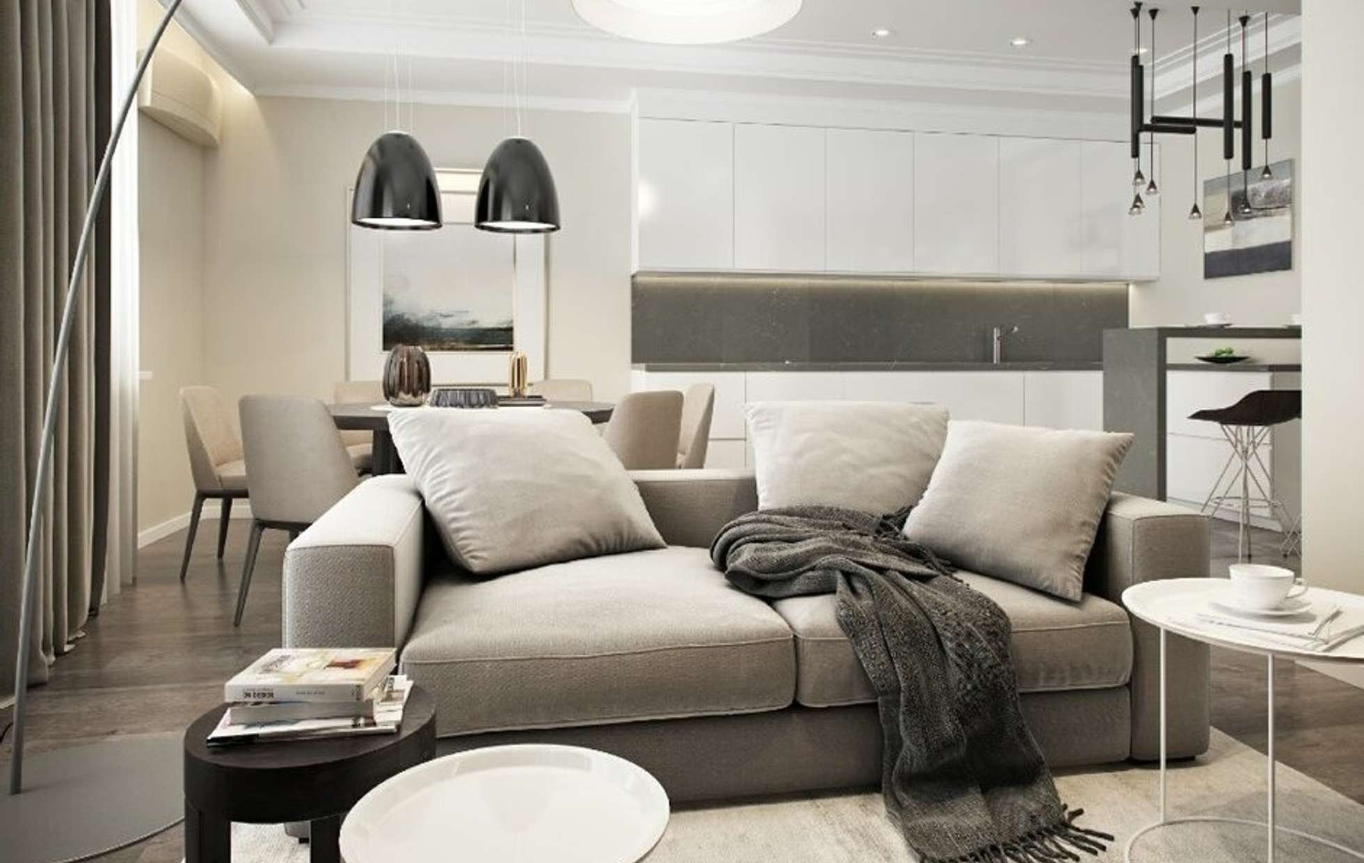 Кухня-гостиная в серо-бежевых тонах