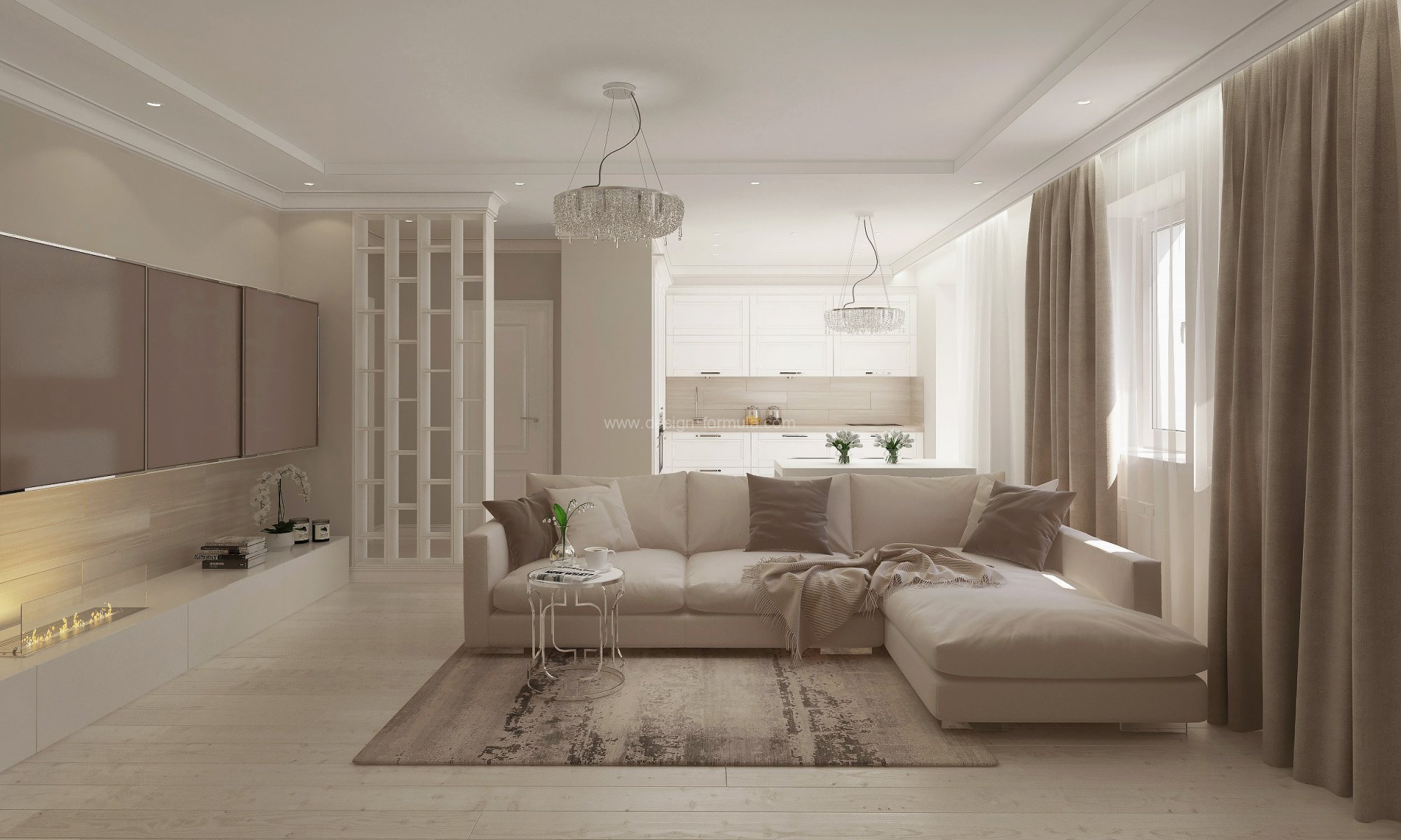 Бело бежевая кухня гостиная