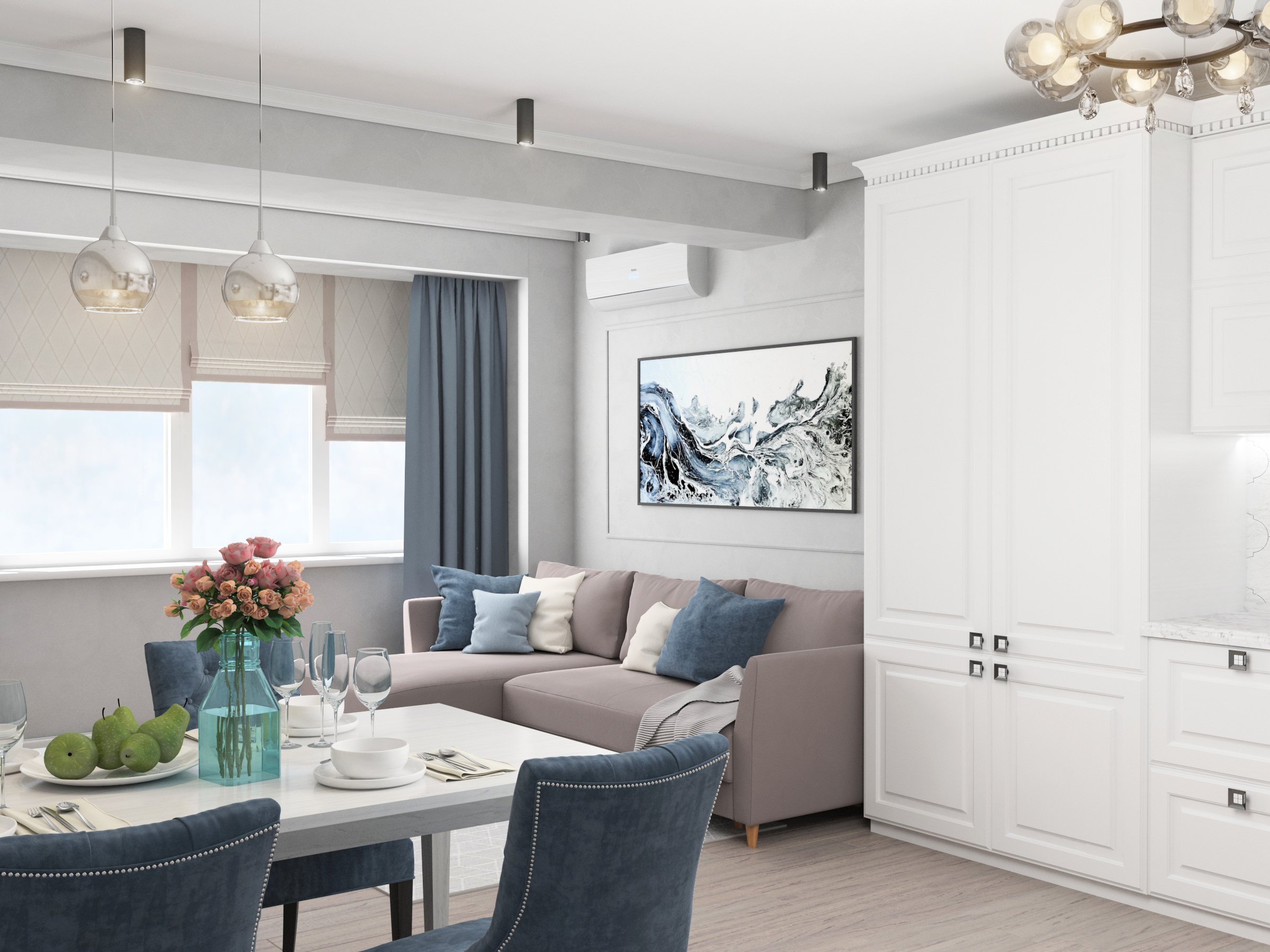 Кухня гостиная в голубых тонах