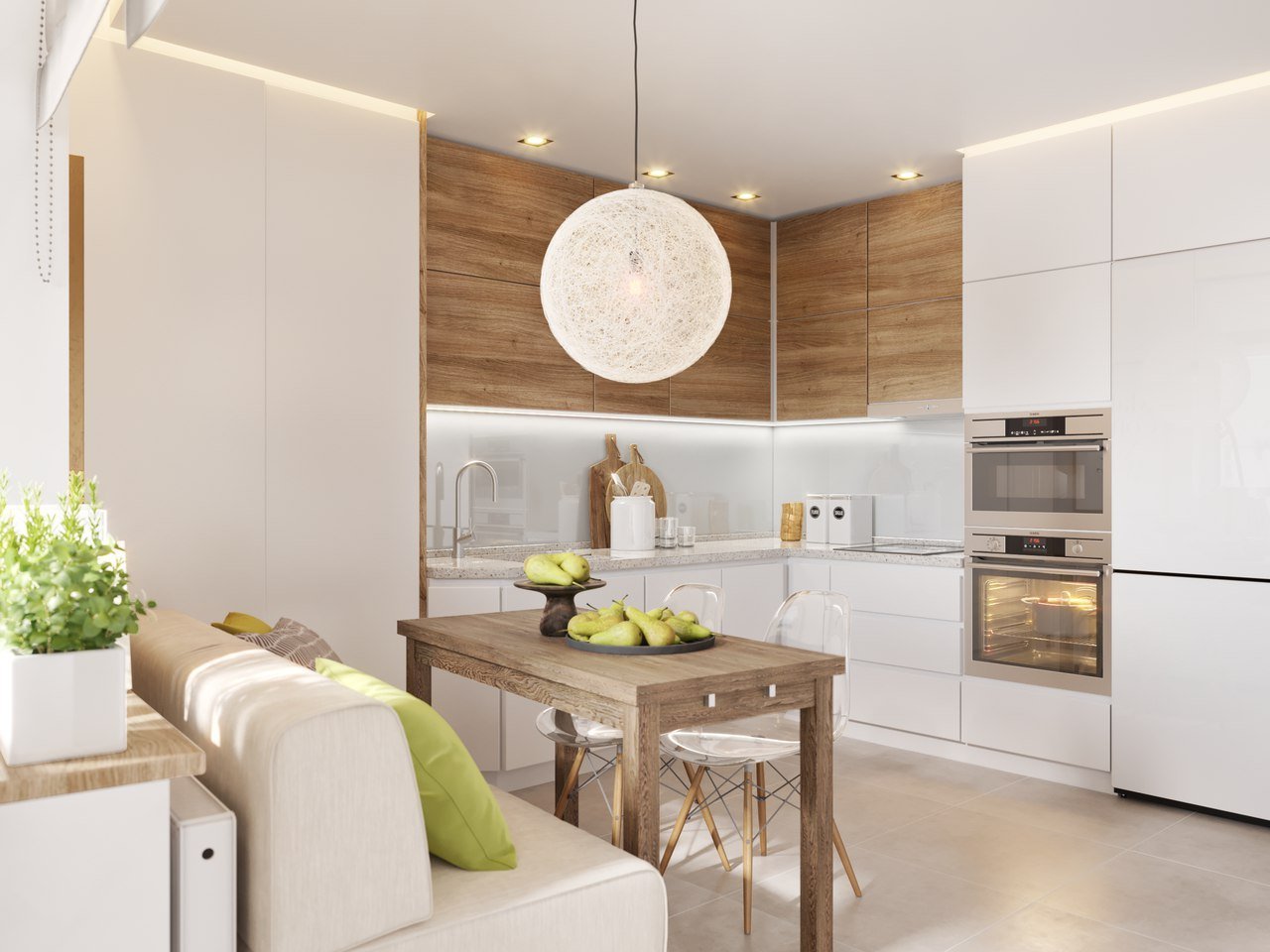 Кухня гостиная в светлых тонах в современном стиле