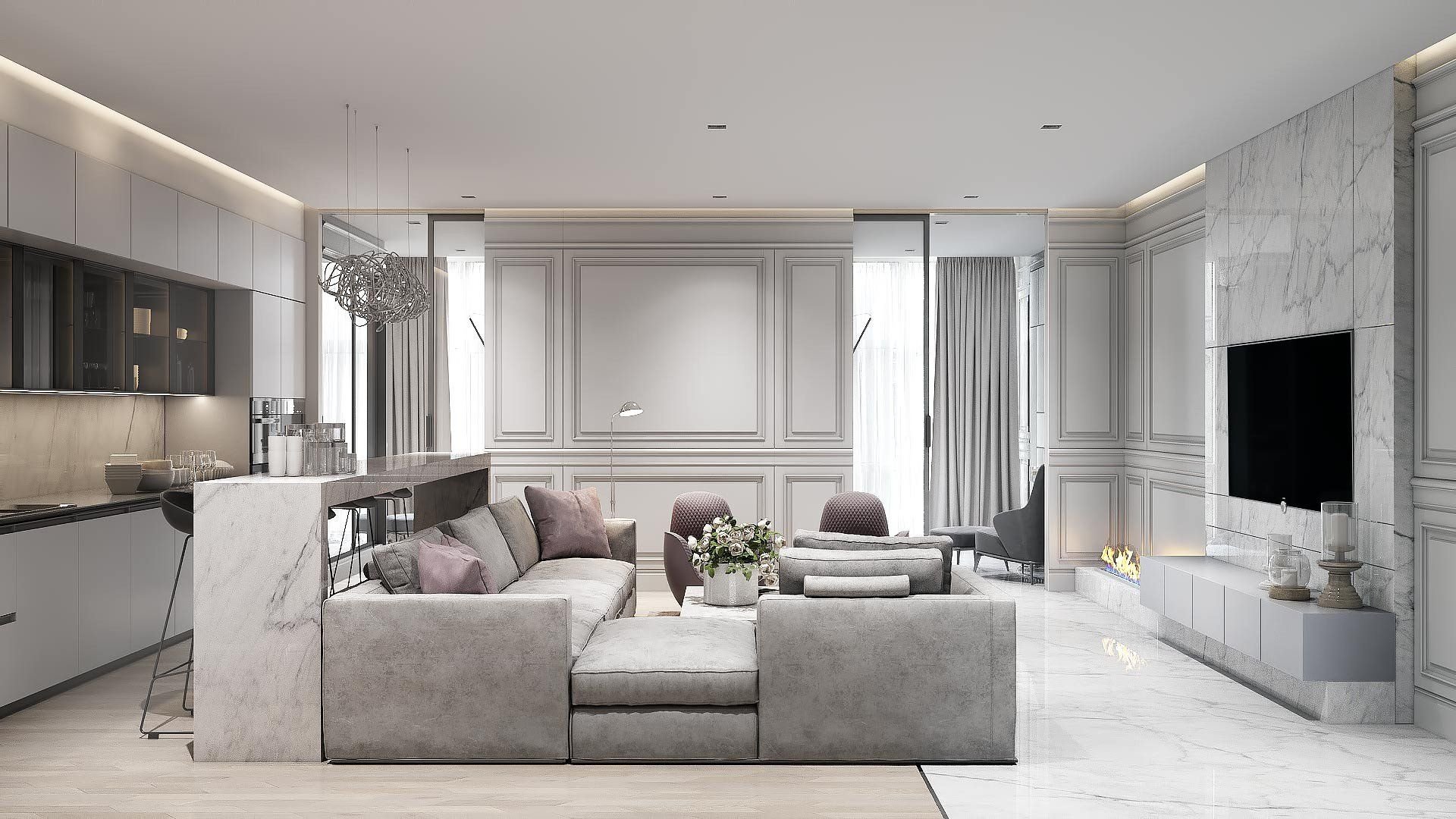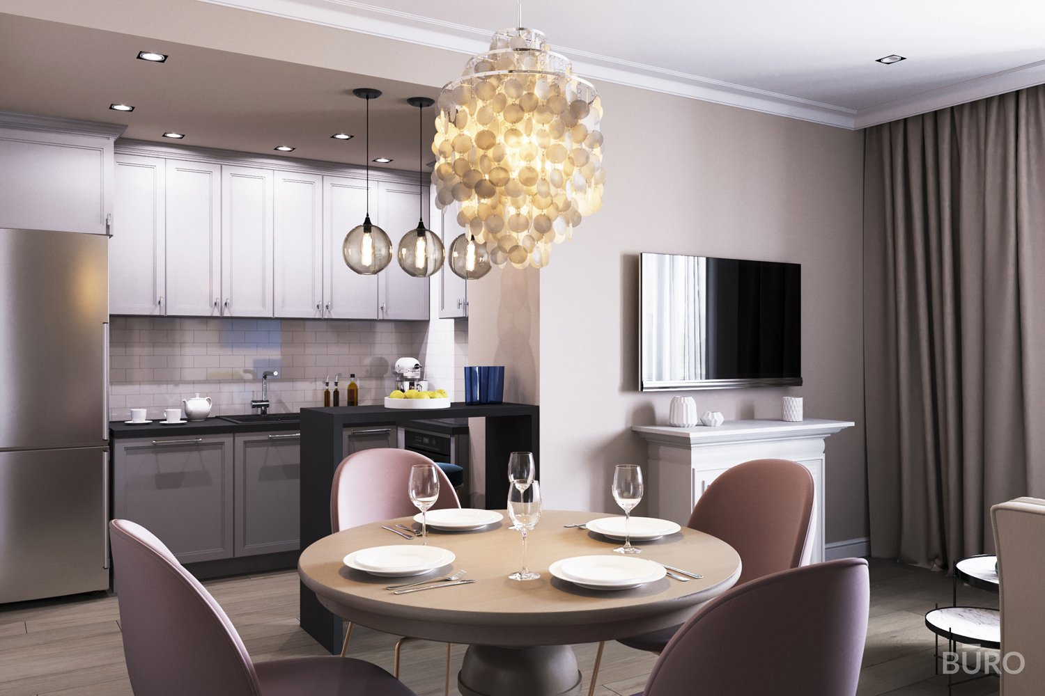Серо розовая кухня гостиная