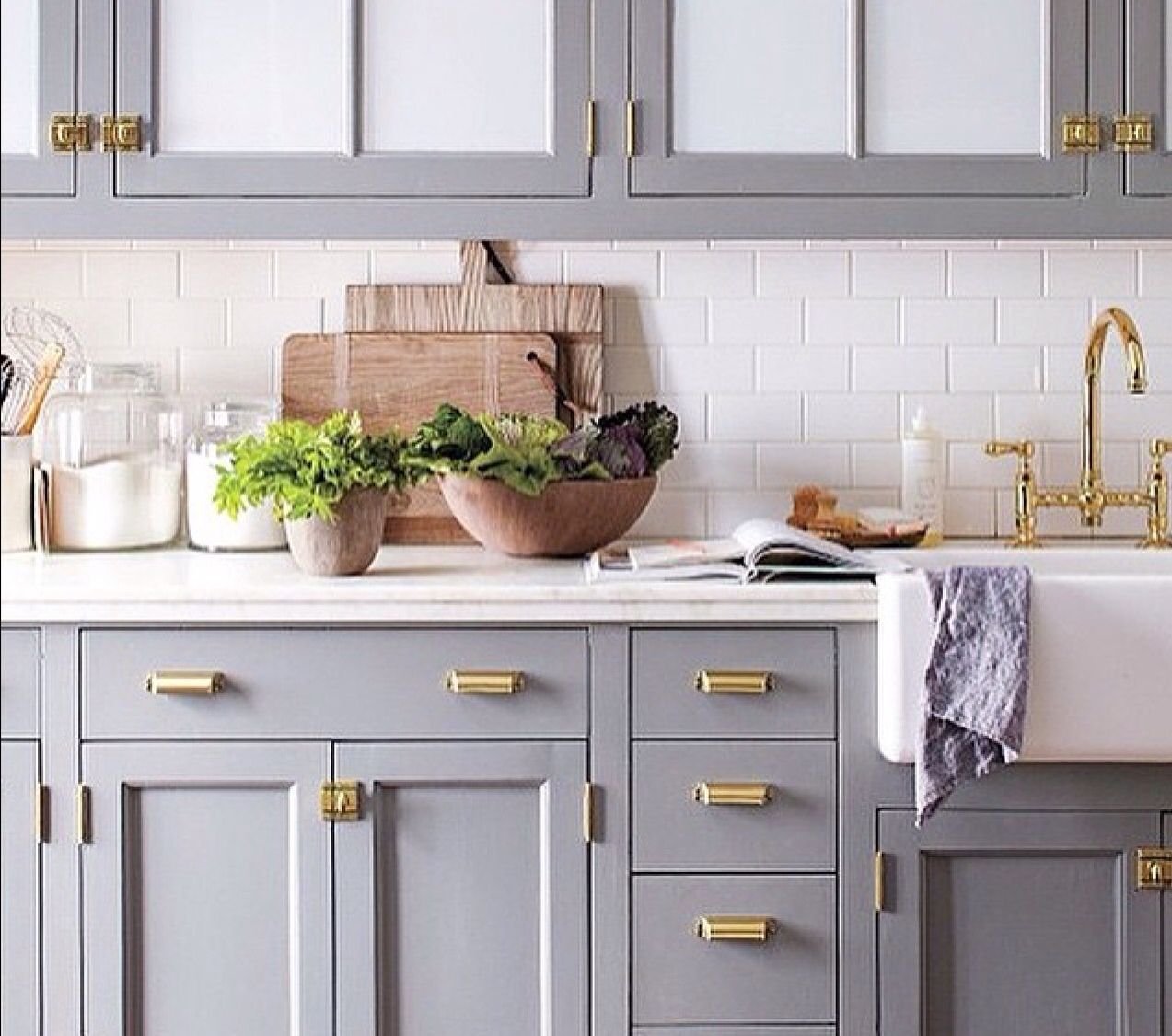 Серая кухня с бронзовыми ручками