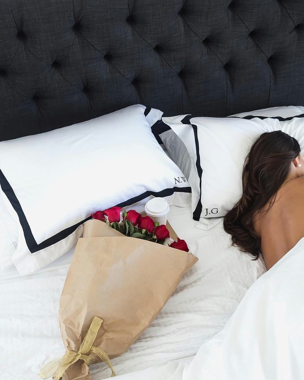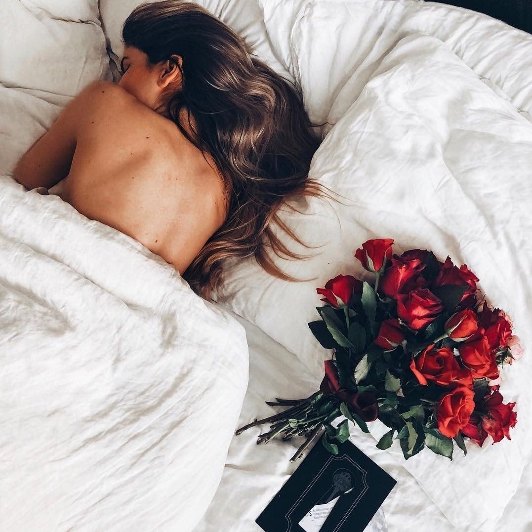 Девушка в постели с цветами