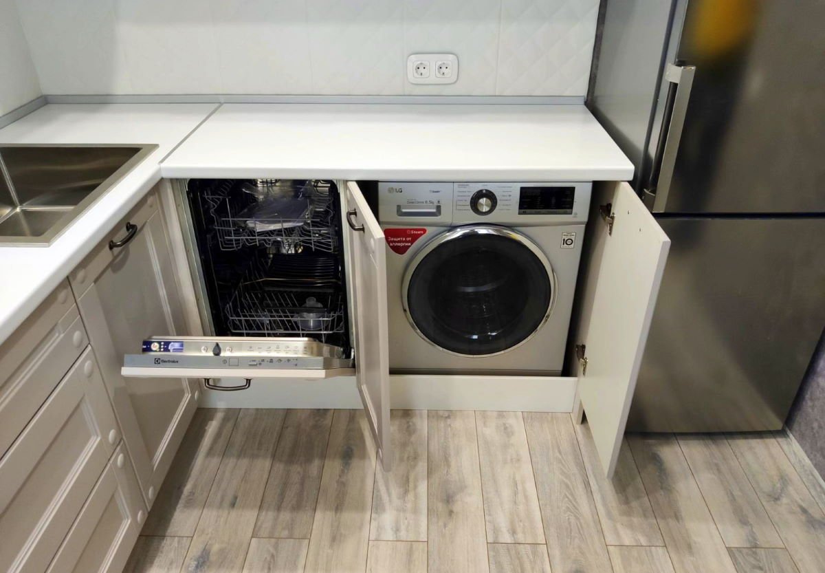 Стиральная машинка на кухне под столешницей
