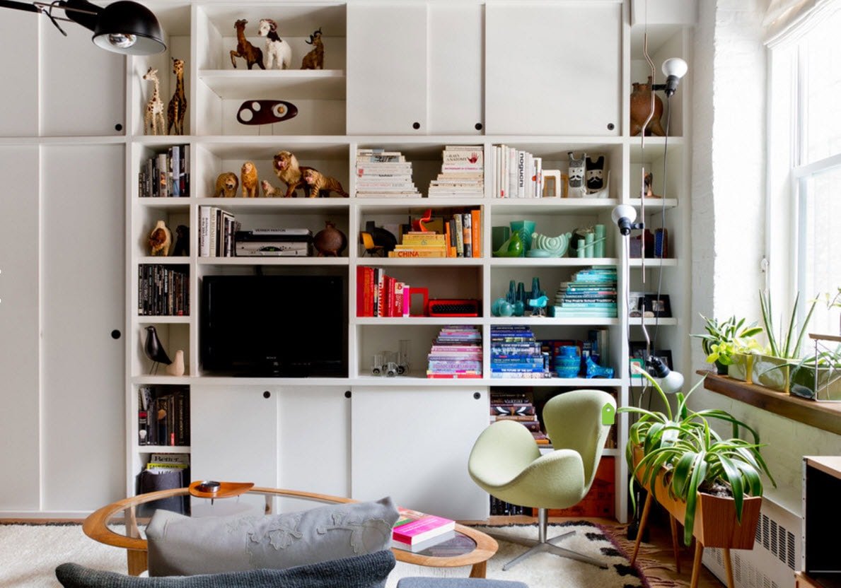 Стеллаж в интерьере гостиной
