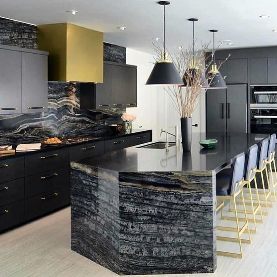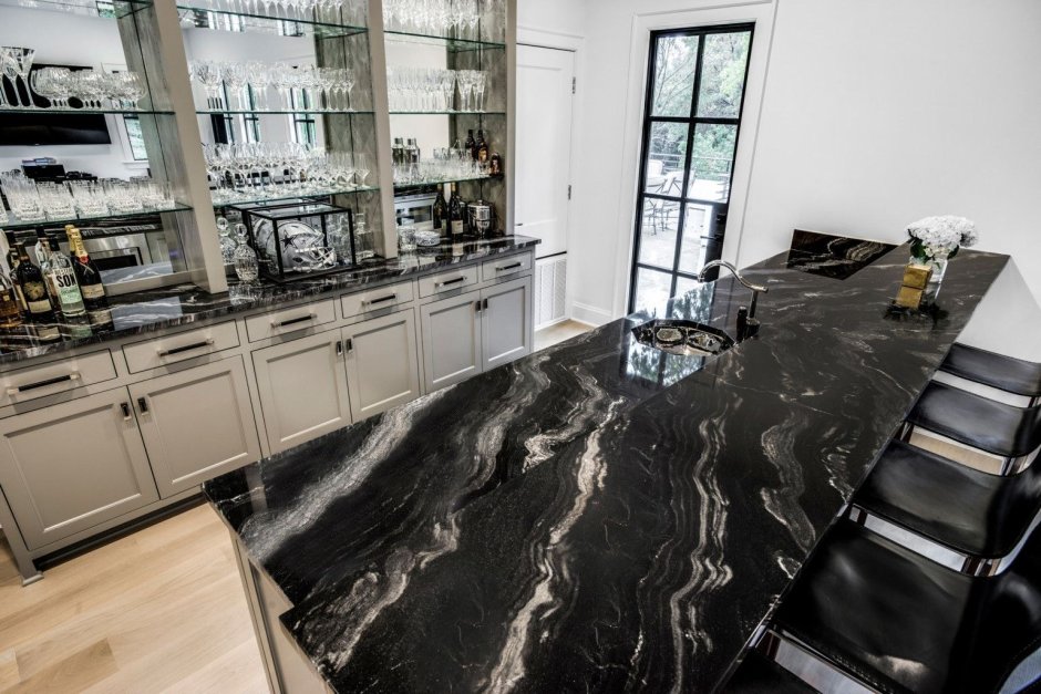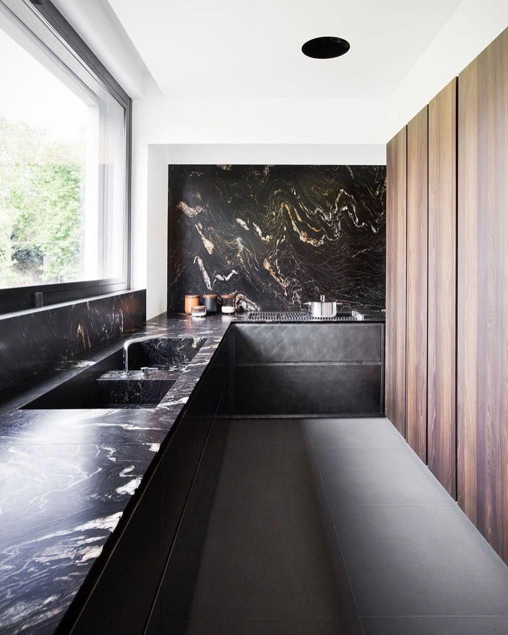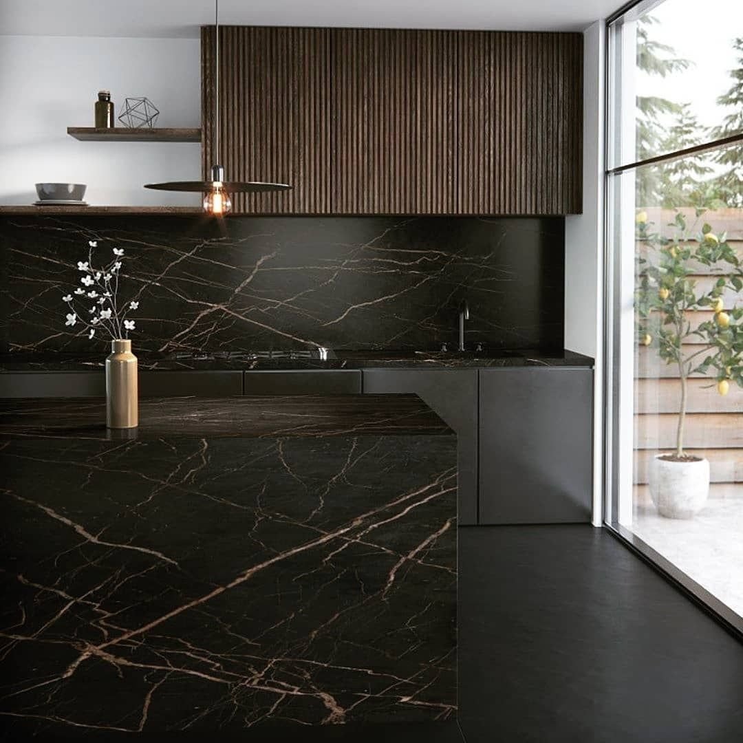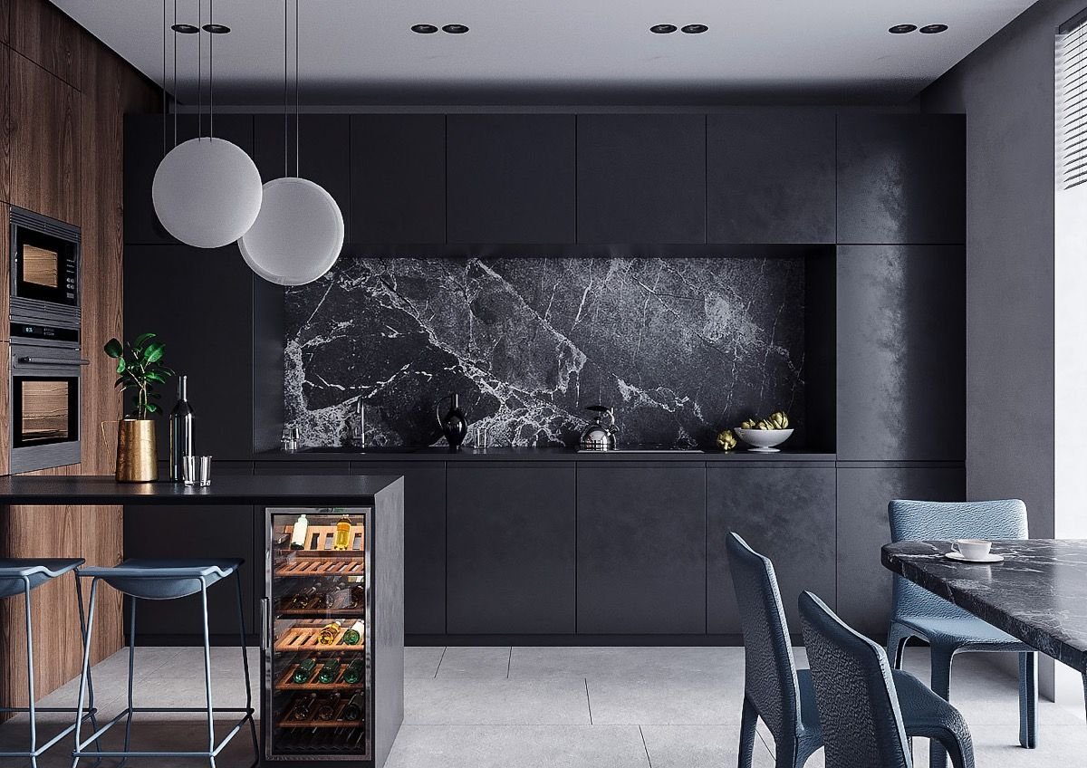 Интерьер кухни черный мрамор и дерево