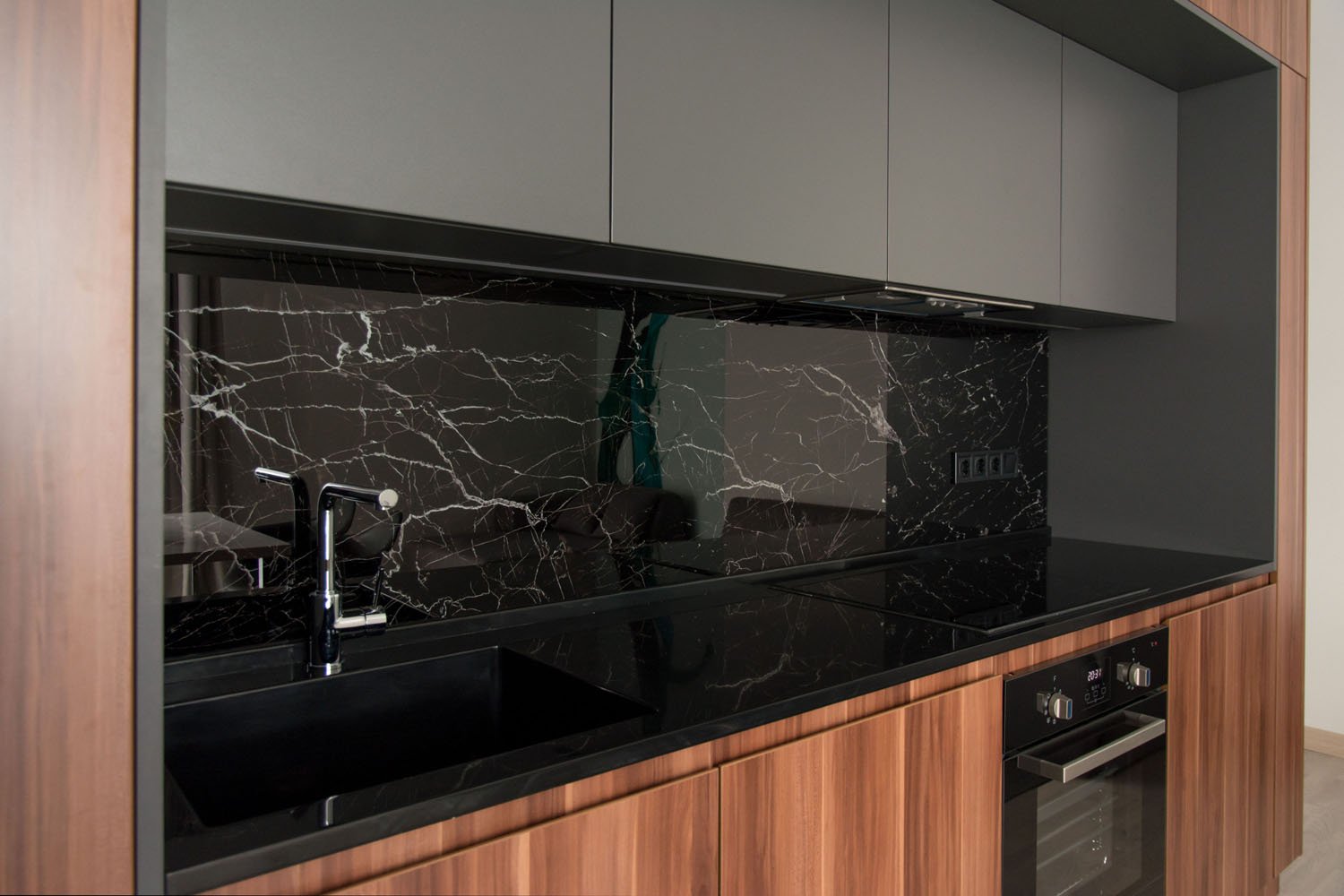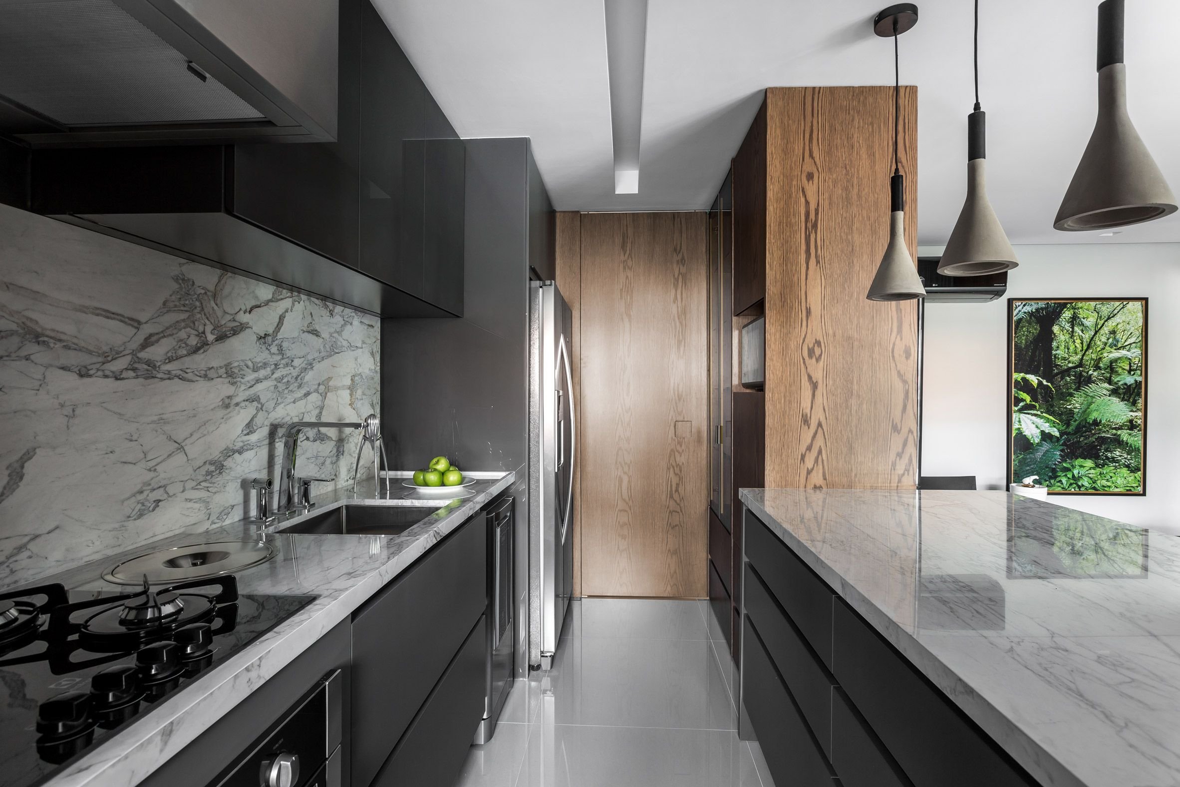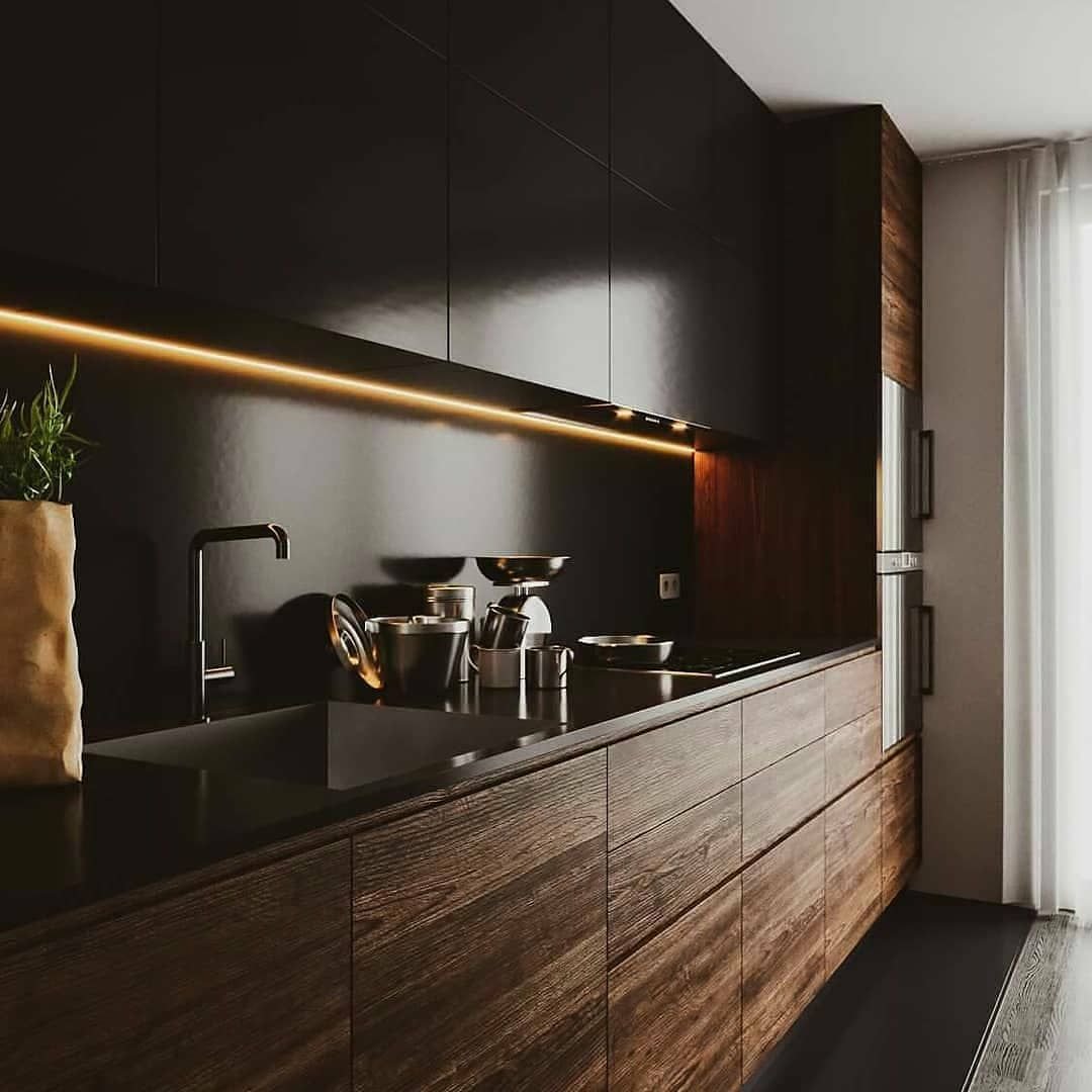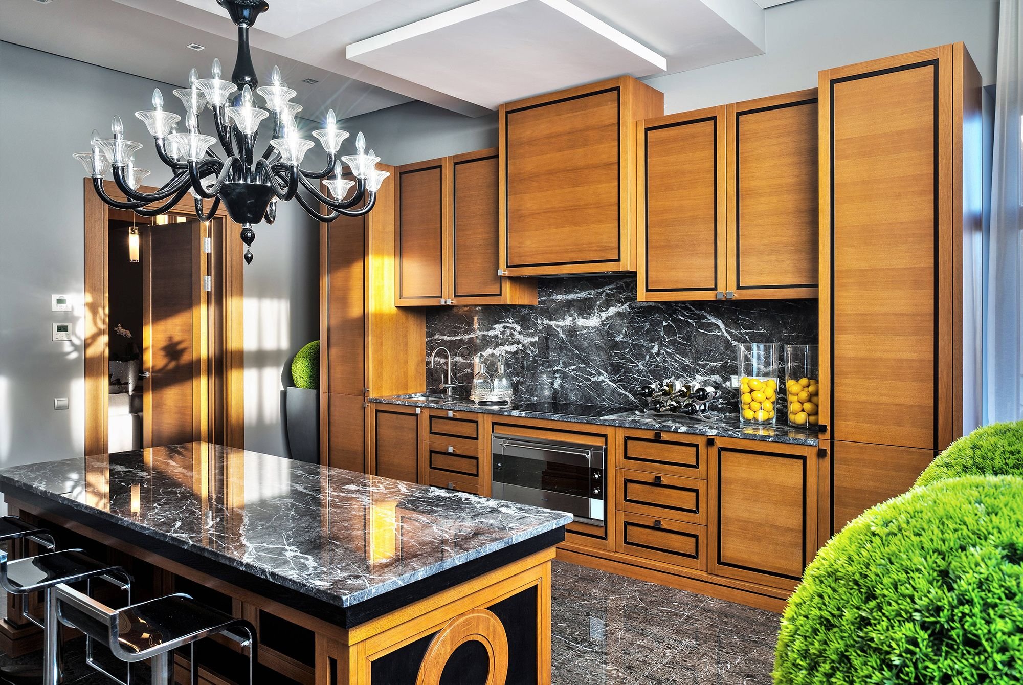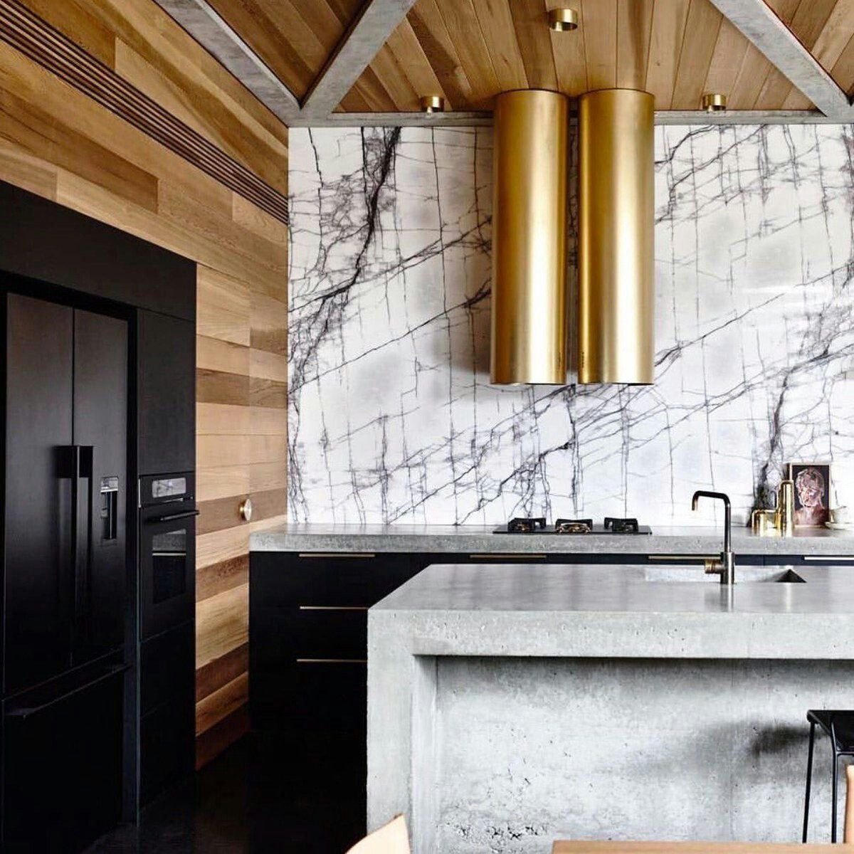 Интерьер кухни черный мрамор и дерево