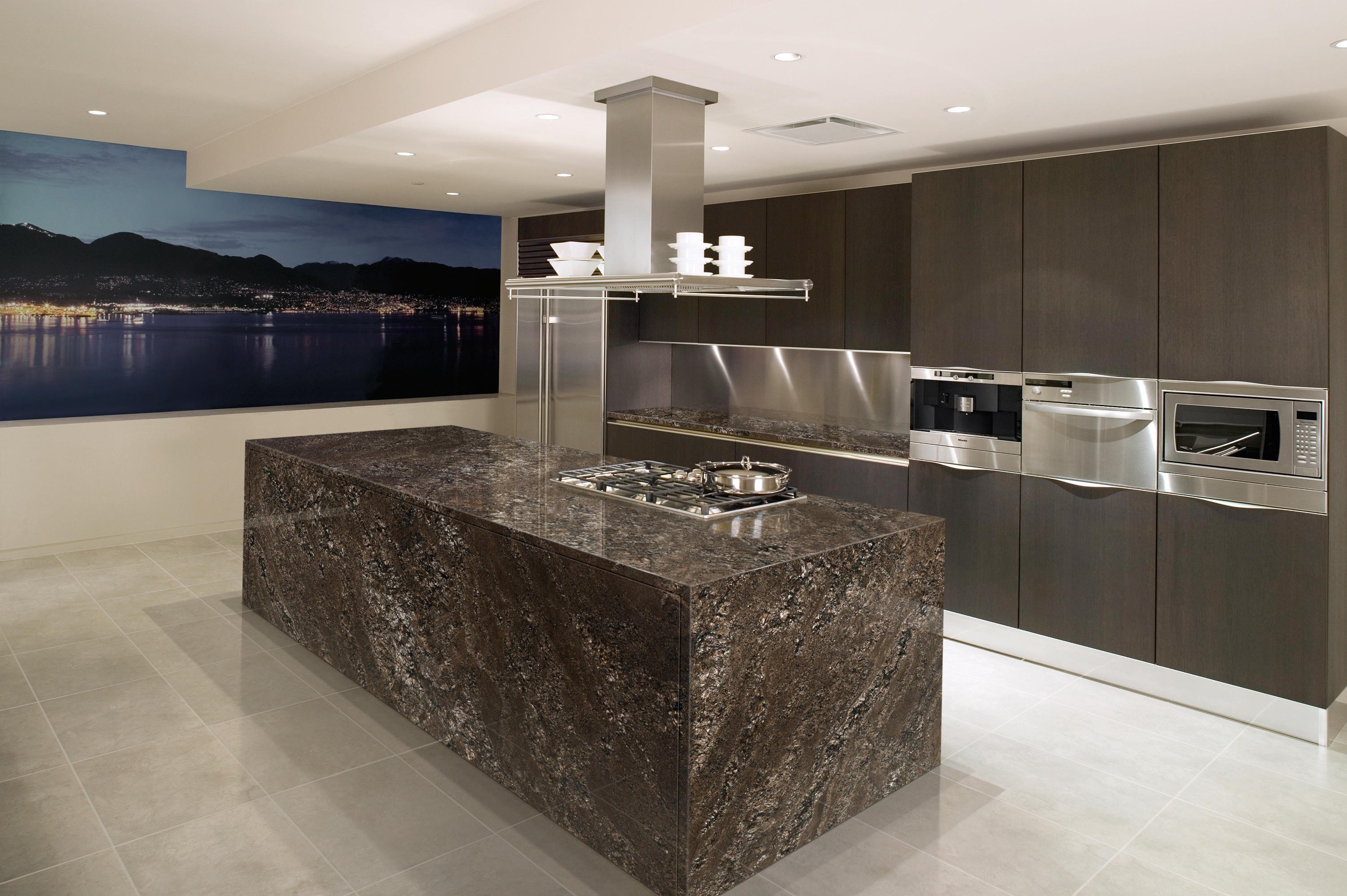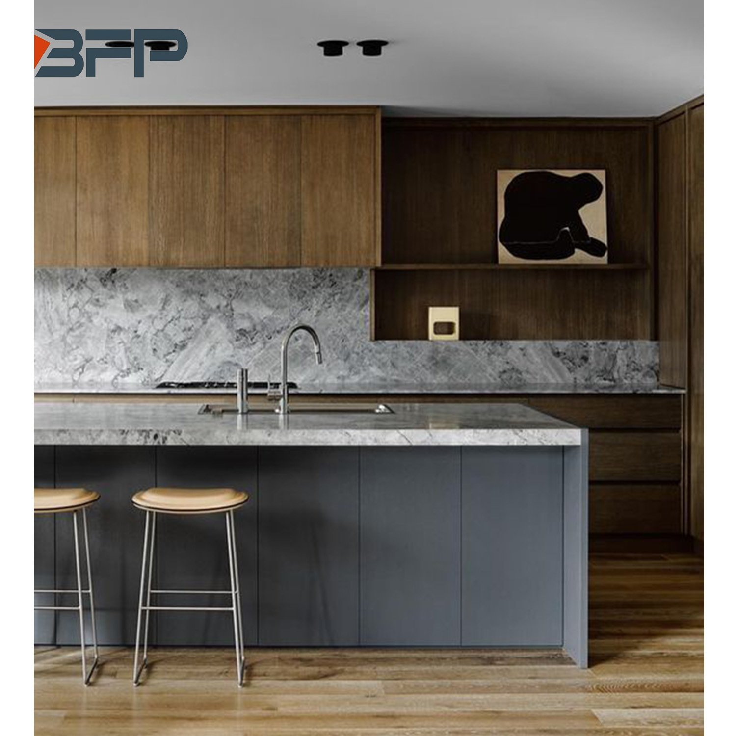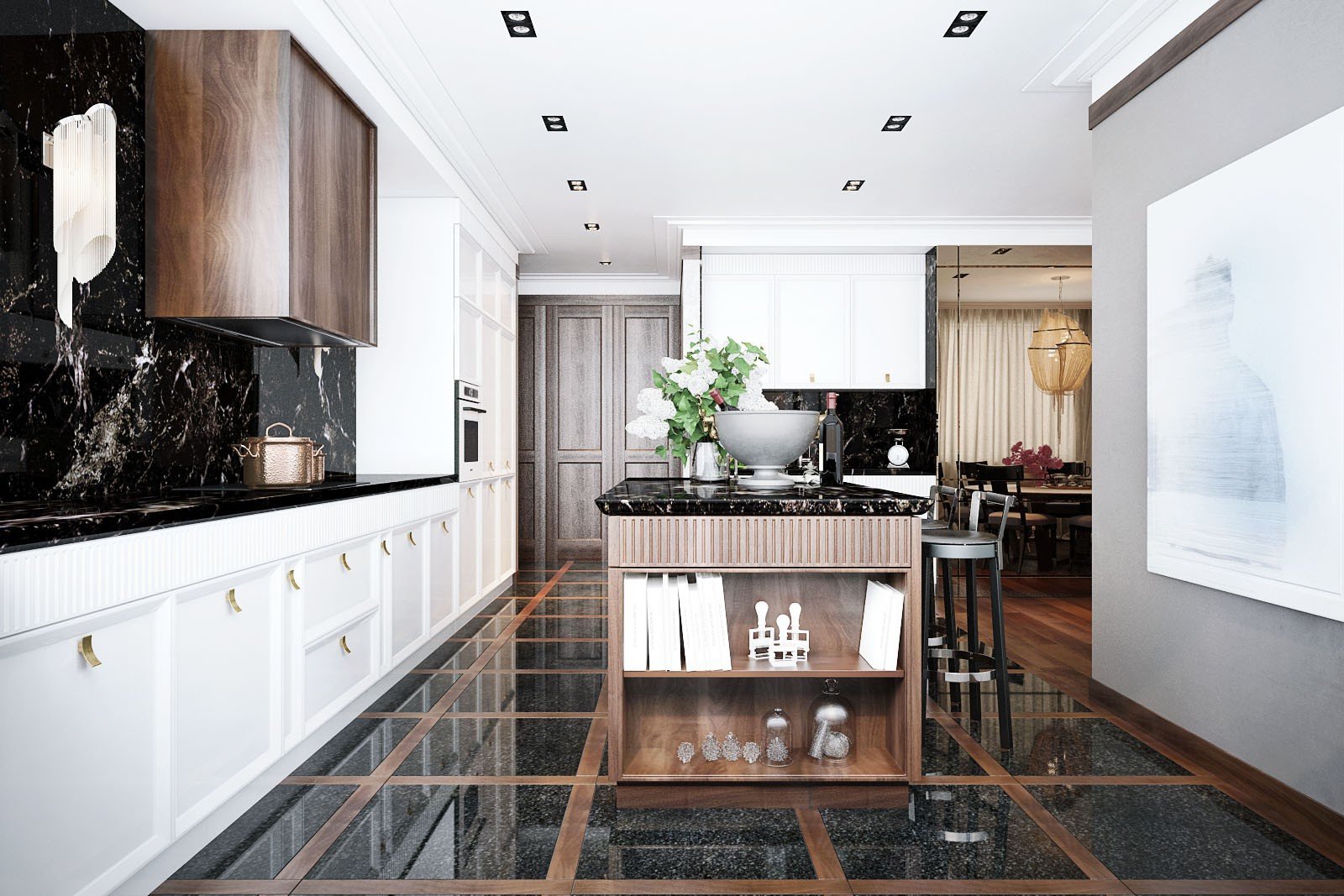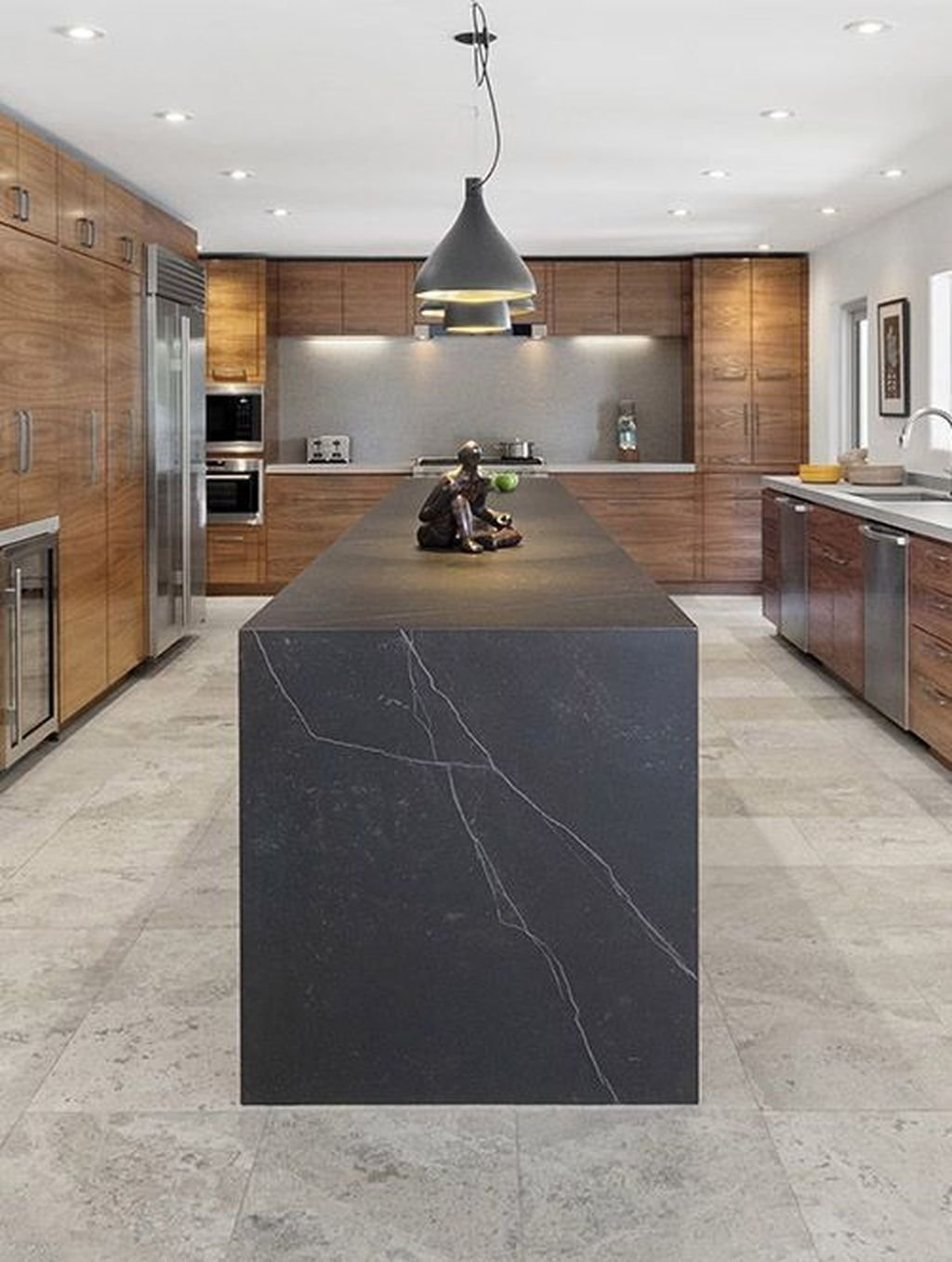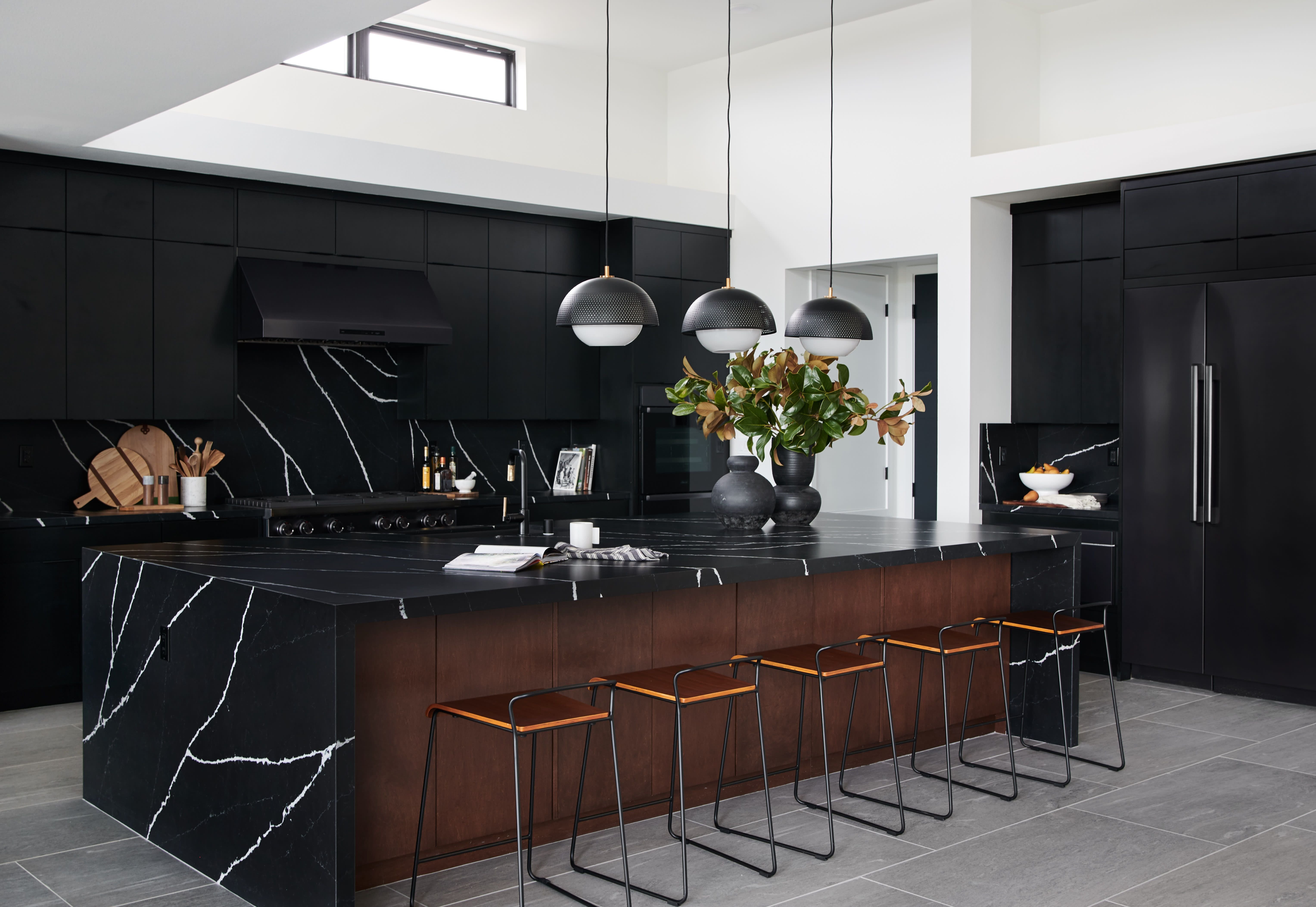 Интерьер кухни черный мрамор и дерево
