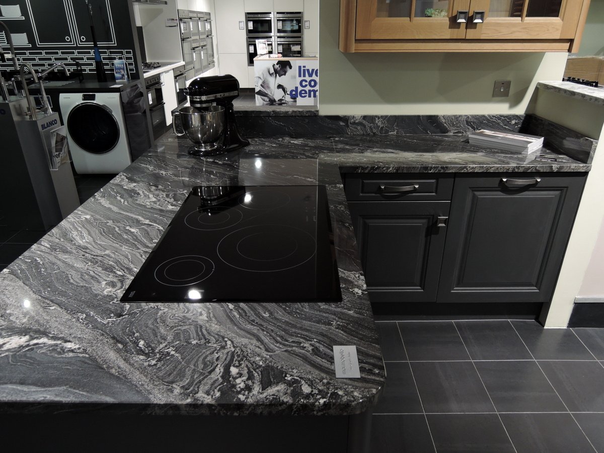 Кухня с черной столешницей и фартуком